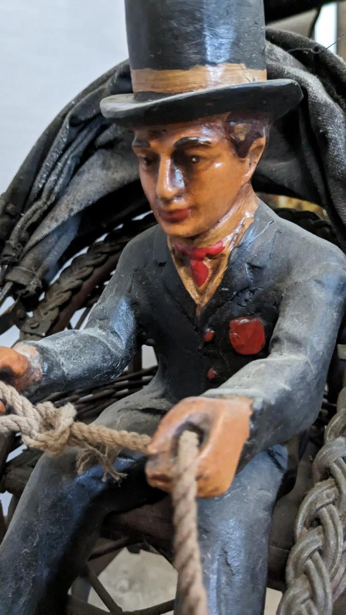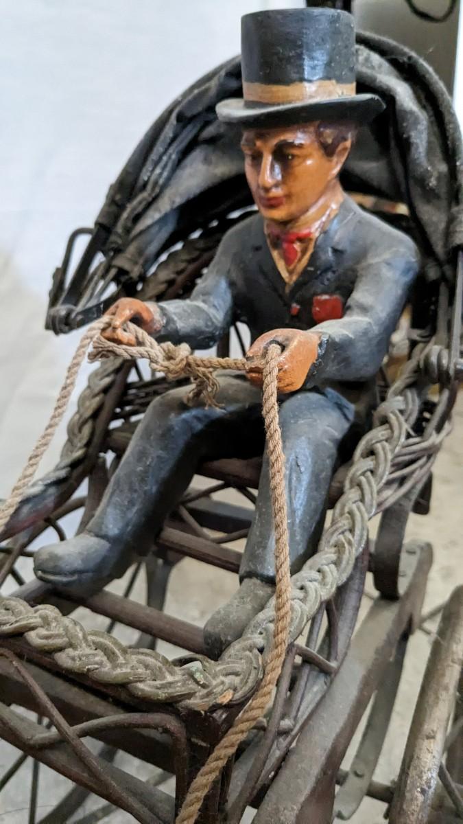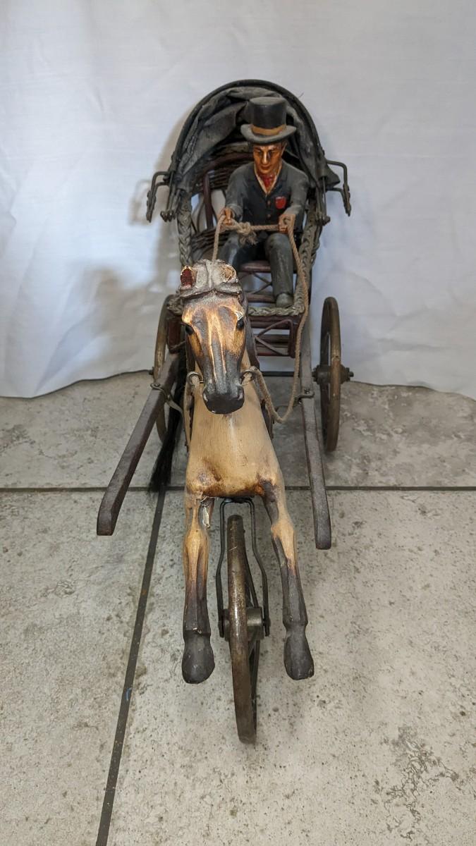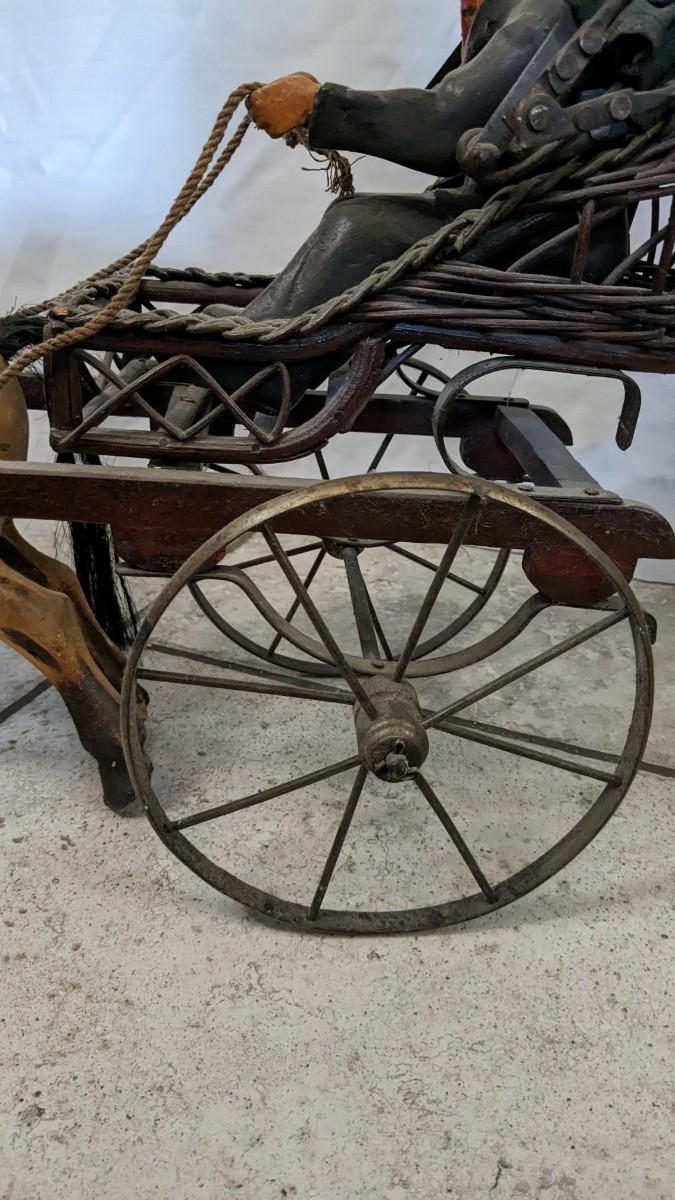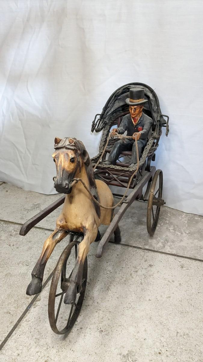 24"x 9.5"x17" tall. A stunning display piece handcrafted from wood, wicker, paper mache, and brass. horse tail features real hair. Front arm was previously broken and has been repaired, this is the only flaw noted. Extra handling fees will apply.