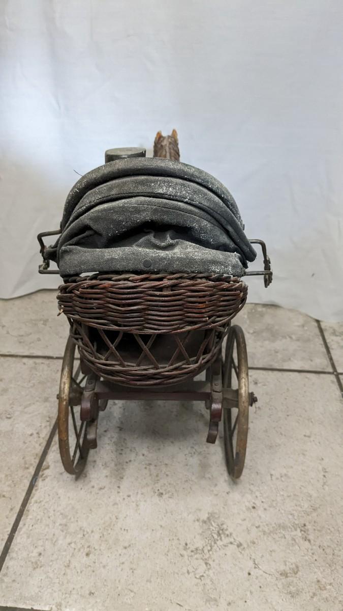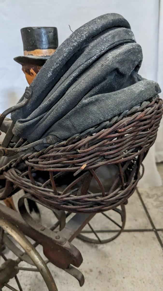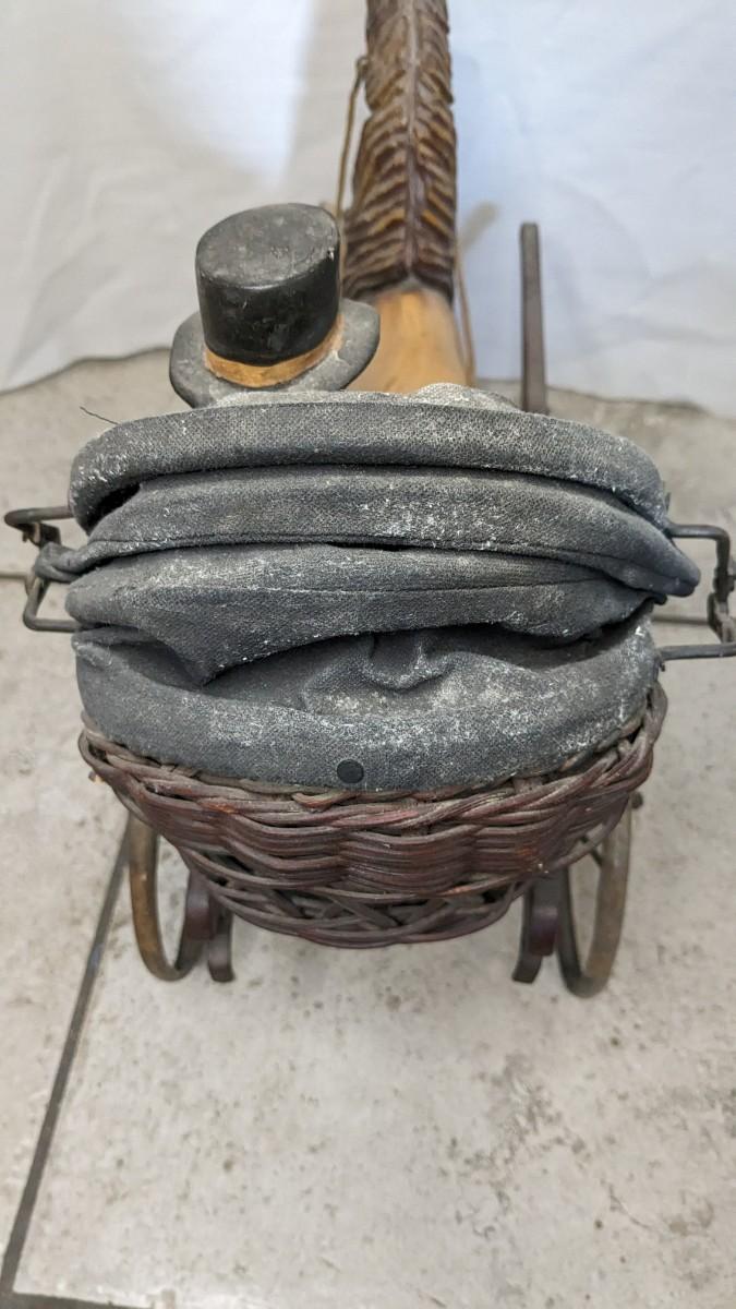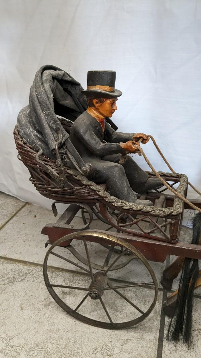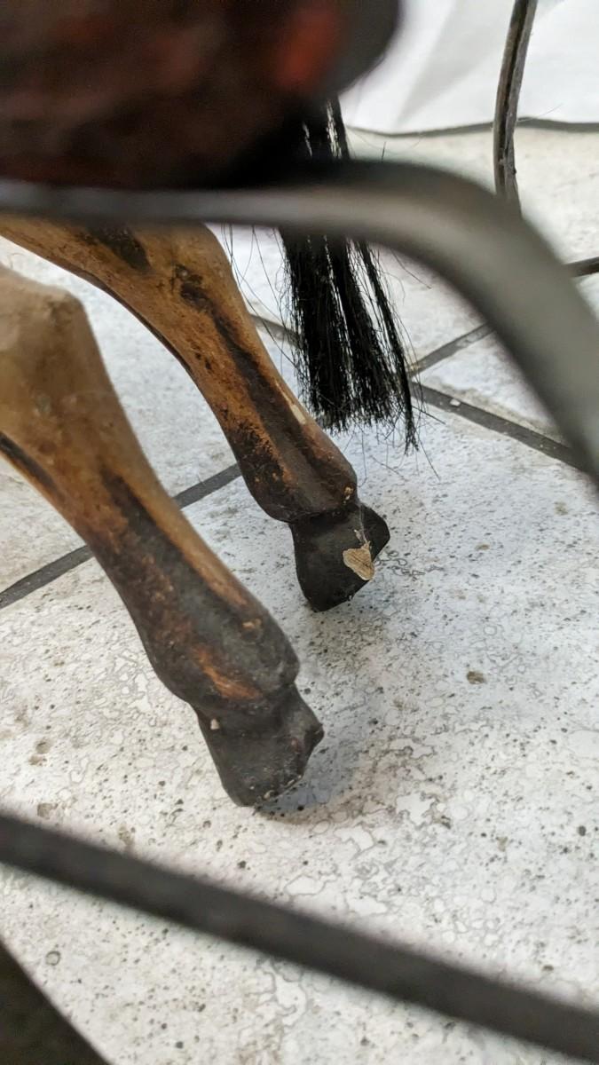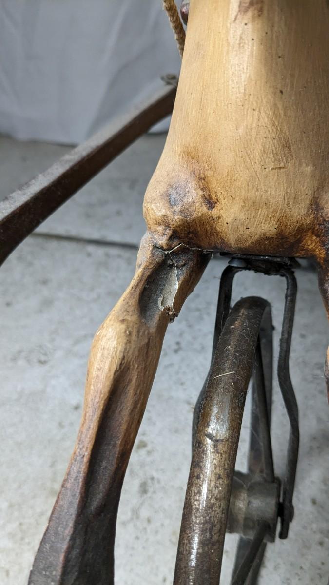 24"x 9.5"x17" tall. A stunning display piece handcrafted from wood, wicker, paper mache, and brass. horse tail features real hair. Front arm was previously broken and has been repaired, this is the only flaw noted. Extra handling fees will apply.
