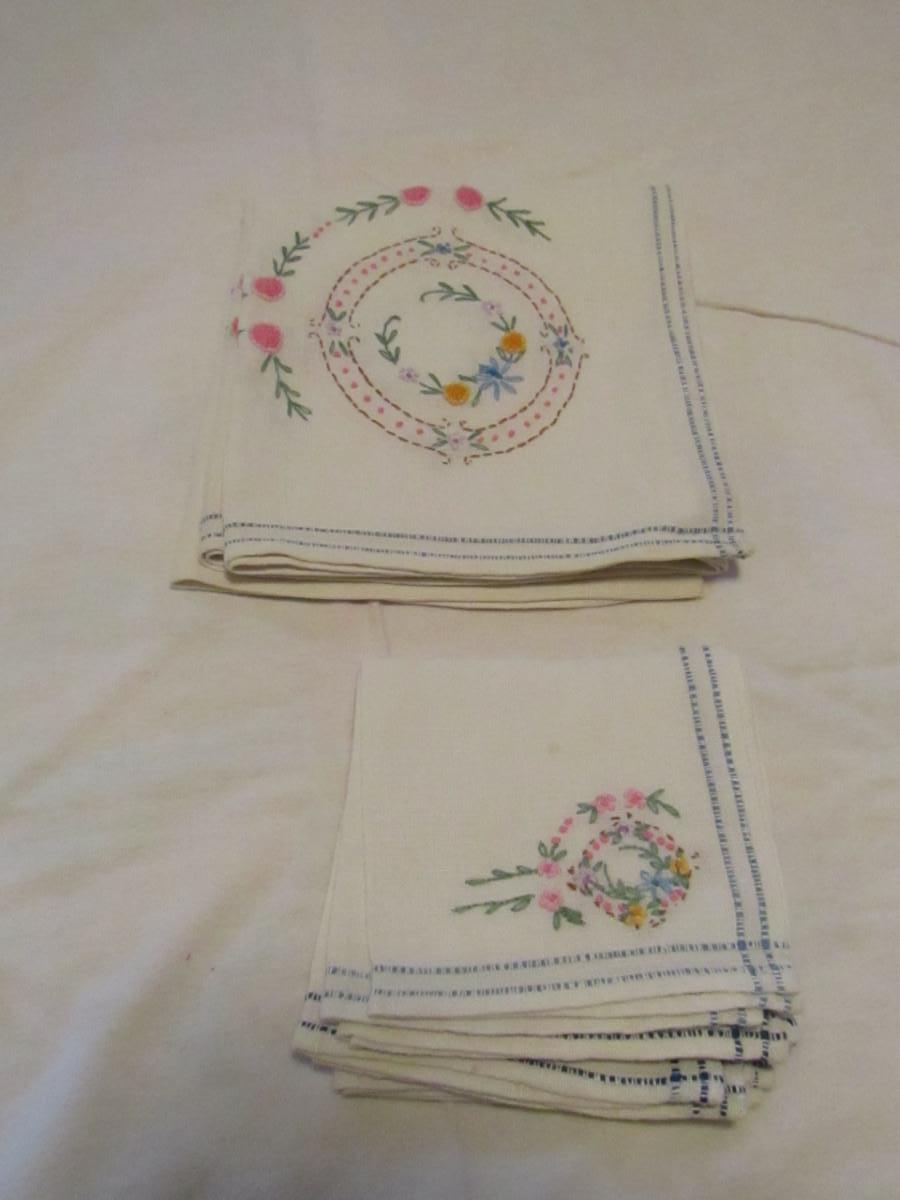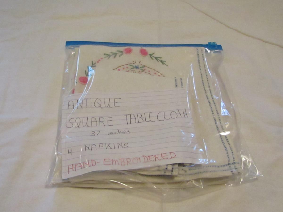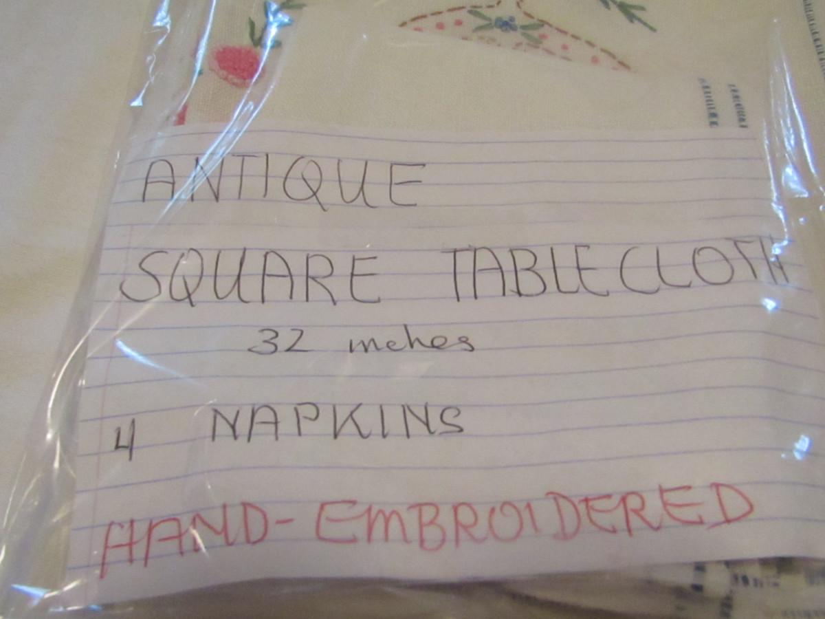 Antique Hand Embroidered Tablecloth and 4 Napkin Set- Approx 32" Square (#12)