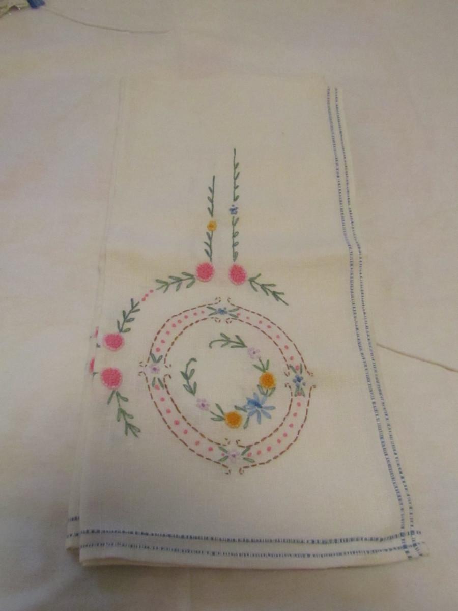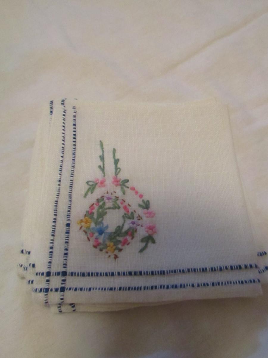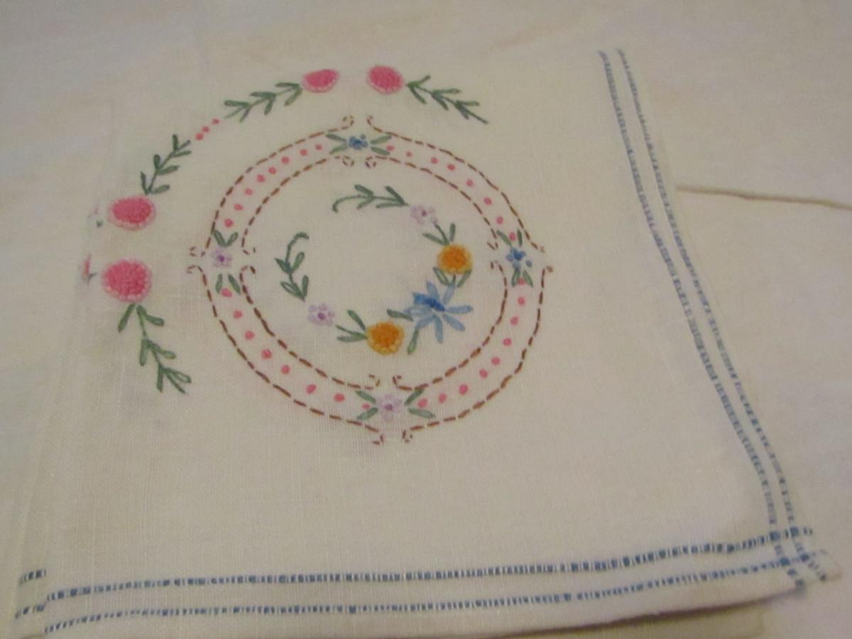 Antique Hand Embroidered Tablecloth and 4 Napkin Set- Approx 32" Square (#12)