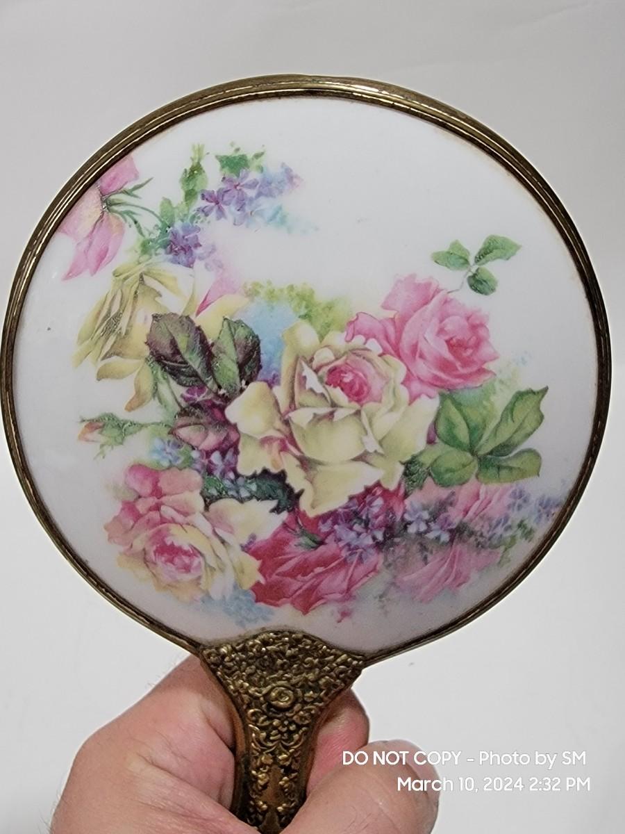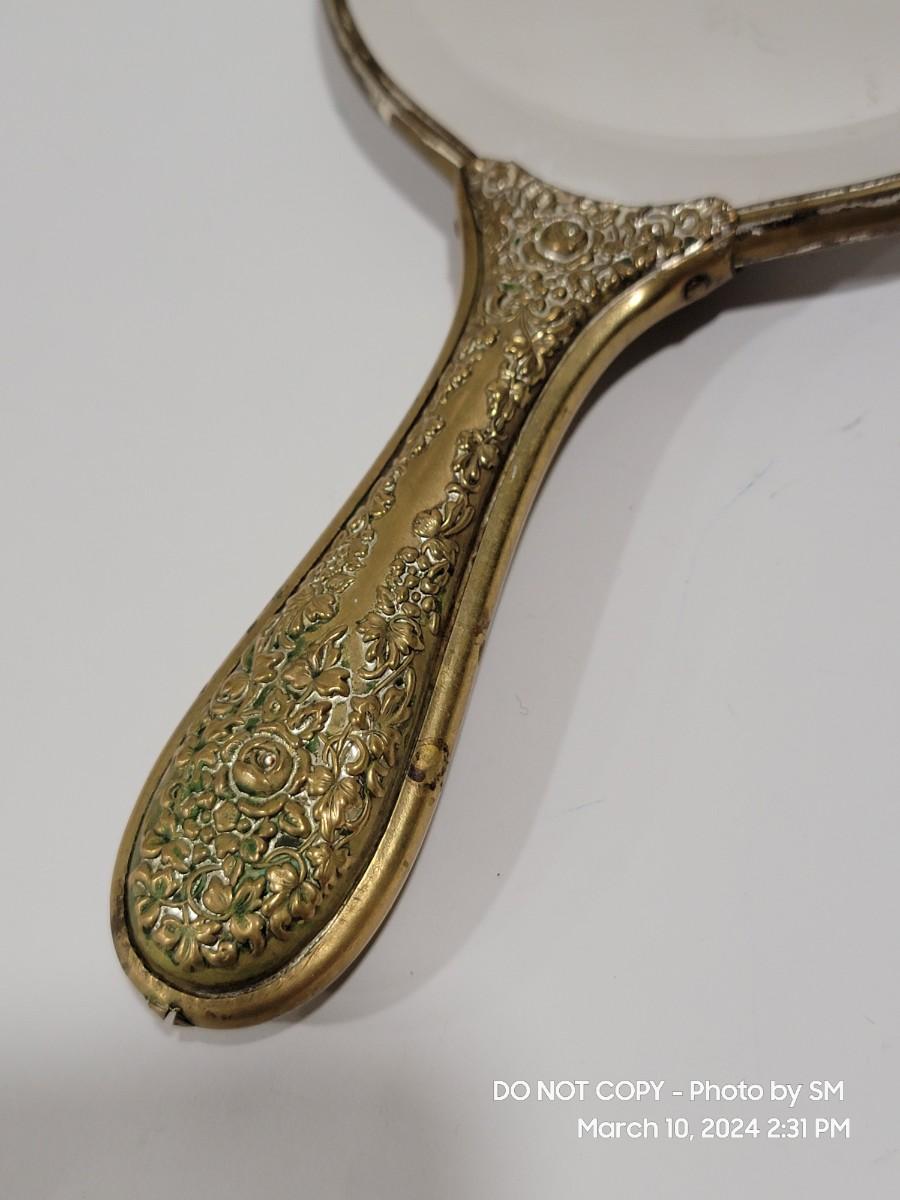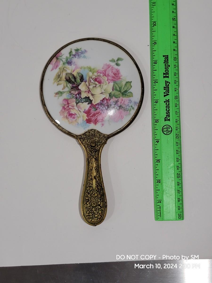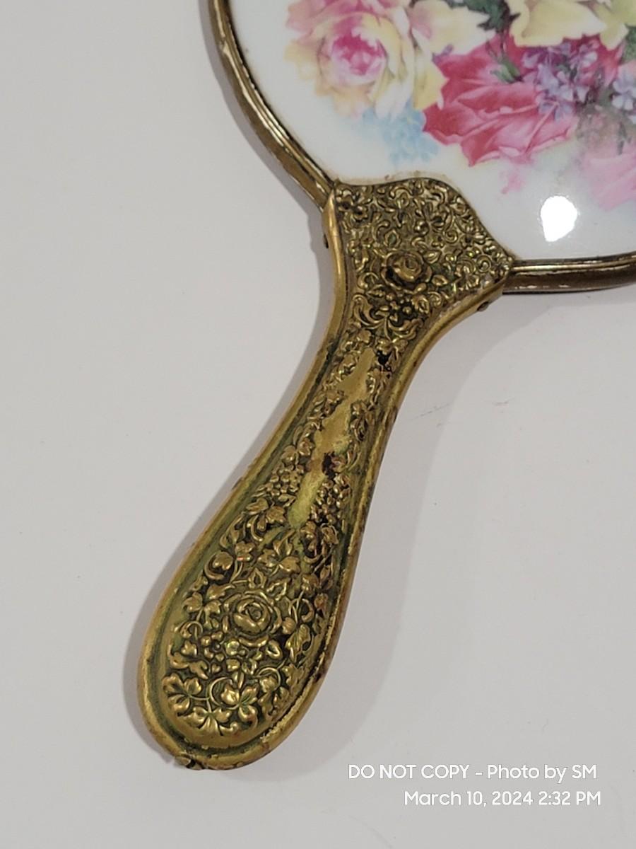 This is exquisite- brass color handle that is repousse / 3 dimensional floral, and rear of the mirror is porcelain with handpainted floral scene. Vanity hand held mirror, very romantic. The metal frame has a few dings or dents, and some of the brass color look rubbed off around the mirror and some silver coming through in other areas. What the actual base metal is - I am not sure. This came from France - is what I am told.