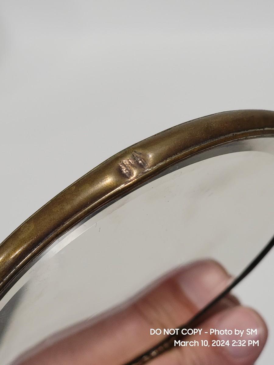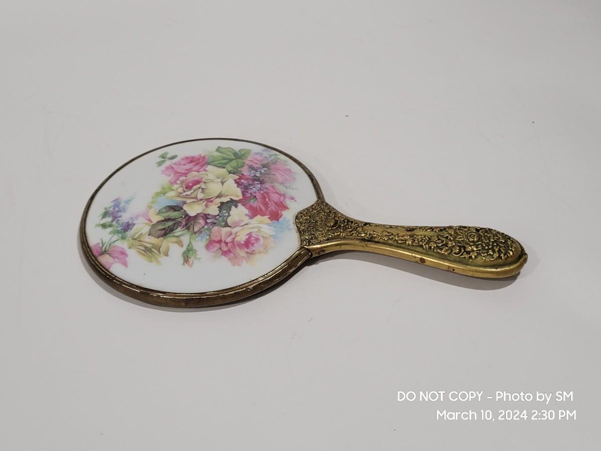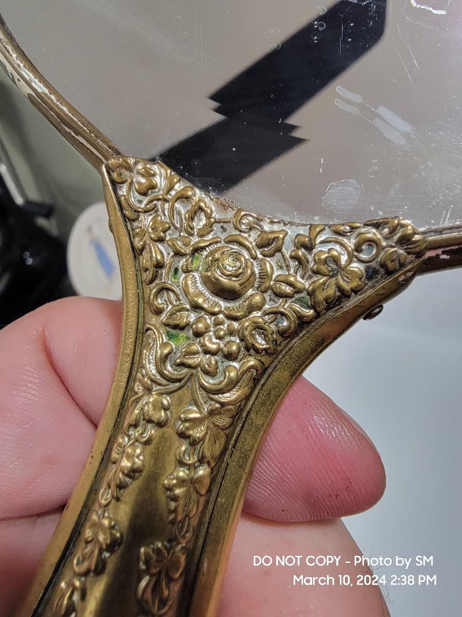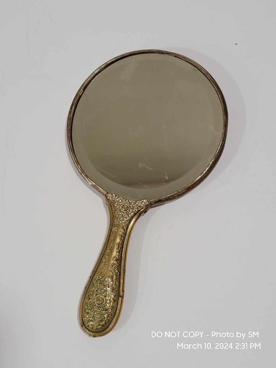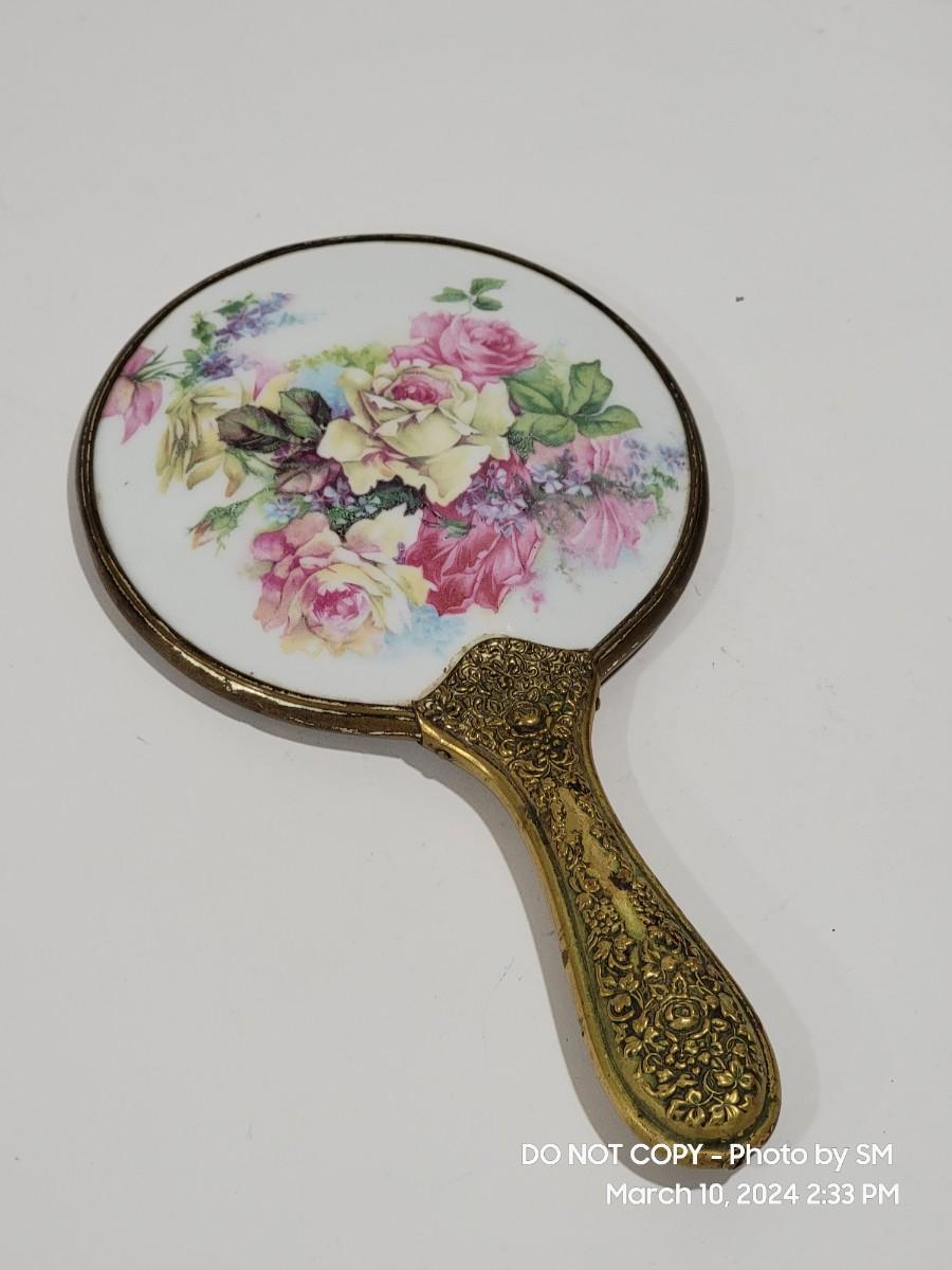 This is exquisite- brass color handle that is repousse / 3 dimensional floral, and rear of the mirror is porcelain with handpainted floral scene. Vanity hand held mirror, very romantic. The metal frame has a few dings or dents, and some of the brass color look rubbed off around the mirror and some silver coming through in other areas. What the actual base metal is - I am not sure. This came from France - is what I am told.