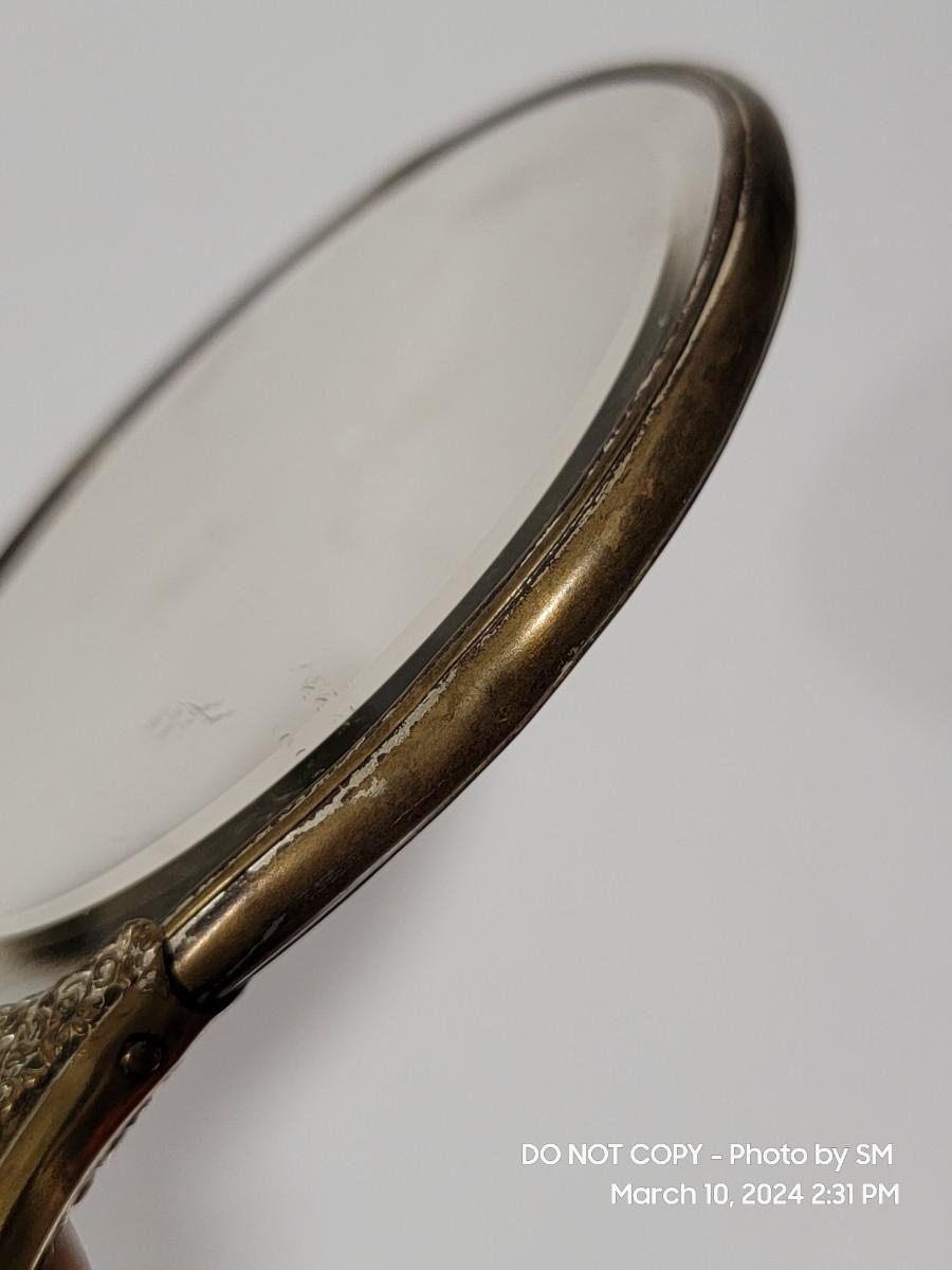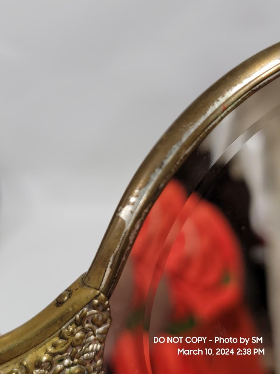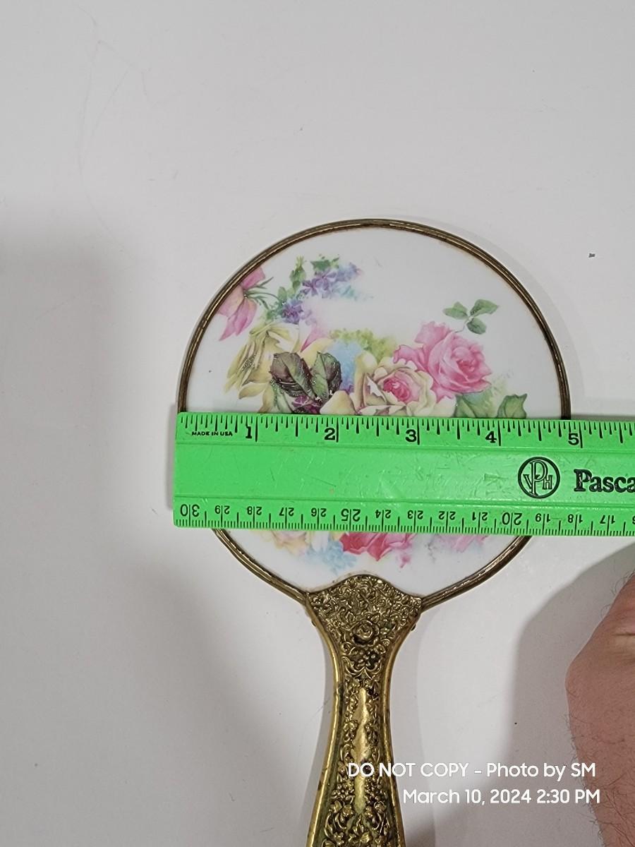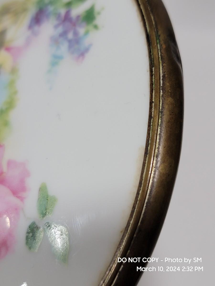 This is exquisite- brass color handle that is repousse / 3 dimensional floral, and rear of the mirror is porcelain with handpainted floral scene. Vanity hand held mirror, very romantic. The metal frame has a few dings or dents, and some of the brass color look rubbed off around the mirror and some silver coming through in other areas. What the actual base metal is - I am not sure. This came from France - is what I am told.