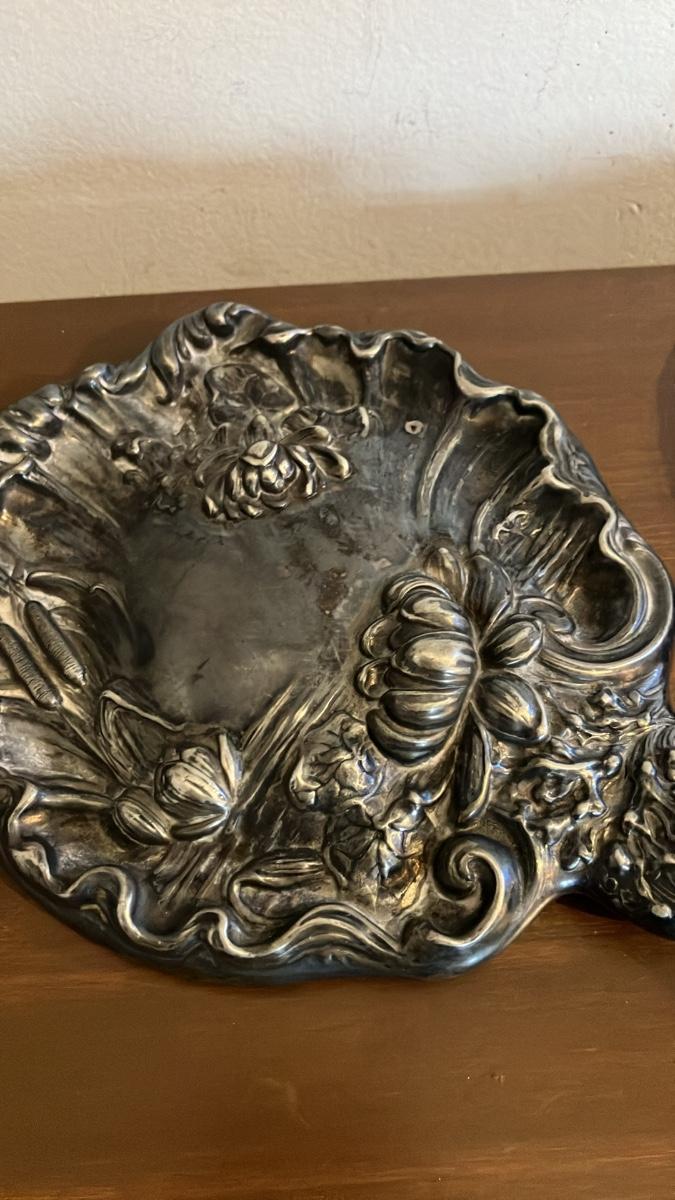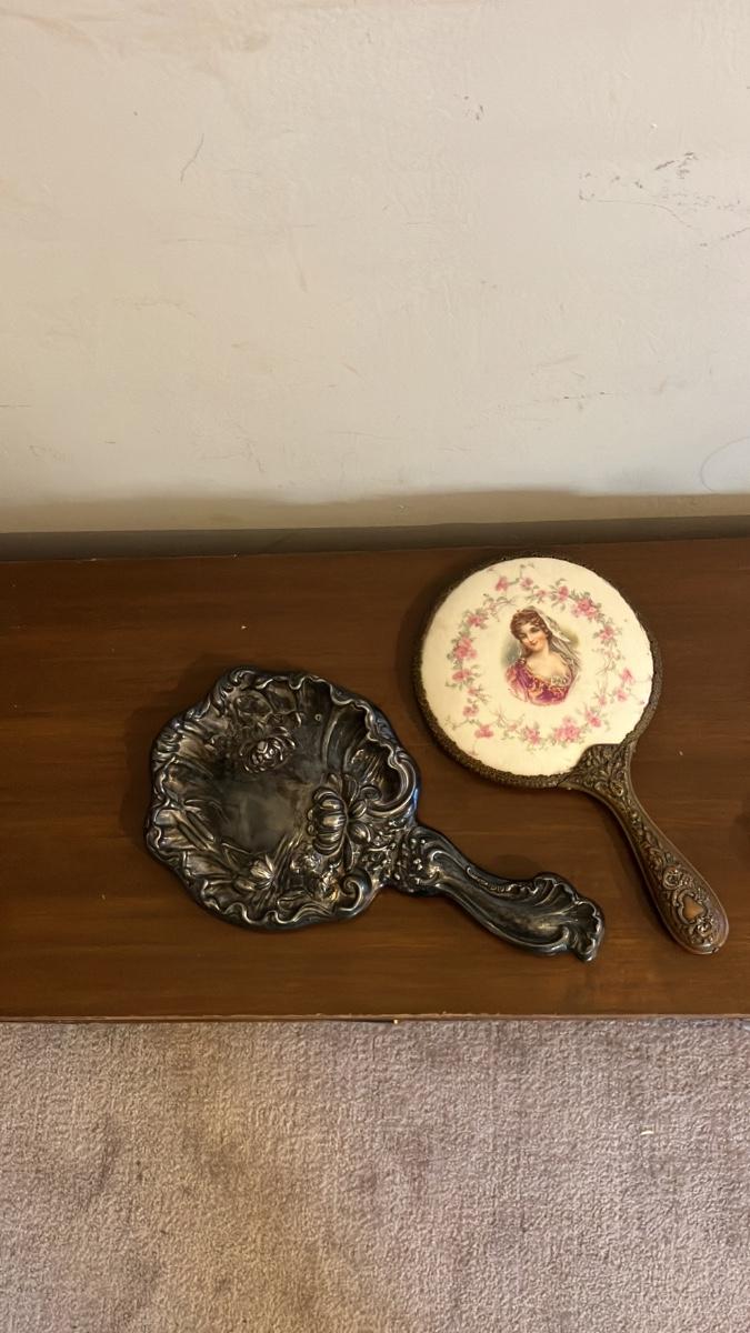 - Silver-Plated Mirror: Ornate floral design by Hope Silver Company, 10" long, with minor dings but good condition.