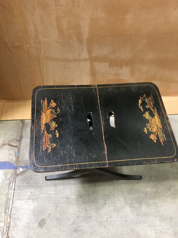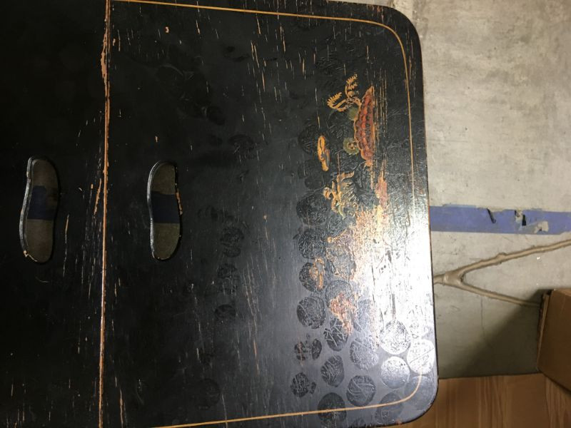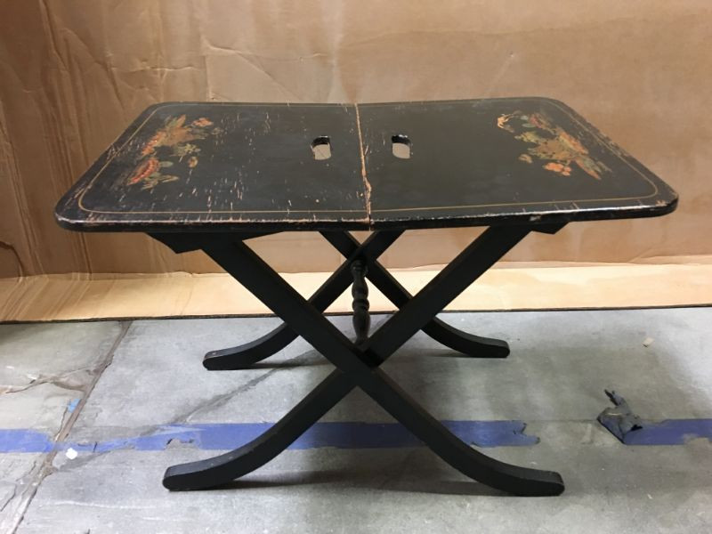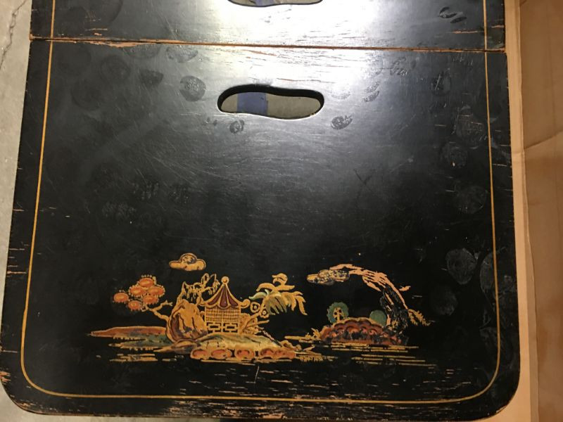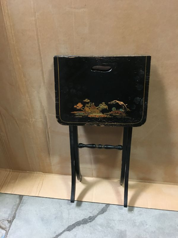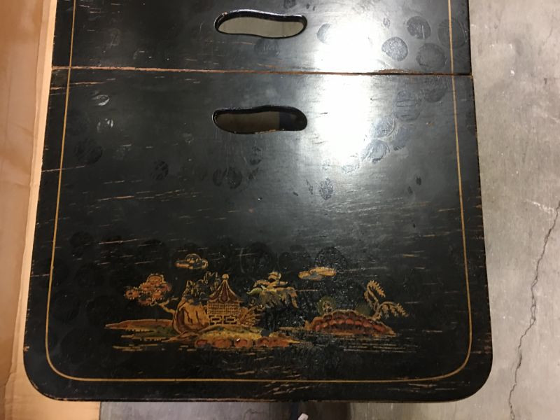 A BEAUTIFUL HAND PAINTED CHINESE FOLDING TABLE. ASIDE THE PAINTED AREAS, THE BLACK BACKGROUND SHOWS SIGN OF WEAR NORMAL FOR ITS AGE. PRACTICAL, COULD BE HIDDEN UNDER THE BED STILL, VERY USEFUL AND CLASSY. MEASURES 17" IN HEIGHT 23.5" IN WIDTH 18" IN DEPTH WHEN OPEN. FOLDED, MEASURES 31" IN HEIGHT AND ABOUT 5" IN DEPTH. NICE ANTIQUE PIECE.
