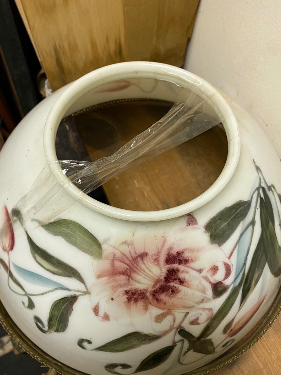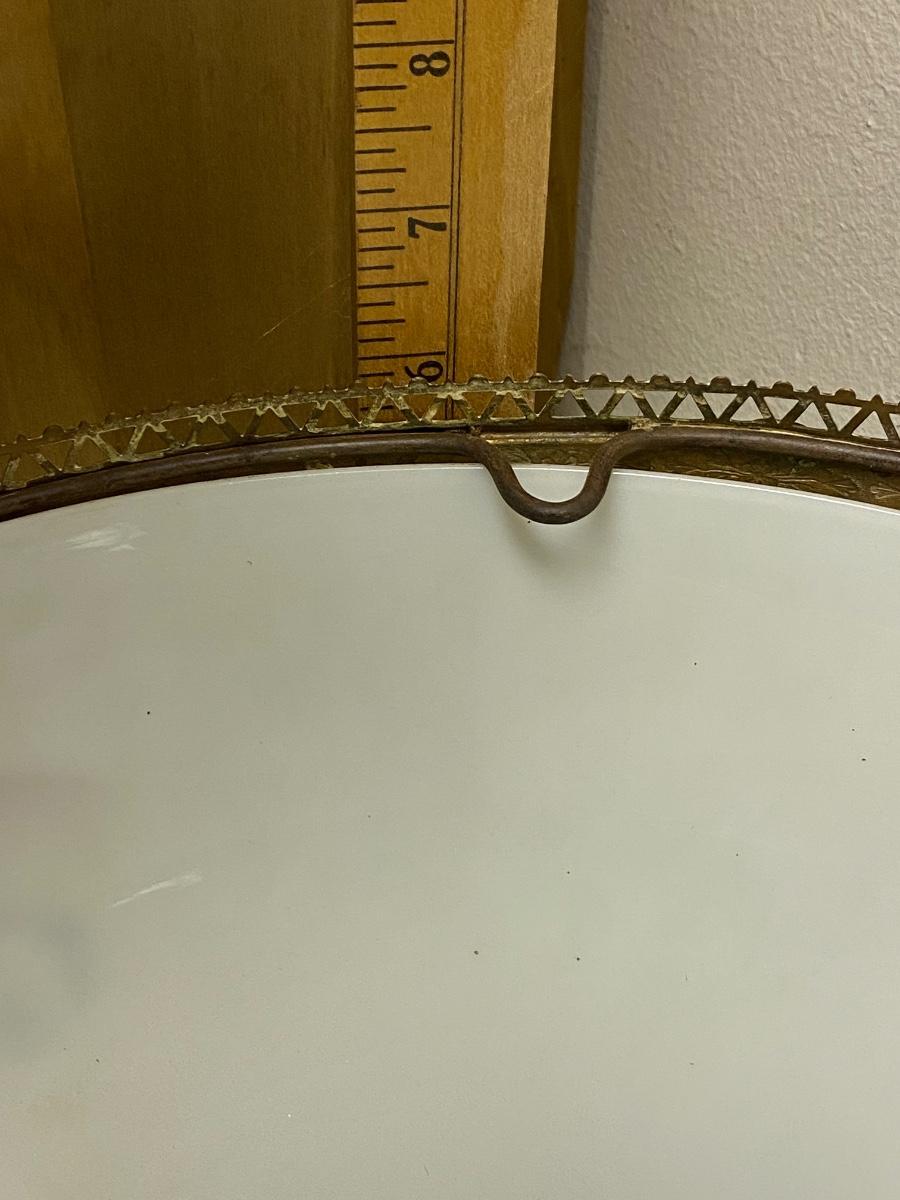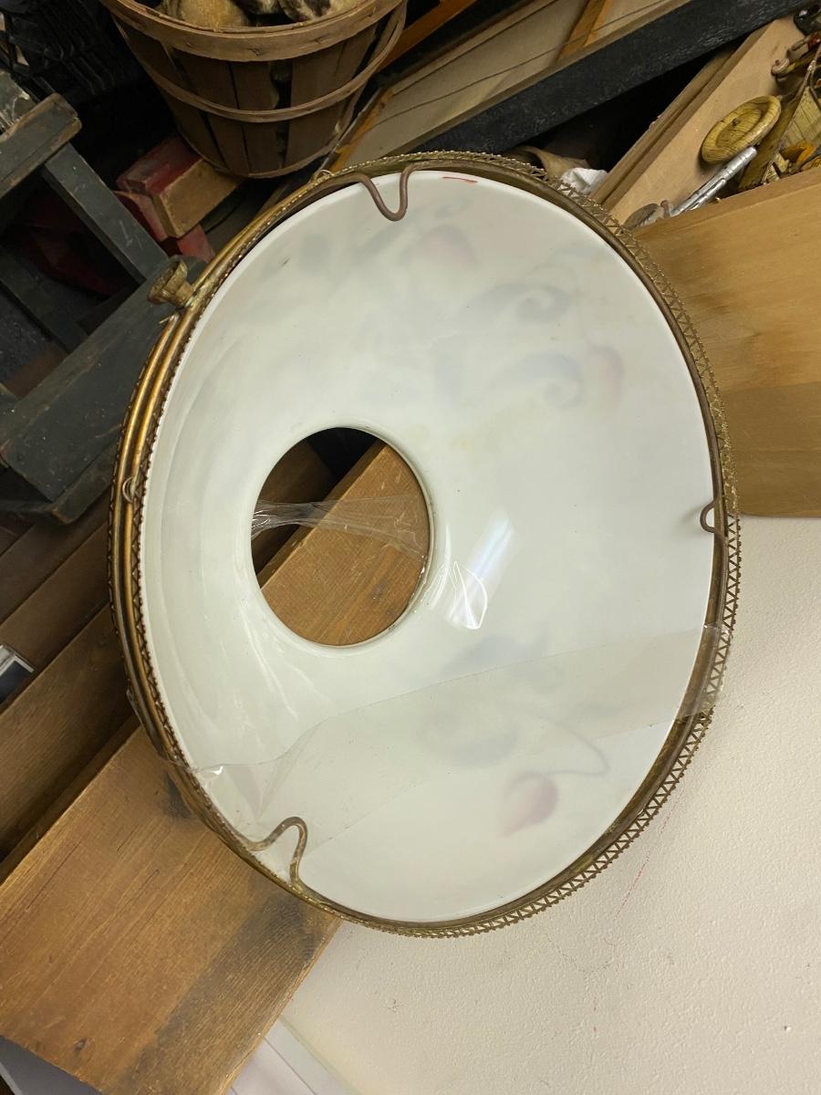 Antique milk glass lamp shade with brass trim. Can be used as a hanging light once re-wired.