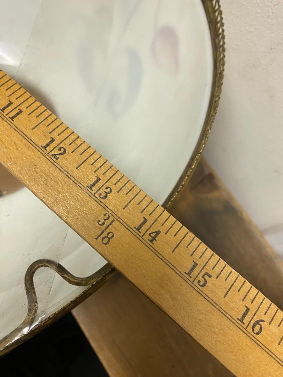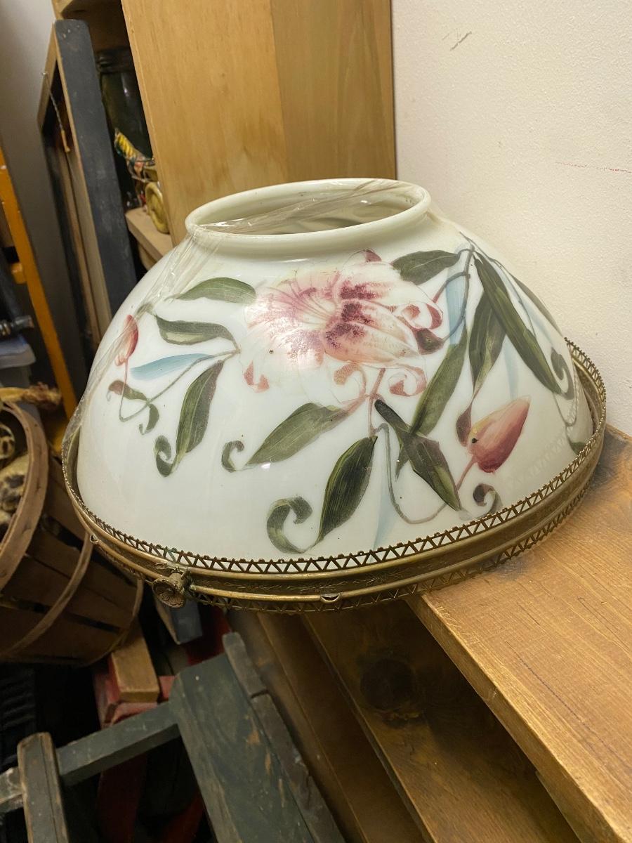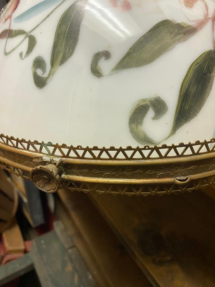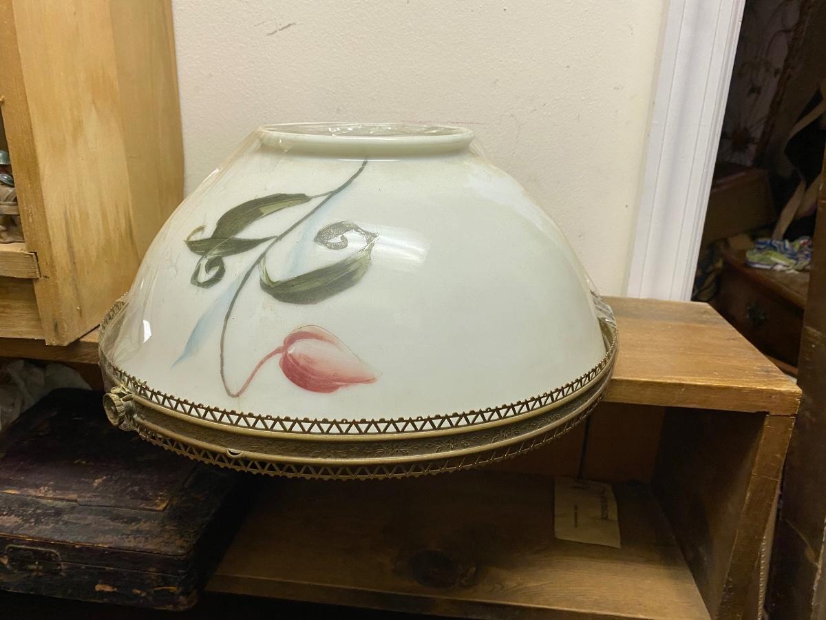 Antique milk glass lamp shade with brass trim. Can be used as a hanging light once re-wired.