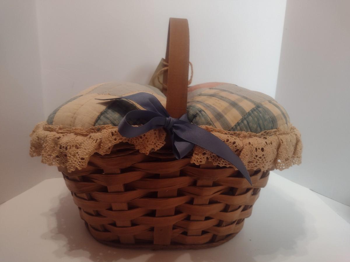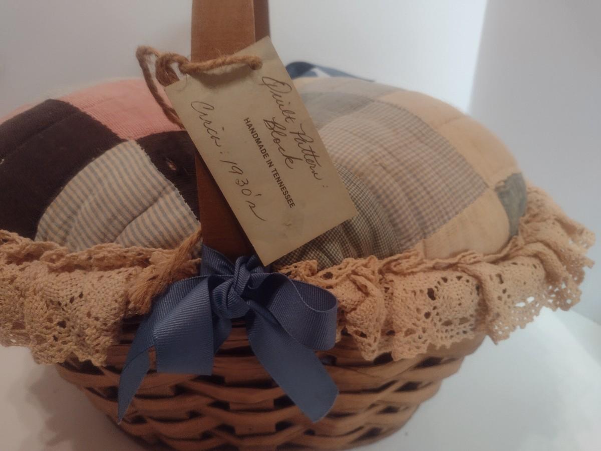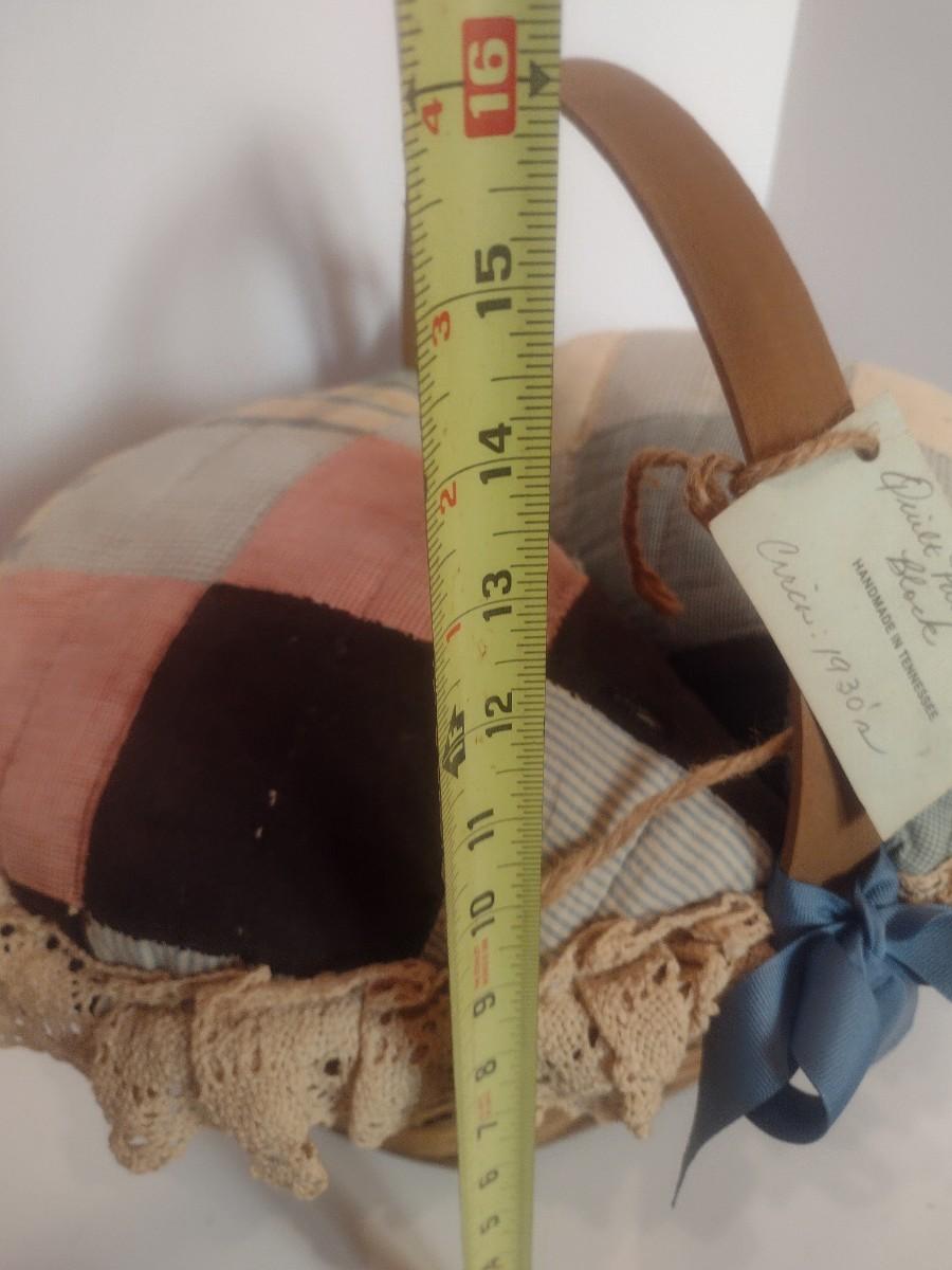 Antique Hand Sewn and Cut Quilt Top Splint Wood Sewing Basket