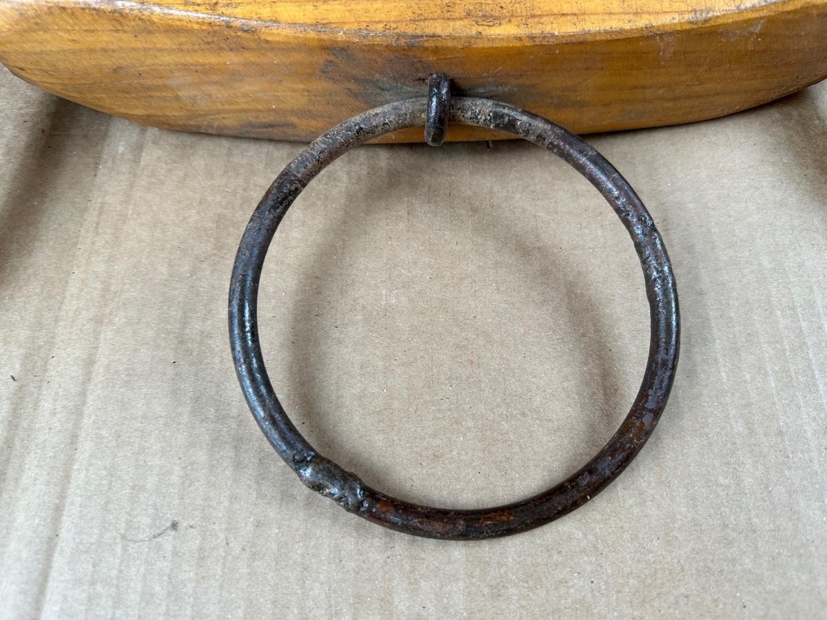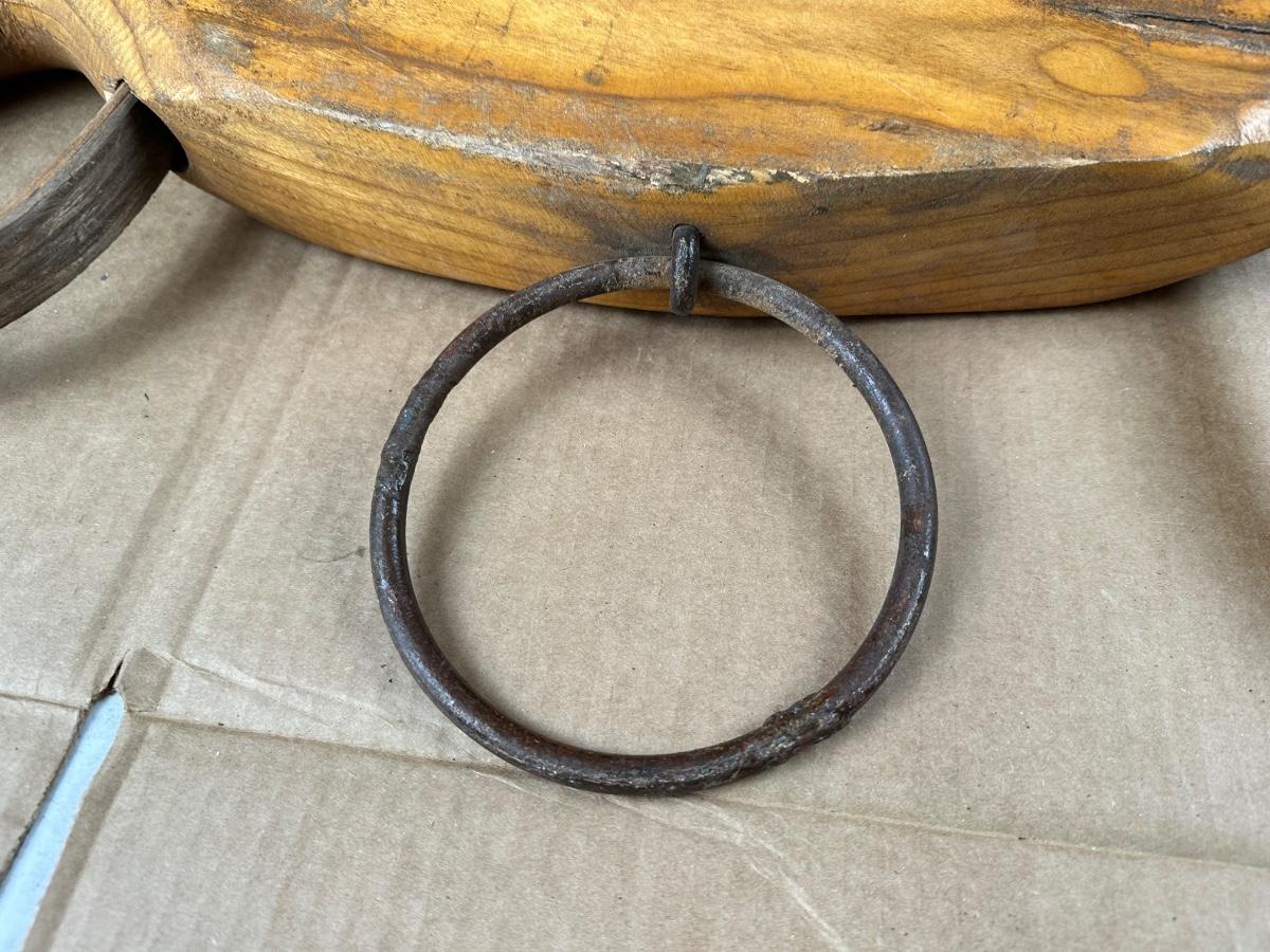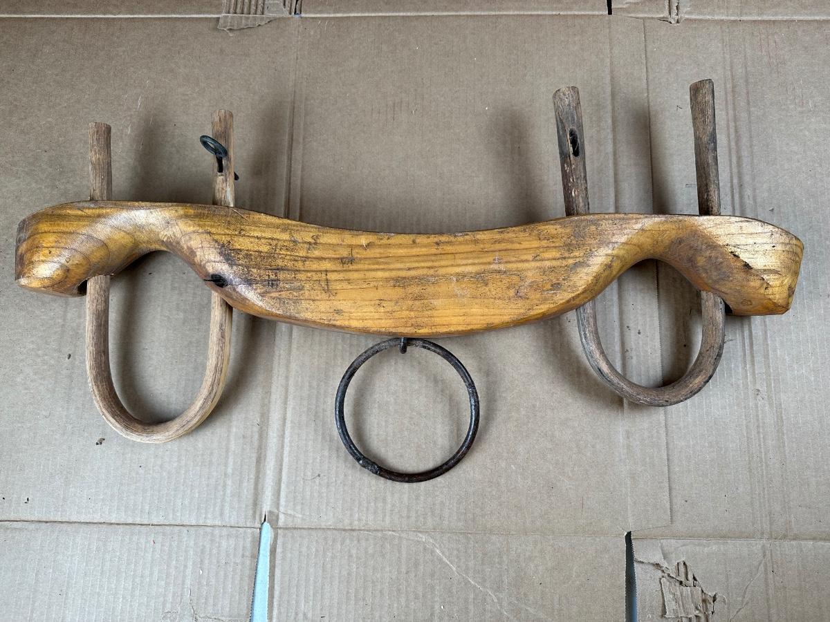Authentic antique wooden livestock yoke, hand-carved from a single solid piece of hardwood. Measures approximately 32 inches wide and features two bentwood bows with original wooden pegs and an iron center ring for chain or lead attachment.