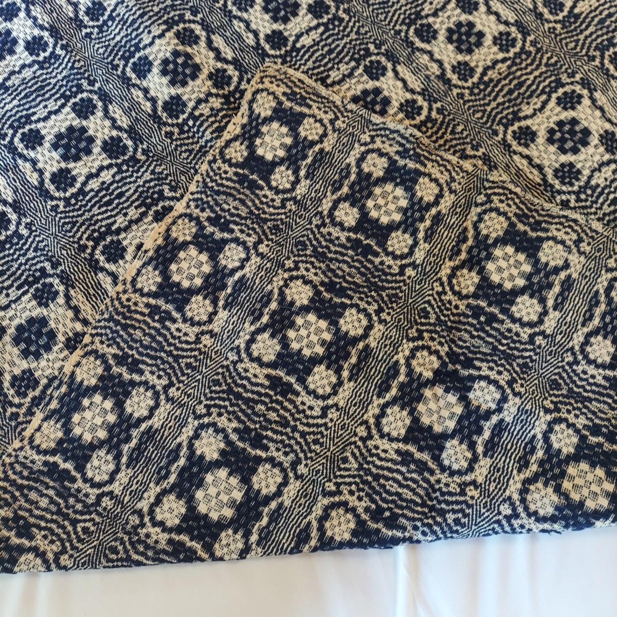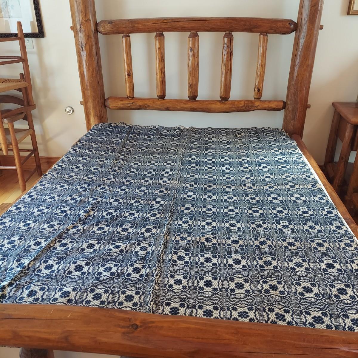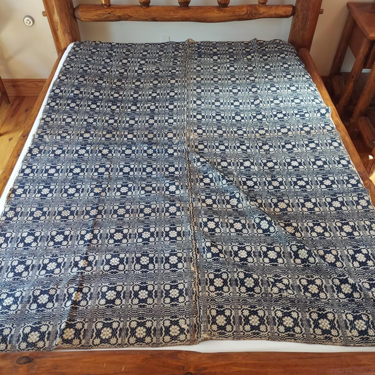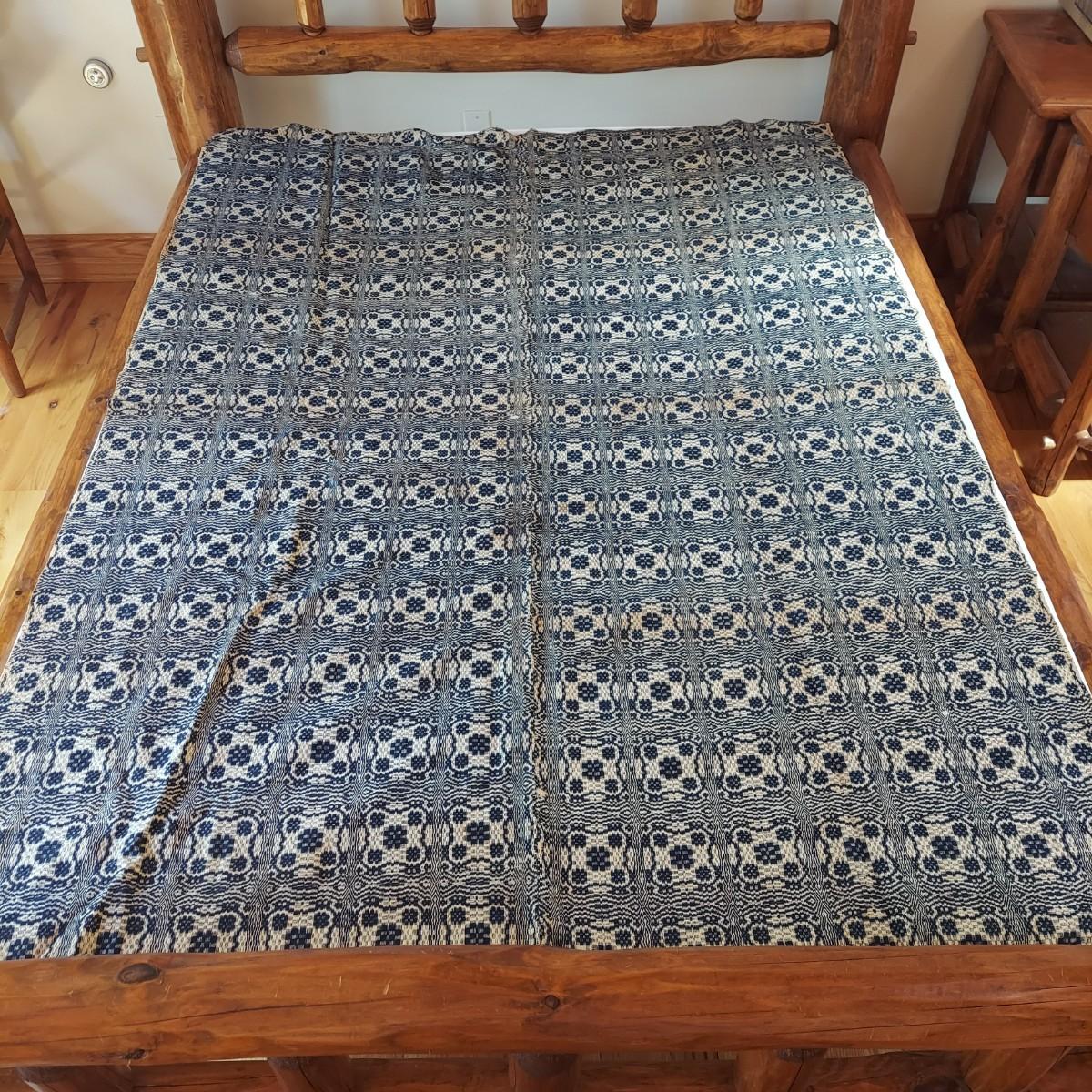 Handmade coverlet blanket that appears to be handmade and quite old. Seller states its from the late 1800s. It measures 59” x 80” and is shown on a queen bed. There is some discoloration along the lines of where it was folded. Please see photos for details. Shipping available