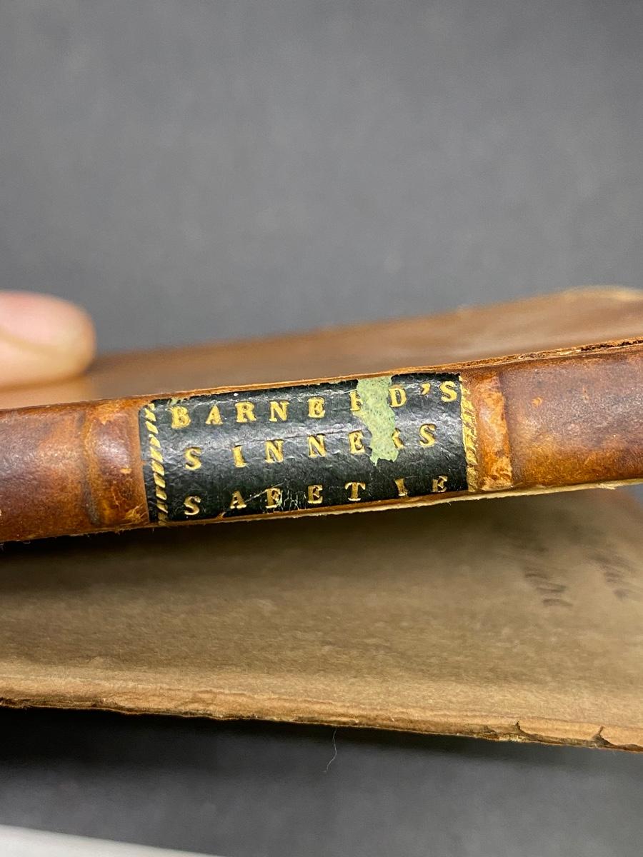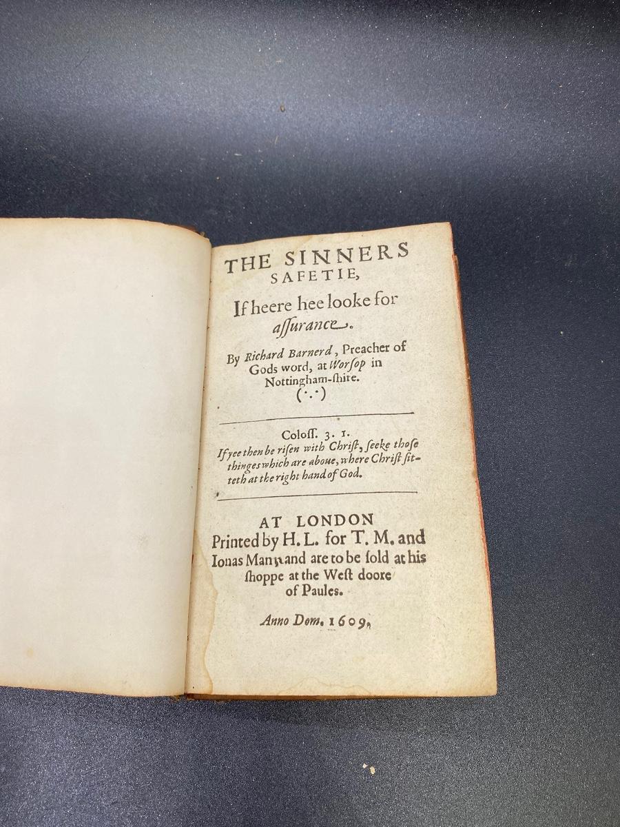 Antique hardcover book on early religion. The Sinners Safetie. Date inside is 1609. Has signs of age, cover has come apart. A previous owner signed there name inside and placed a label inside, dated 1853.