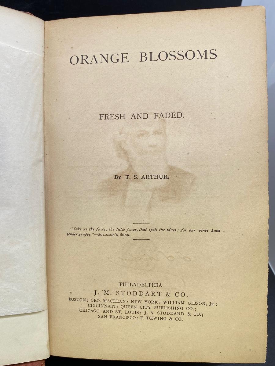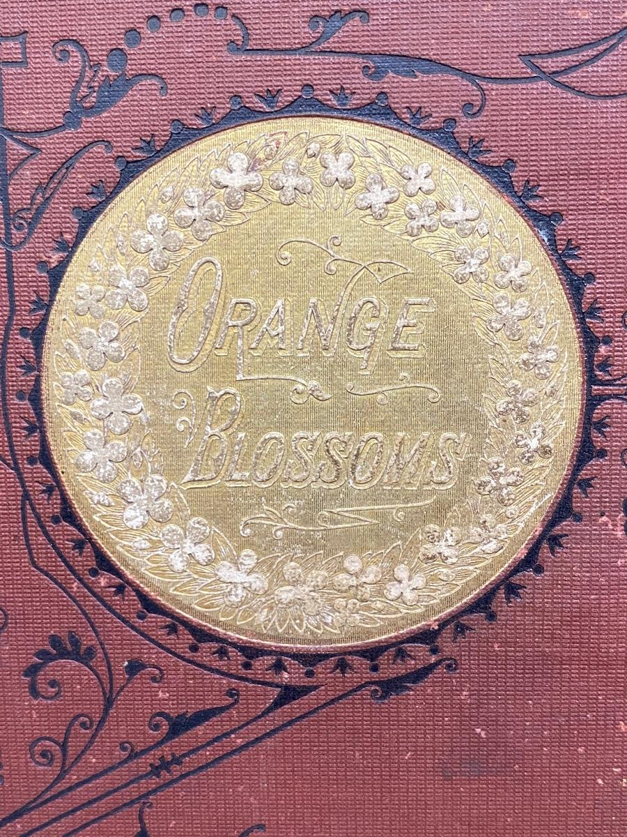 Antique hardcover book by T. S. Arthur titled Orange Blossoms. Dated 1871. Good antique condition, light wear & discolor from age.