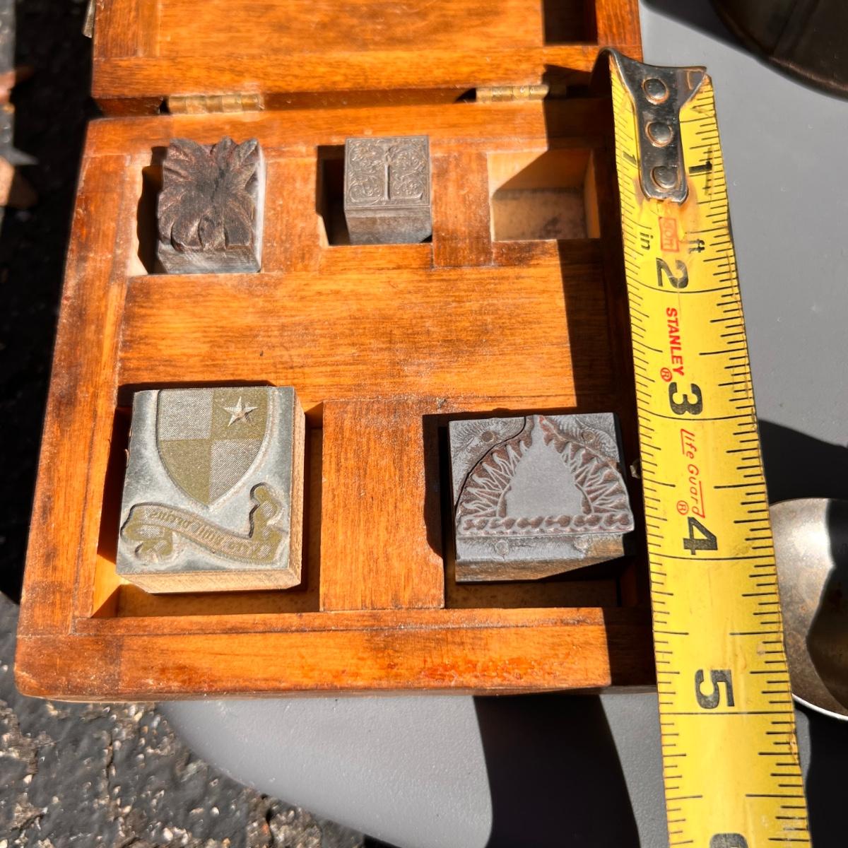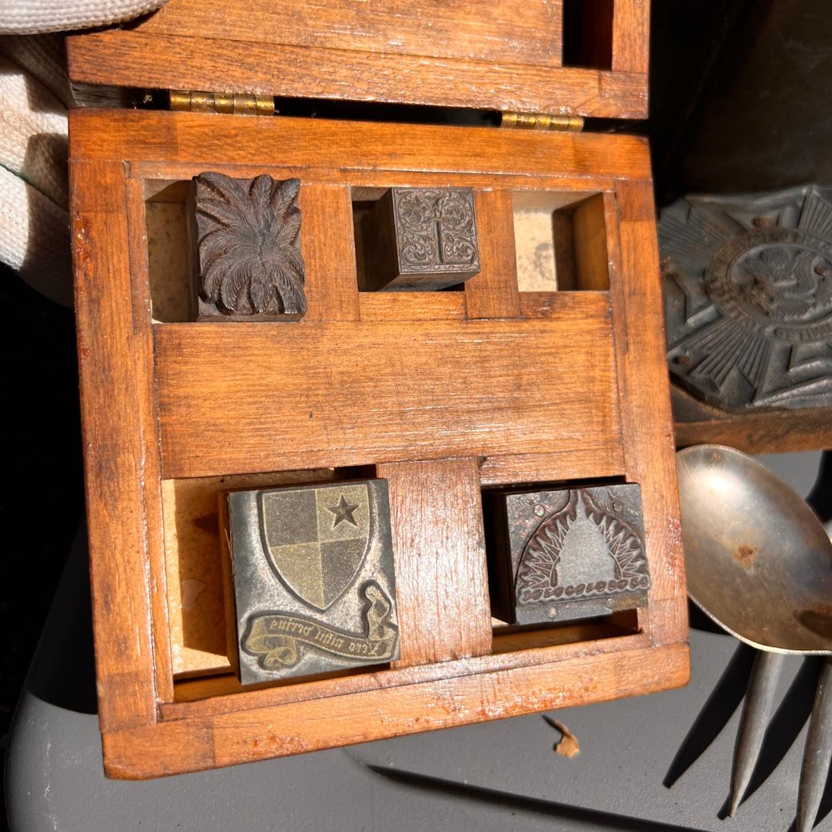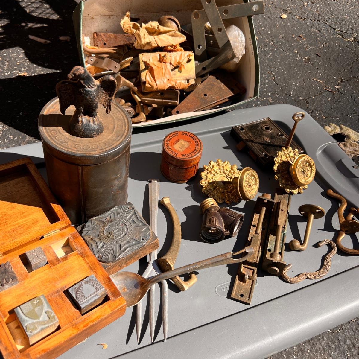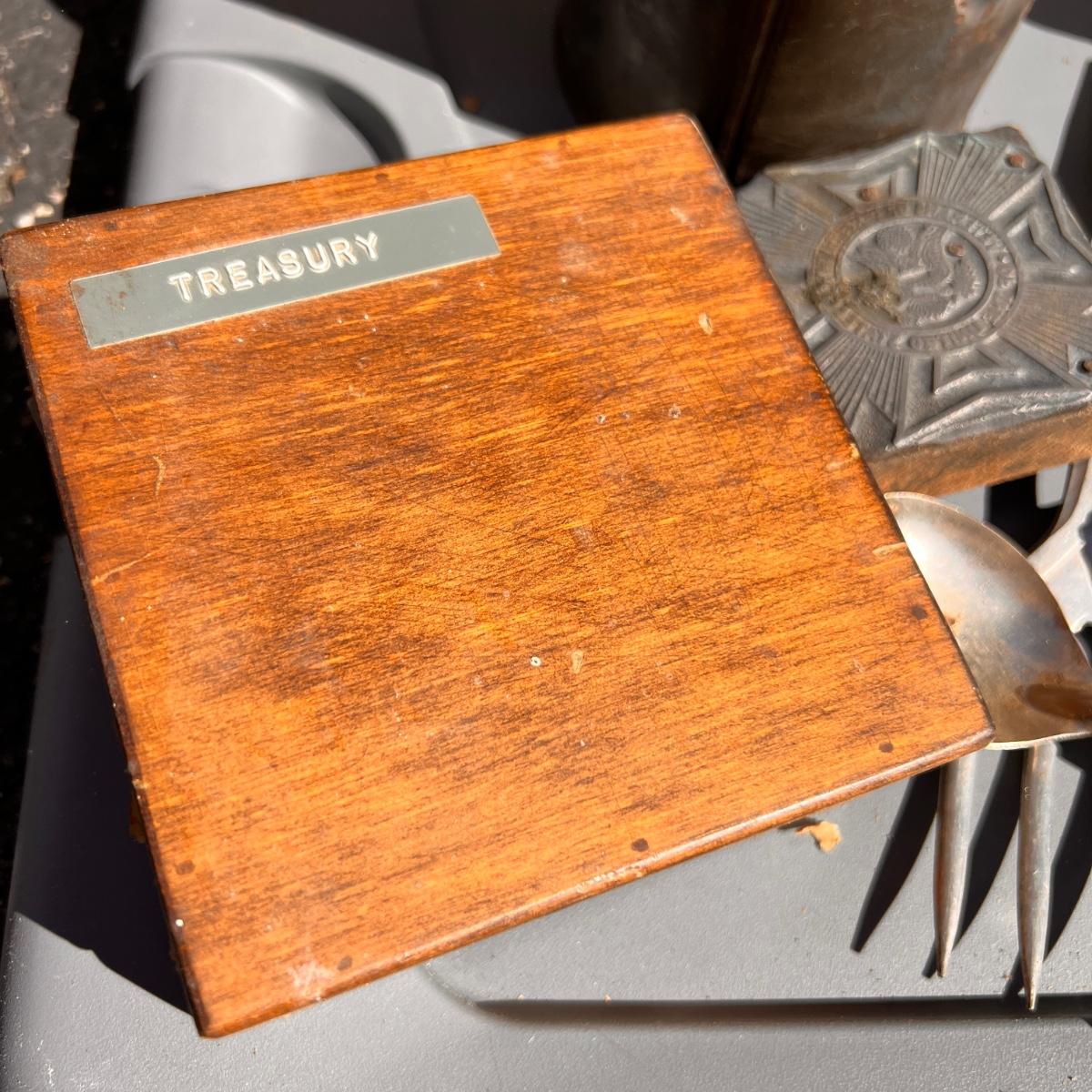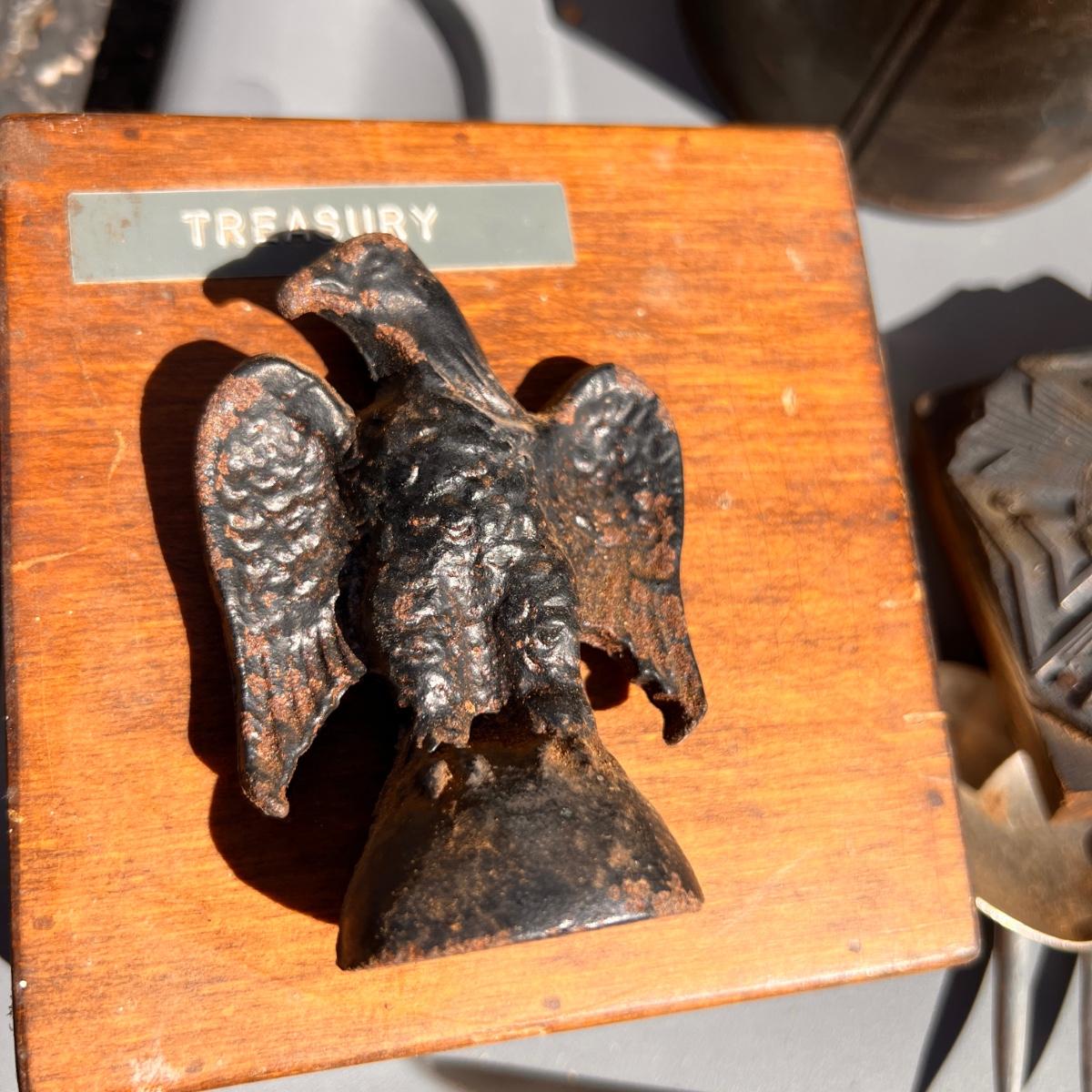 Wooden box with label Treasury containing 4 wood metal clock stamps, 1 large block stamp, cast iron eagle, antique tins, antique lock with skeleton key works, brass hooks, and more.