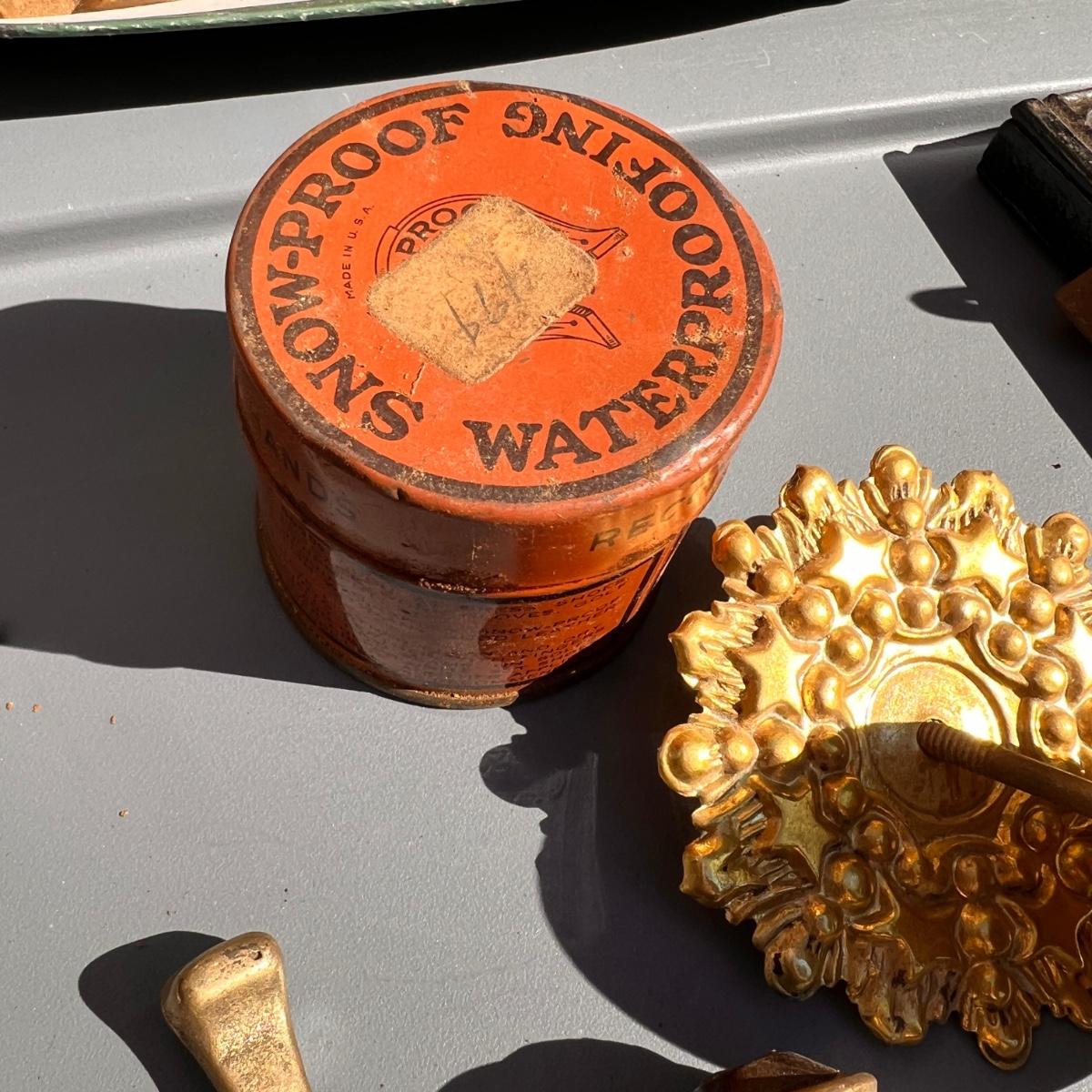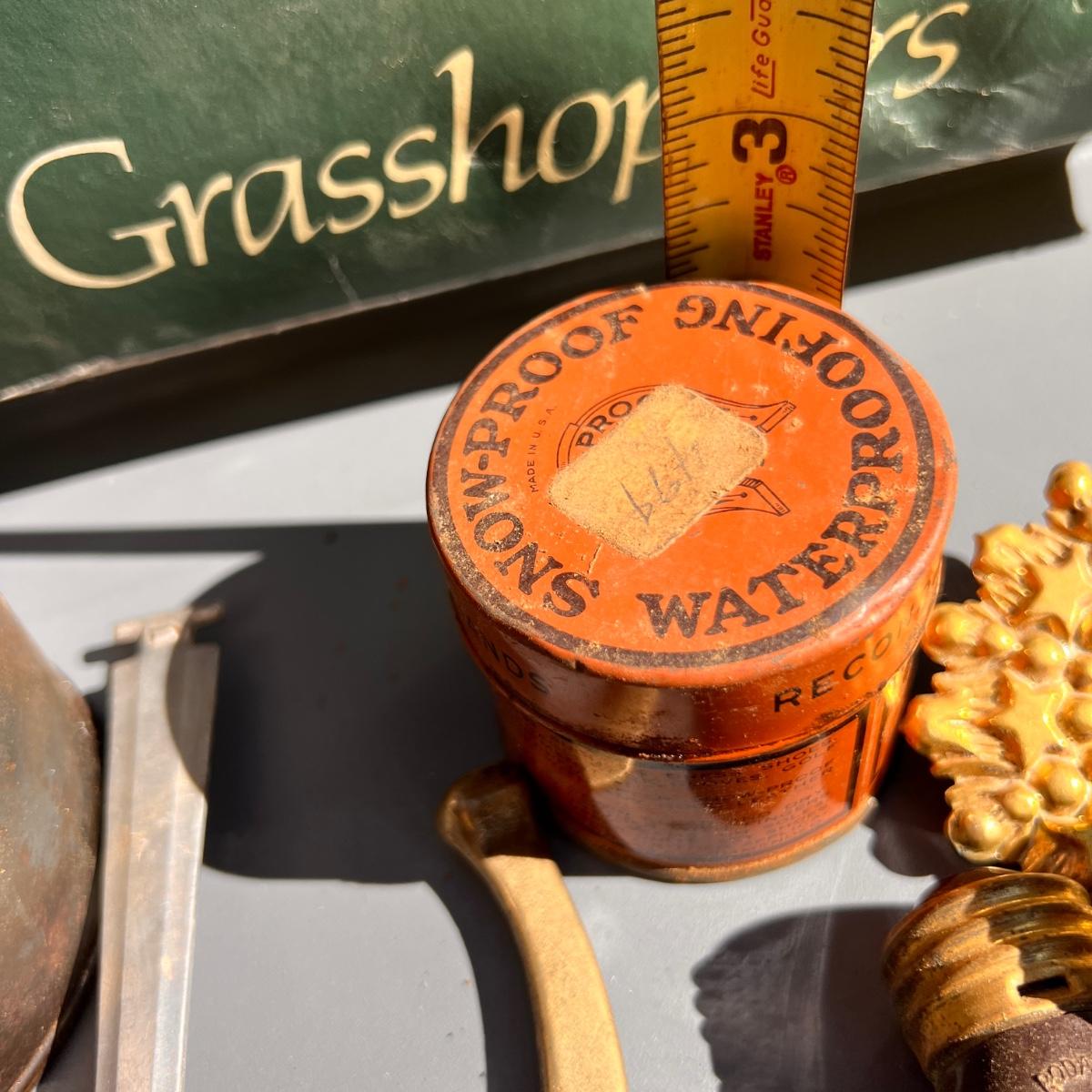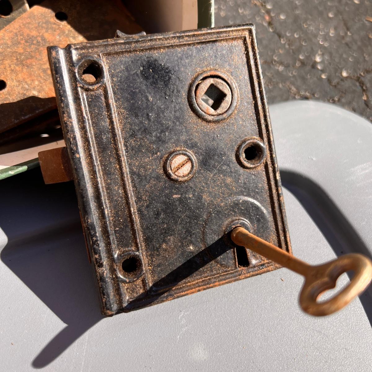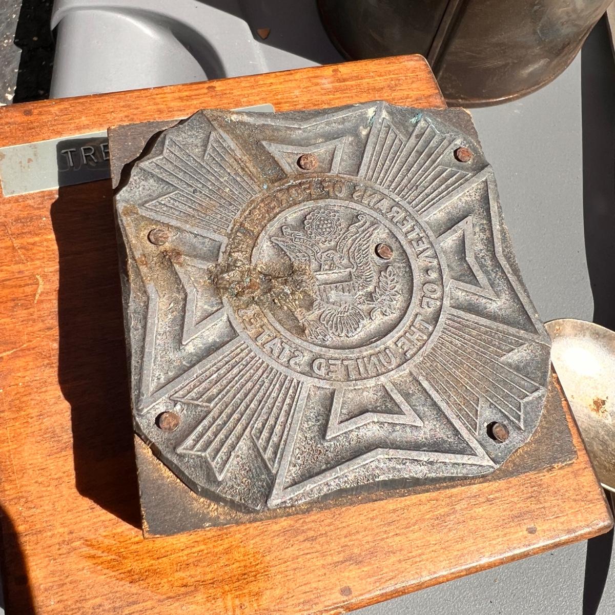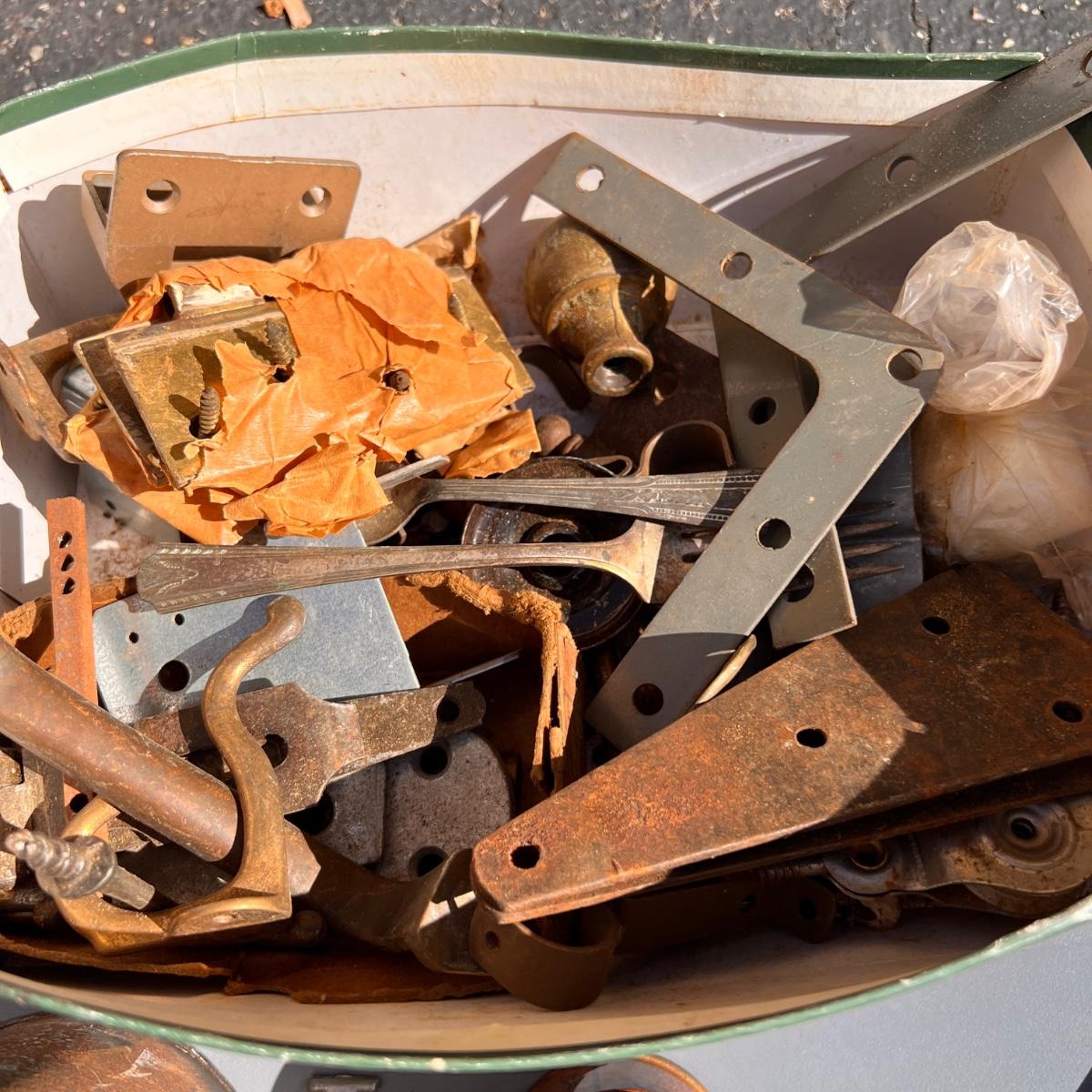 Wooden box with label Treasury containing 4 wood metal clock stamps, 1 large block stamp, cast iron eagle, antique tins, antique lock with skeleton key works, brass hooks, and more.