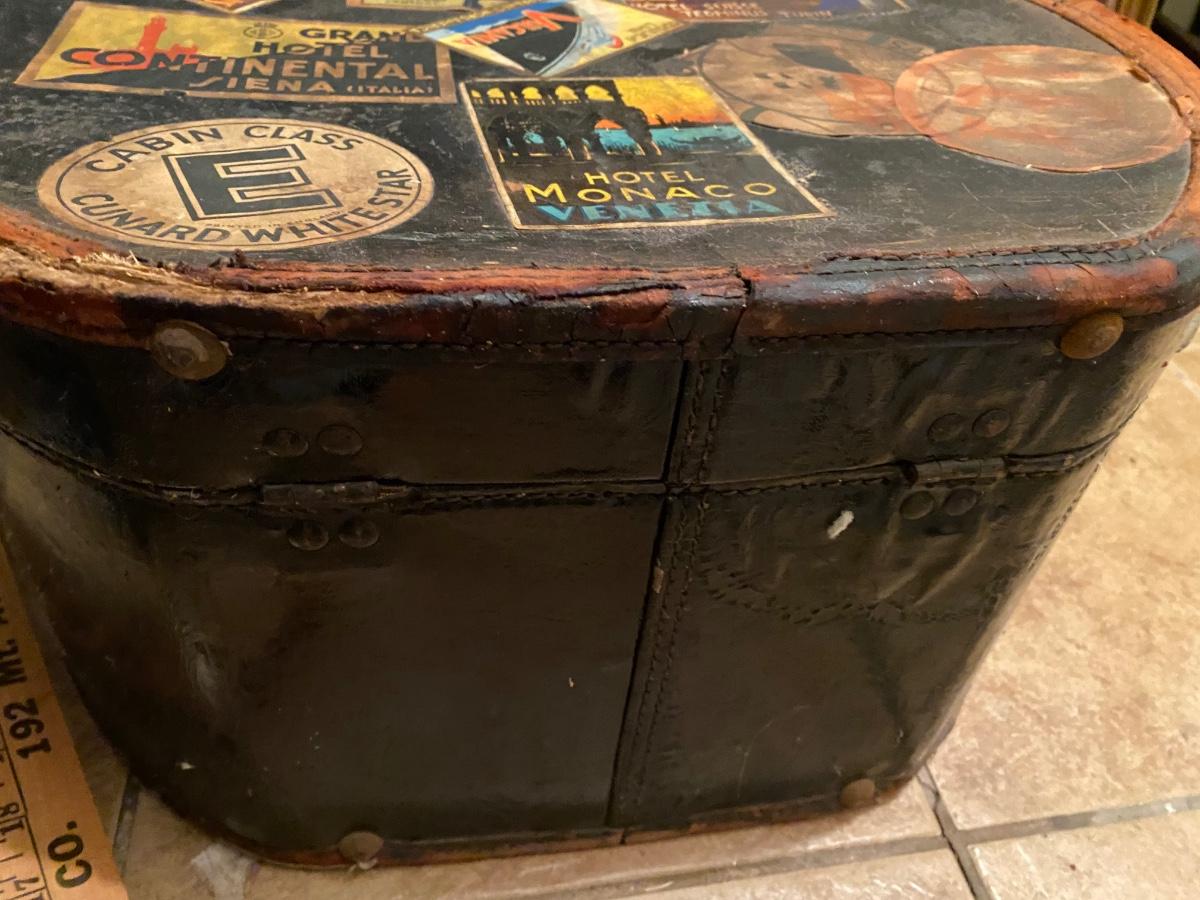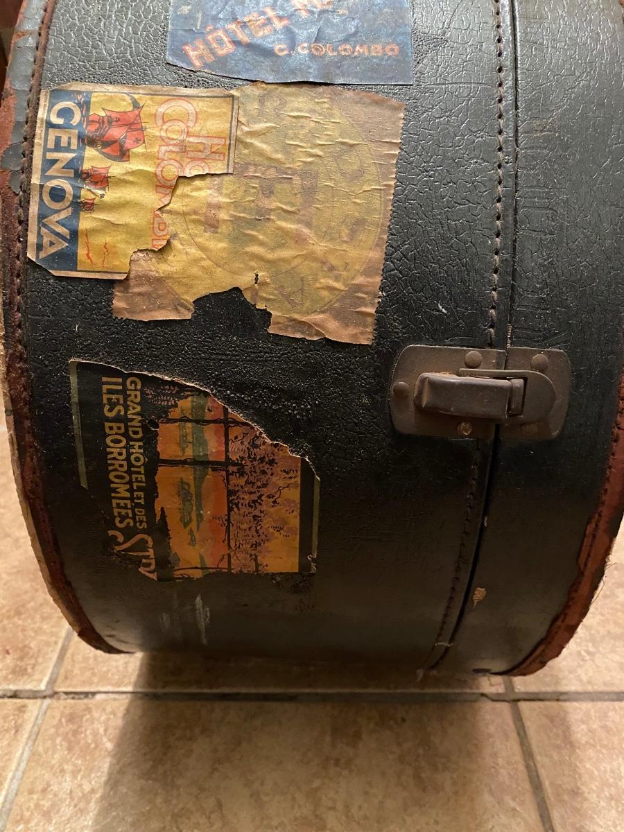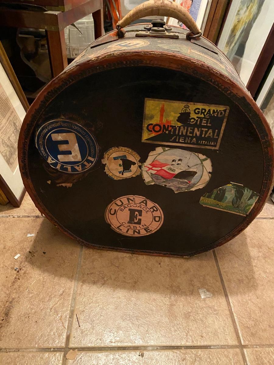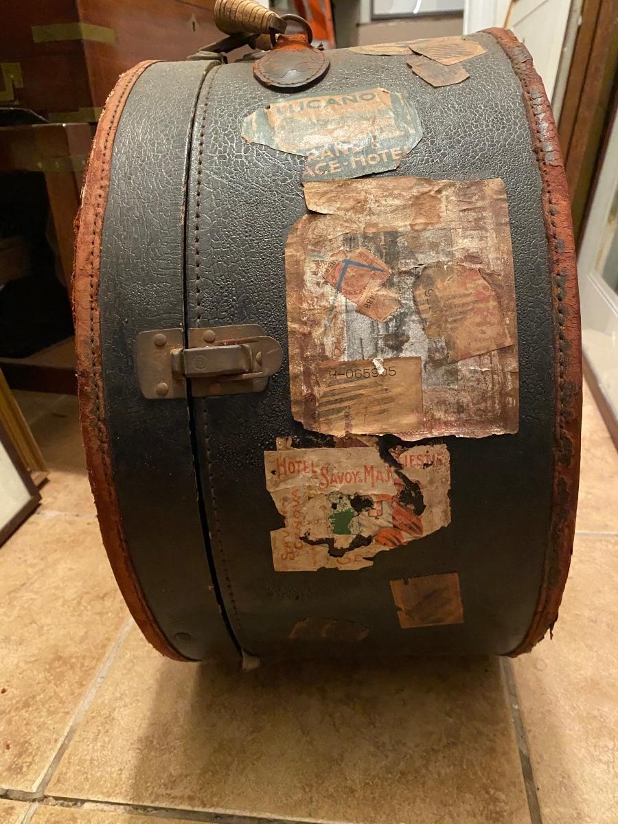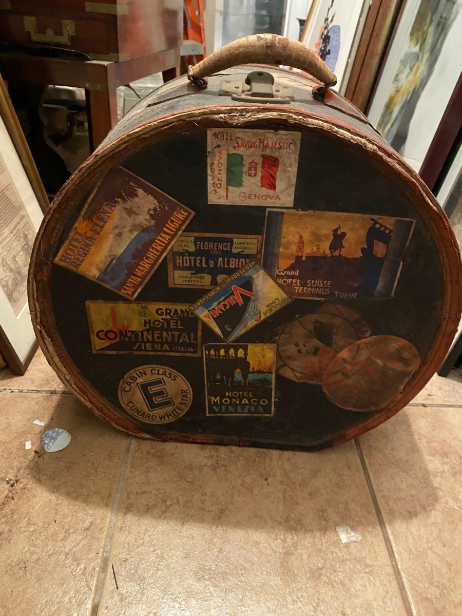 A rare find this fabulous early 20th century hat case, complete with vintage European hotel stickers of the time. Surprisingly good condition for it's age. Lining intact. Approx 17D by 9"