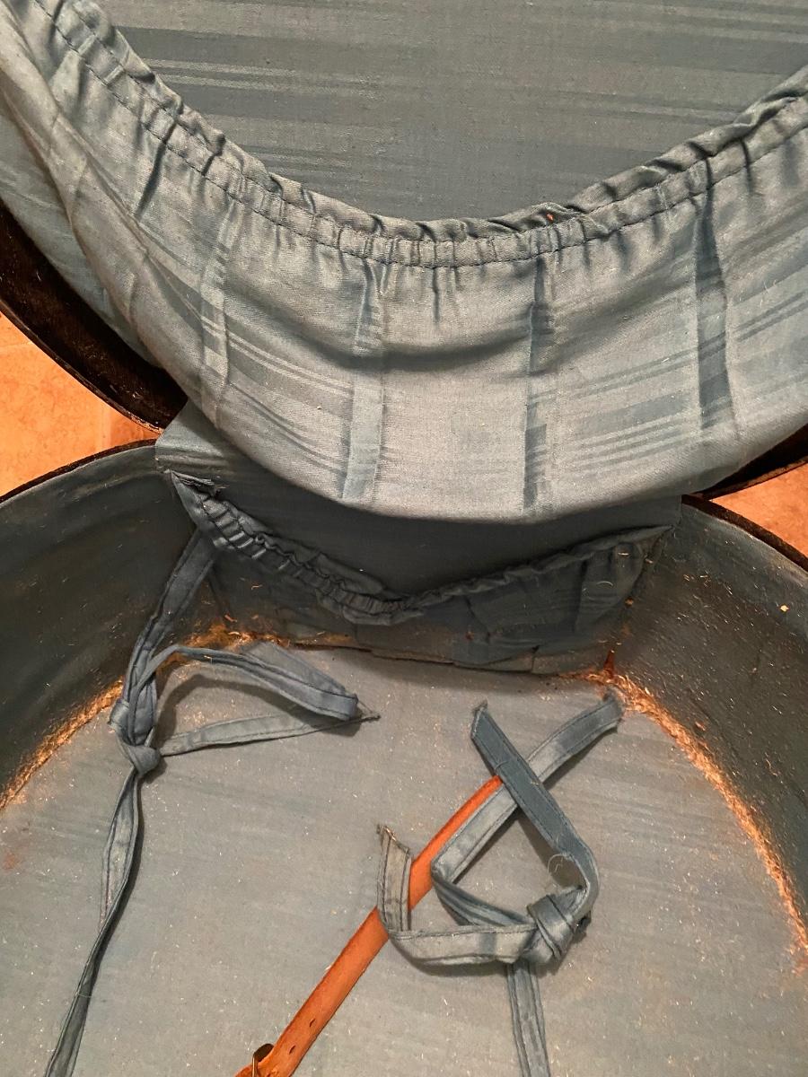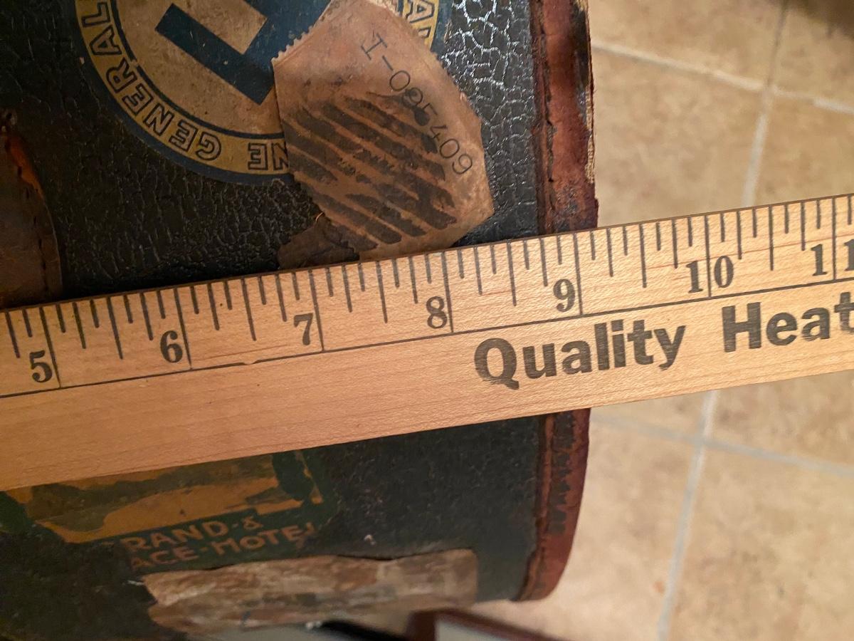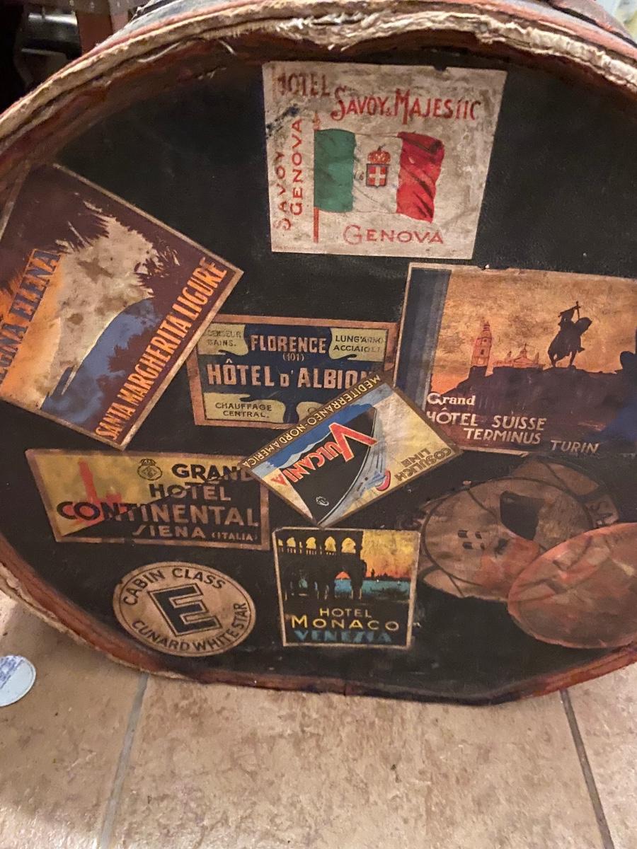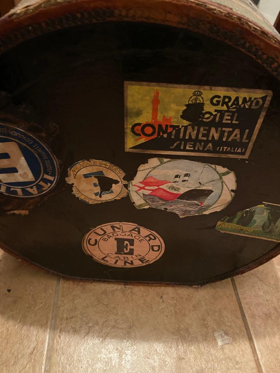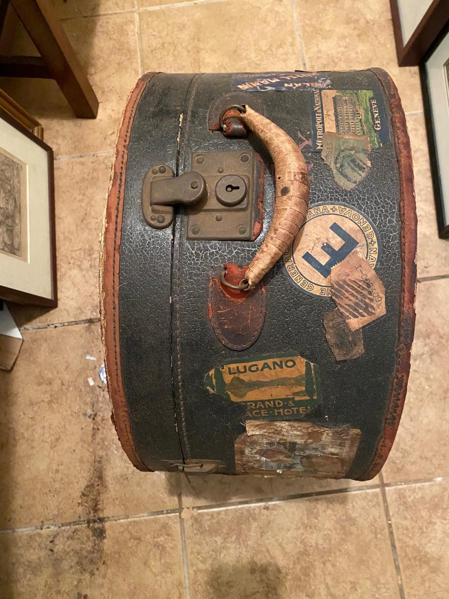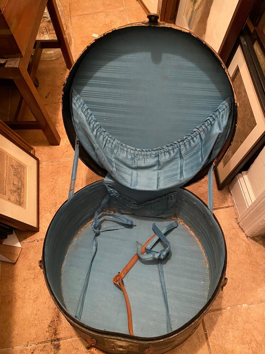 A rare find this fabulous early 20th century hat case, complete with vintage European hotel stickers of the time. Surprisingly good condition for it's age. Lining intact. Approx 17D by 9"