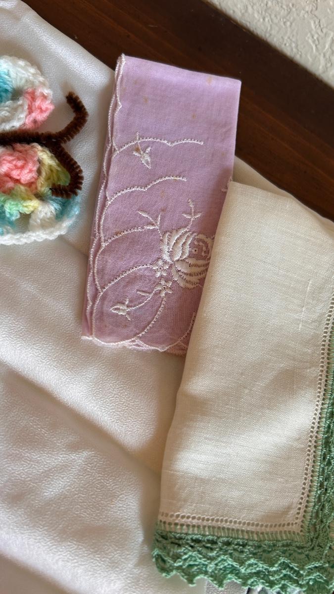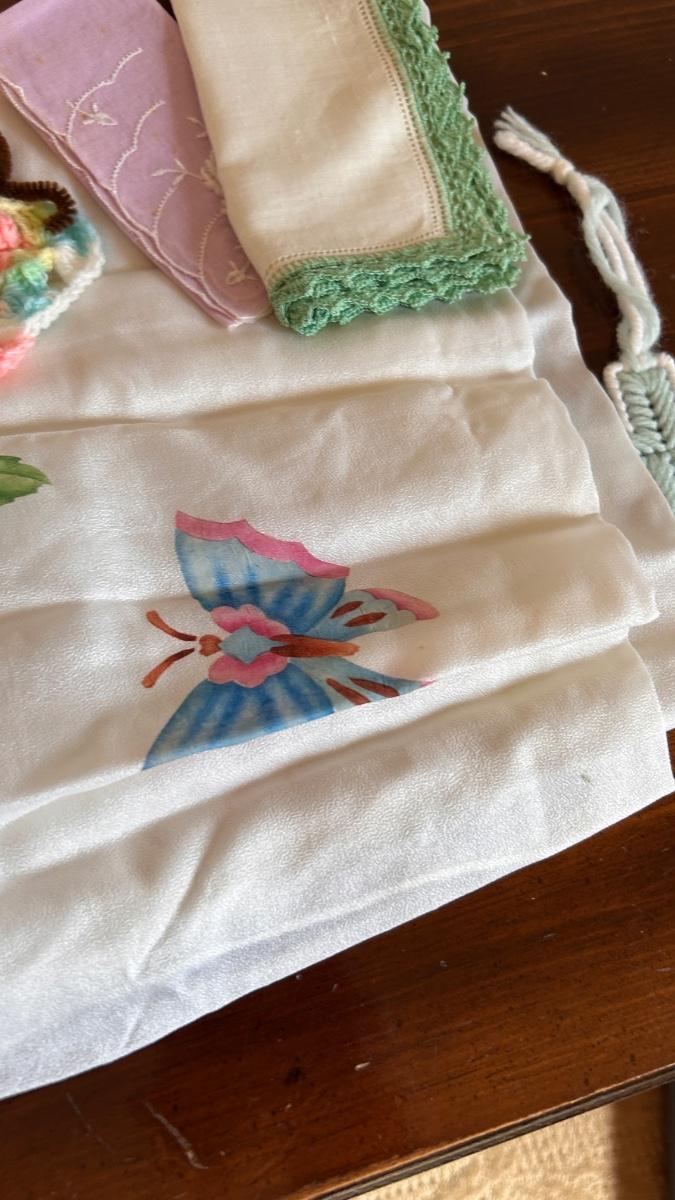 ANTIQUE HAT PIN HOLDER WITH LADIES HANDKERCHIEFS AND SCARFS