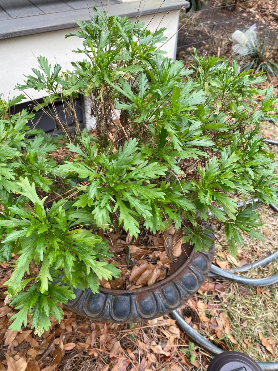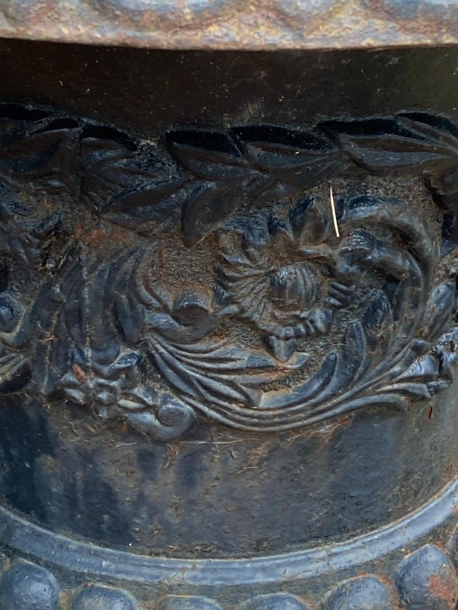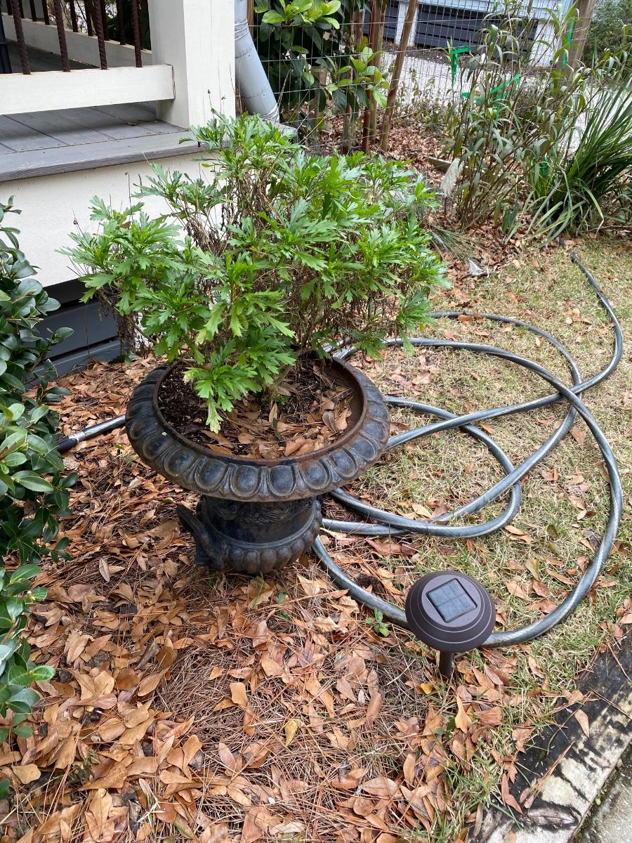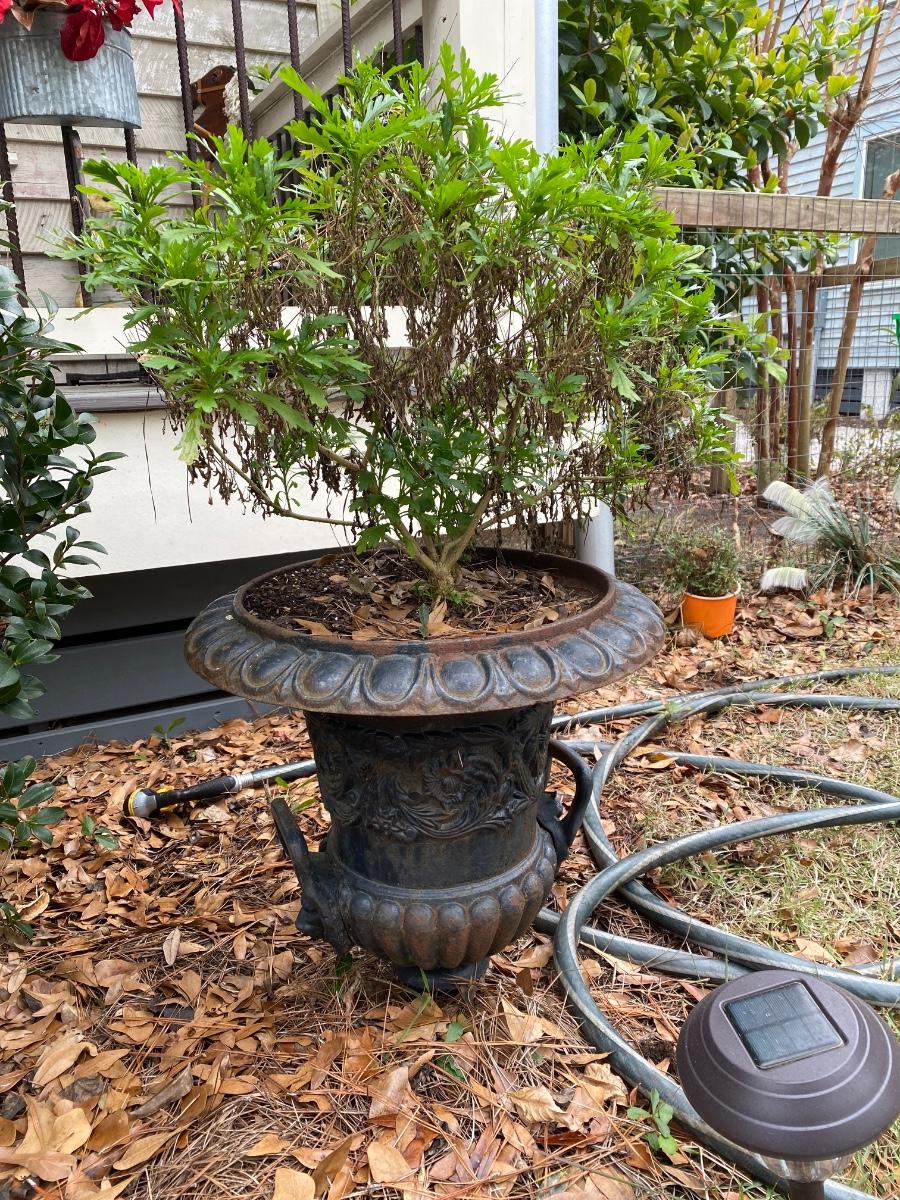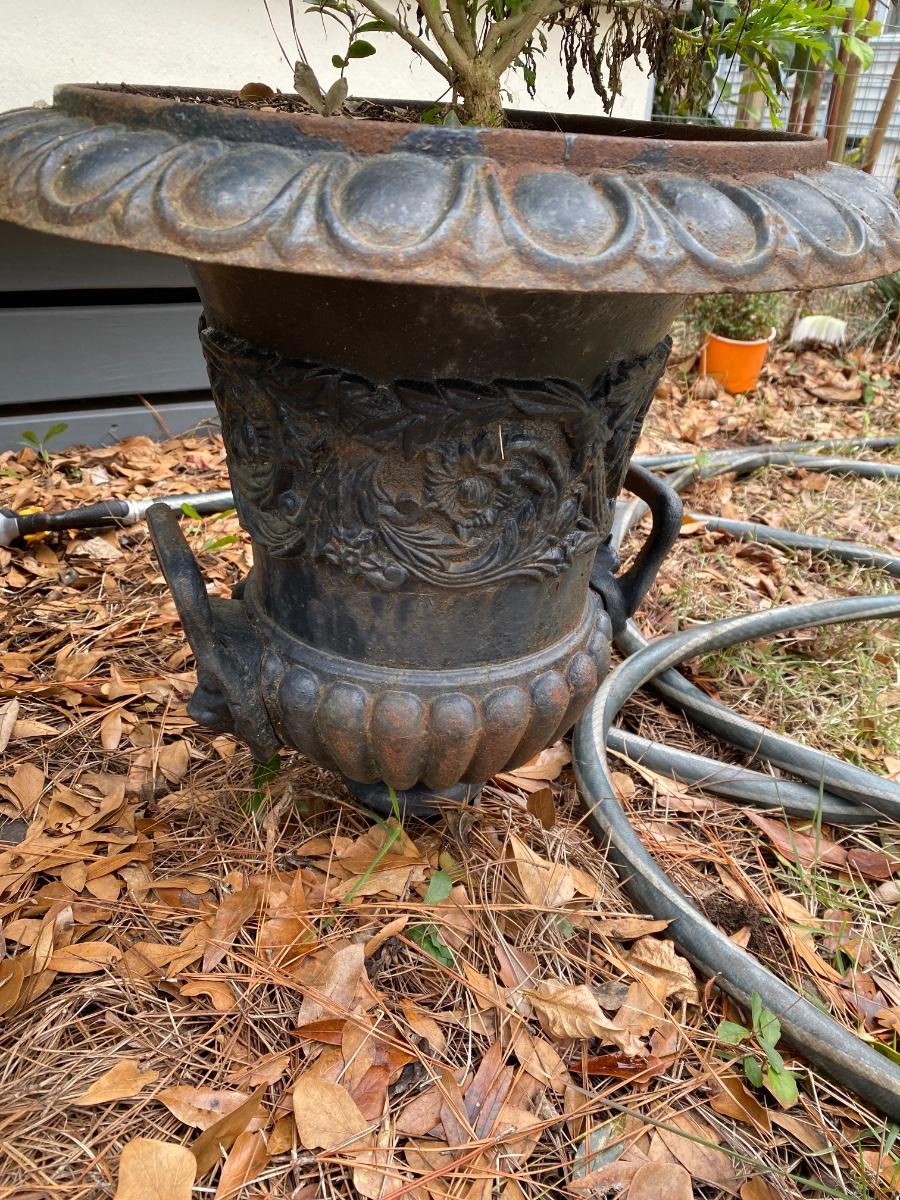 Includes flowering plant. The urn is 18 inches high. Heavy! In front yard to right of porch.
