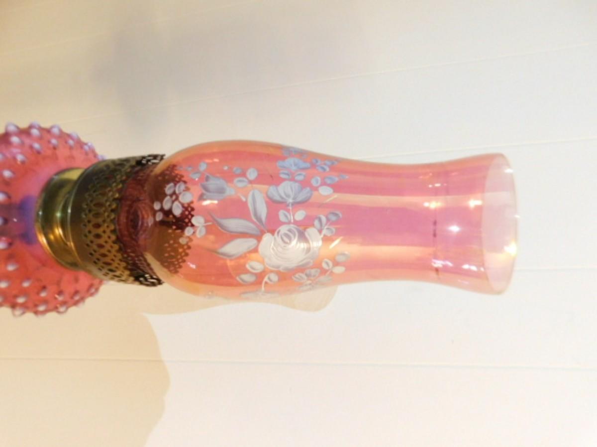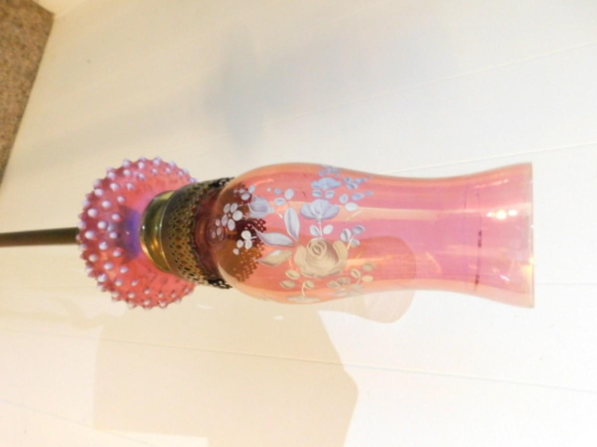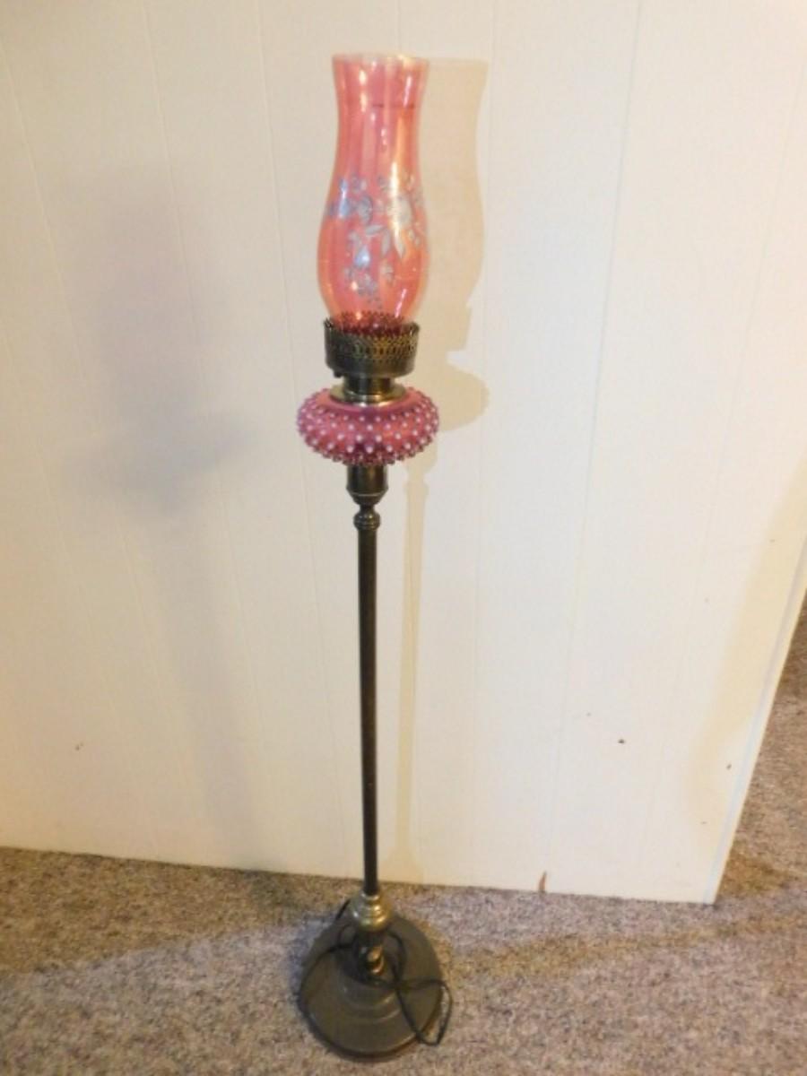 Antique Hobnail Cranberry Glass Post Floor Lamp with Hand Painted Glass Chimney