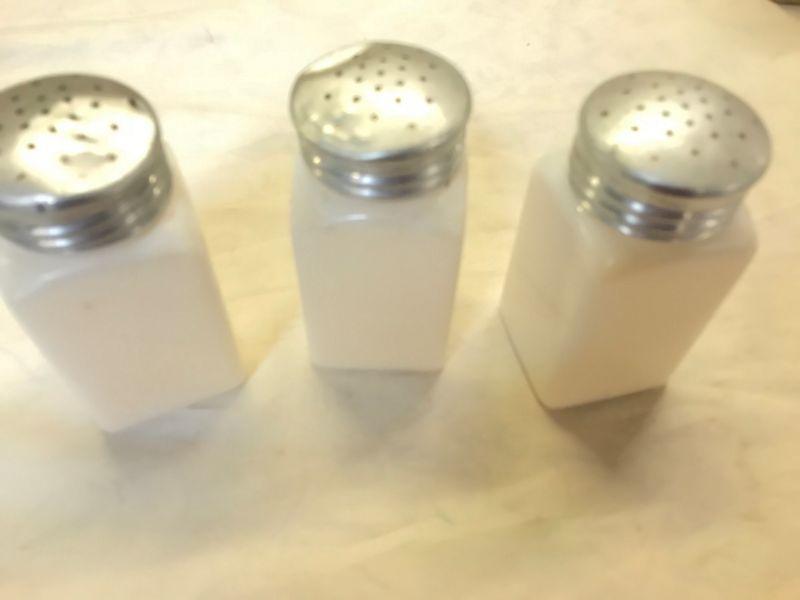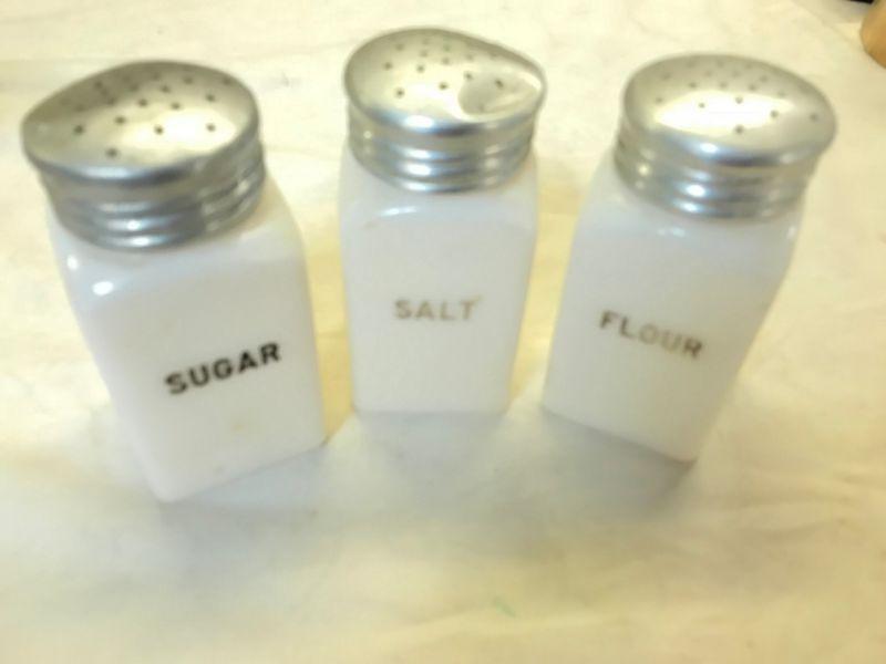 Set of 3 larger size milk glass Sugar, Salt and Flour jars with aluminum caps. Goes well but did not come with lot 9118.All items SOLD AS IS, AS SHOWN and subject to reserve bid. Unsold items will be relisted. Pick-Up only on Wednesday May 29th between 5-7 PM. Please read Shipping Terms