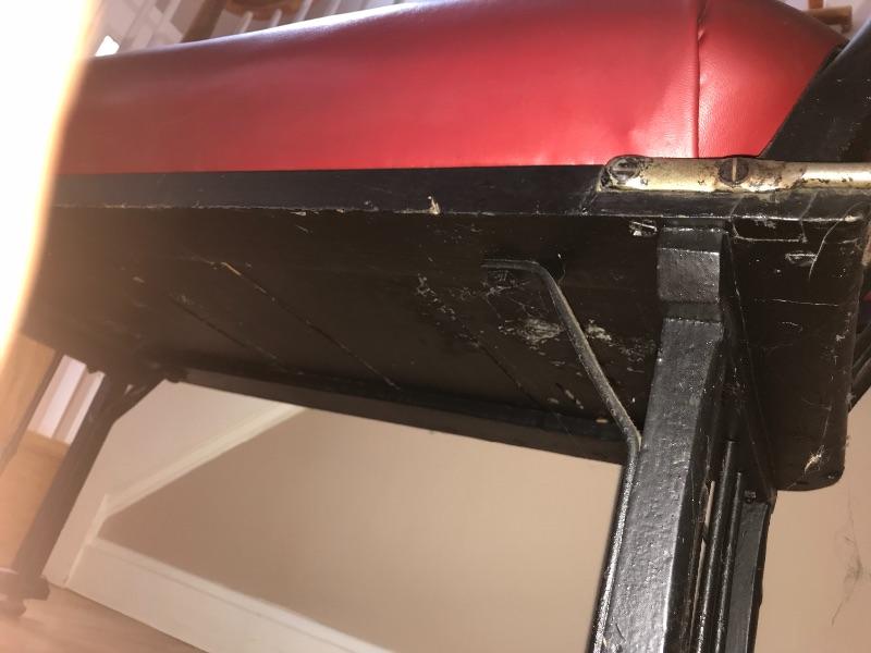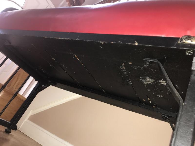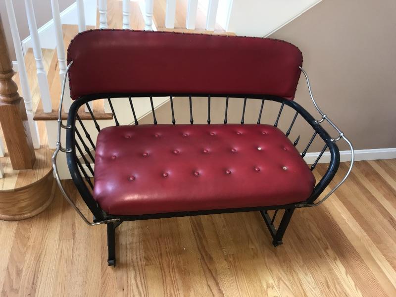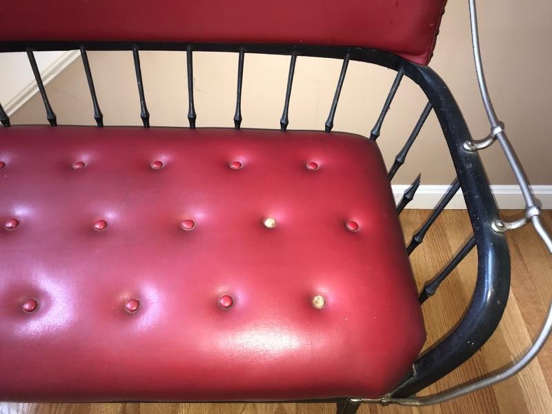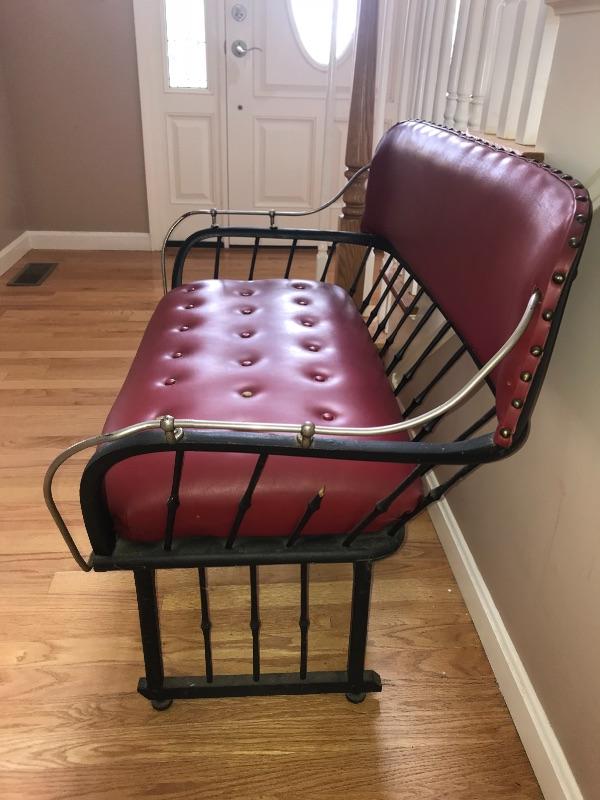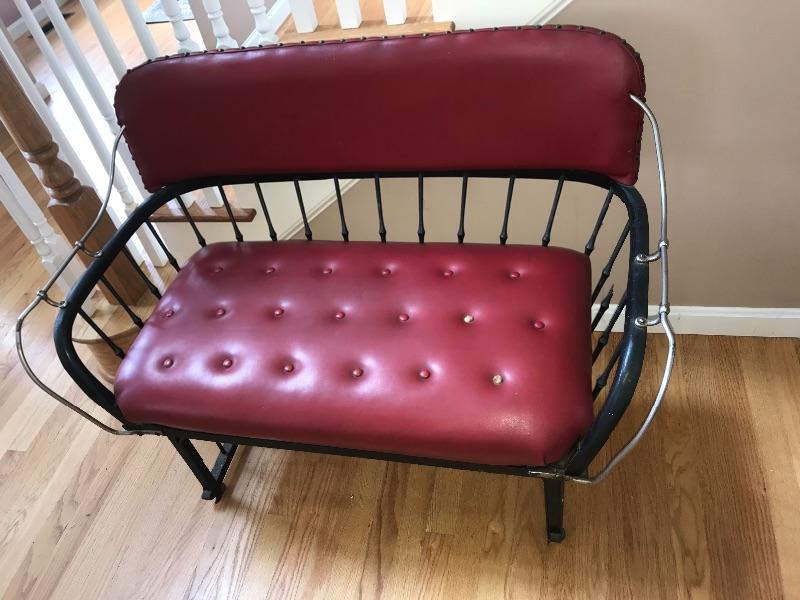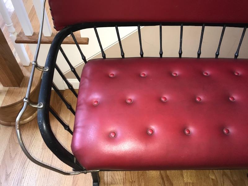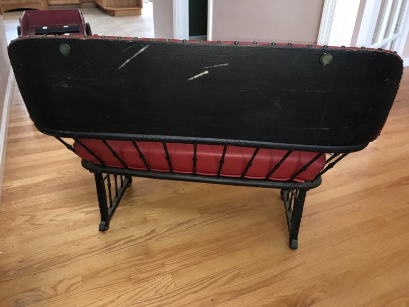 This is an antique carriage/buggy seat. It is button tufted and has a red leather fabric. There are a couple of buttons missing but the overall condition is in great condition.