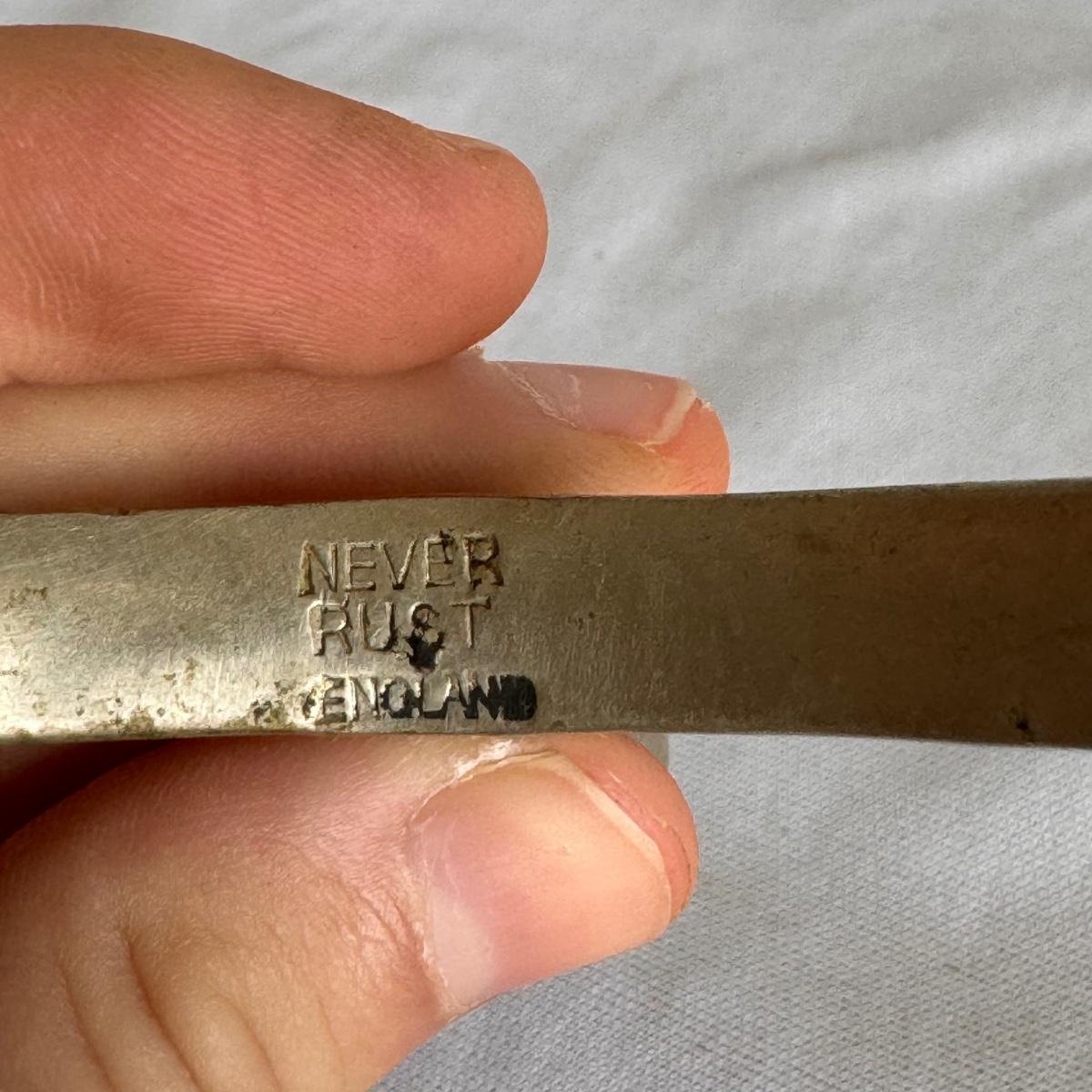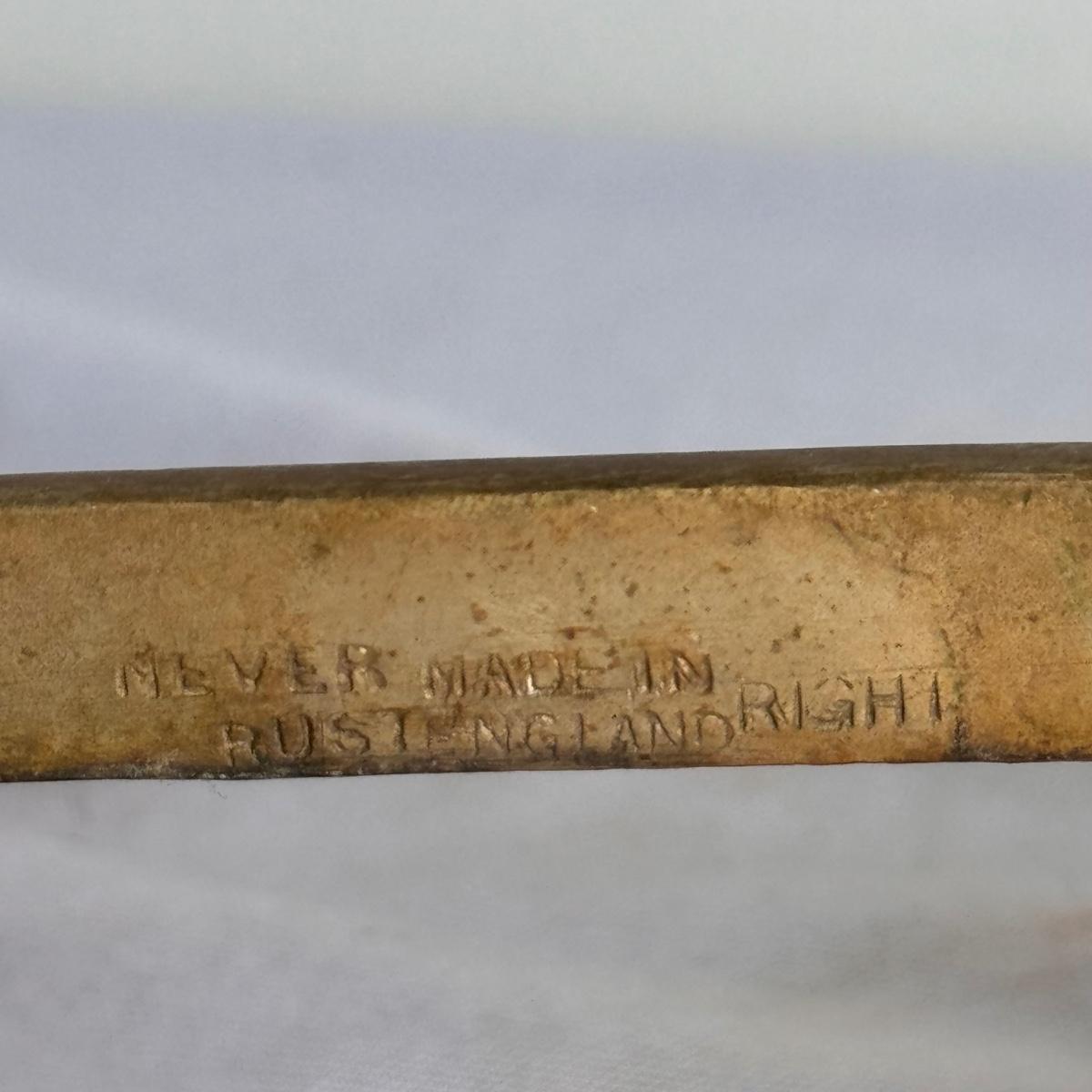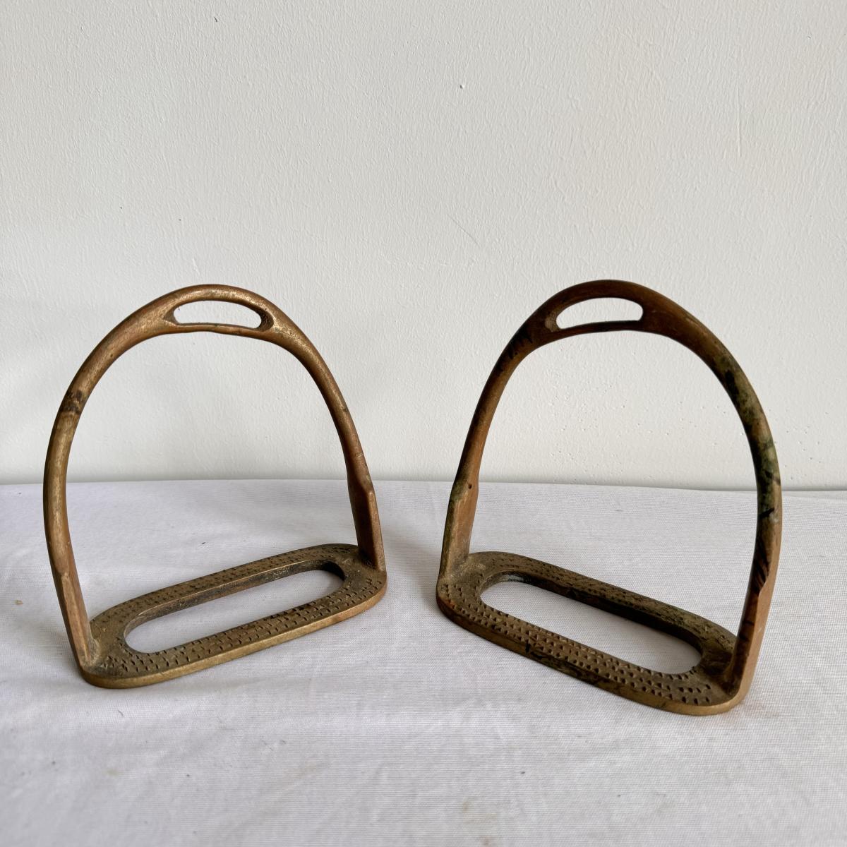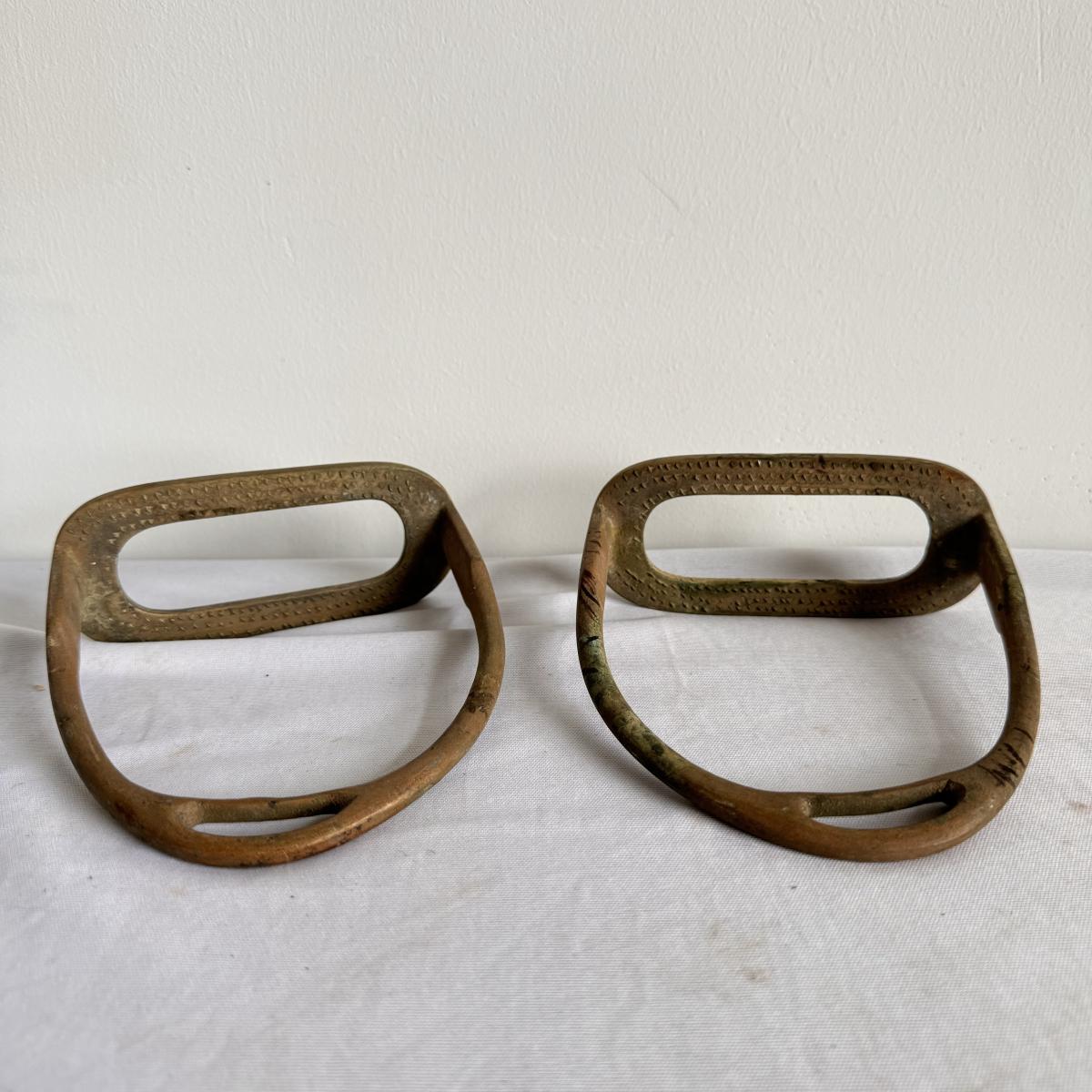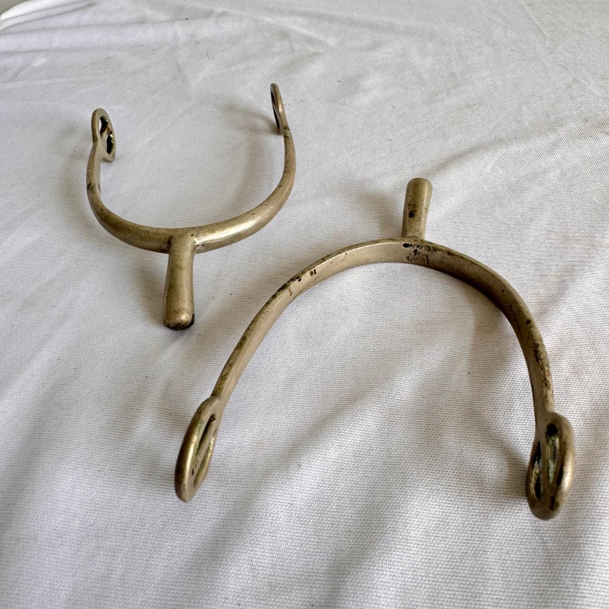 This lot includes two horse stirrups stamped with left and right, two horse spurs with “never rust” stamped on it, and one horse bit. The larger iron spurs measure 5” x 2.25” x 6”H. Shipping available.
