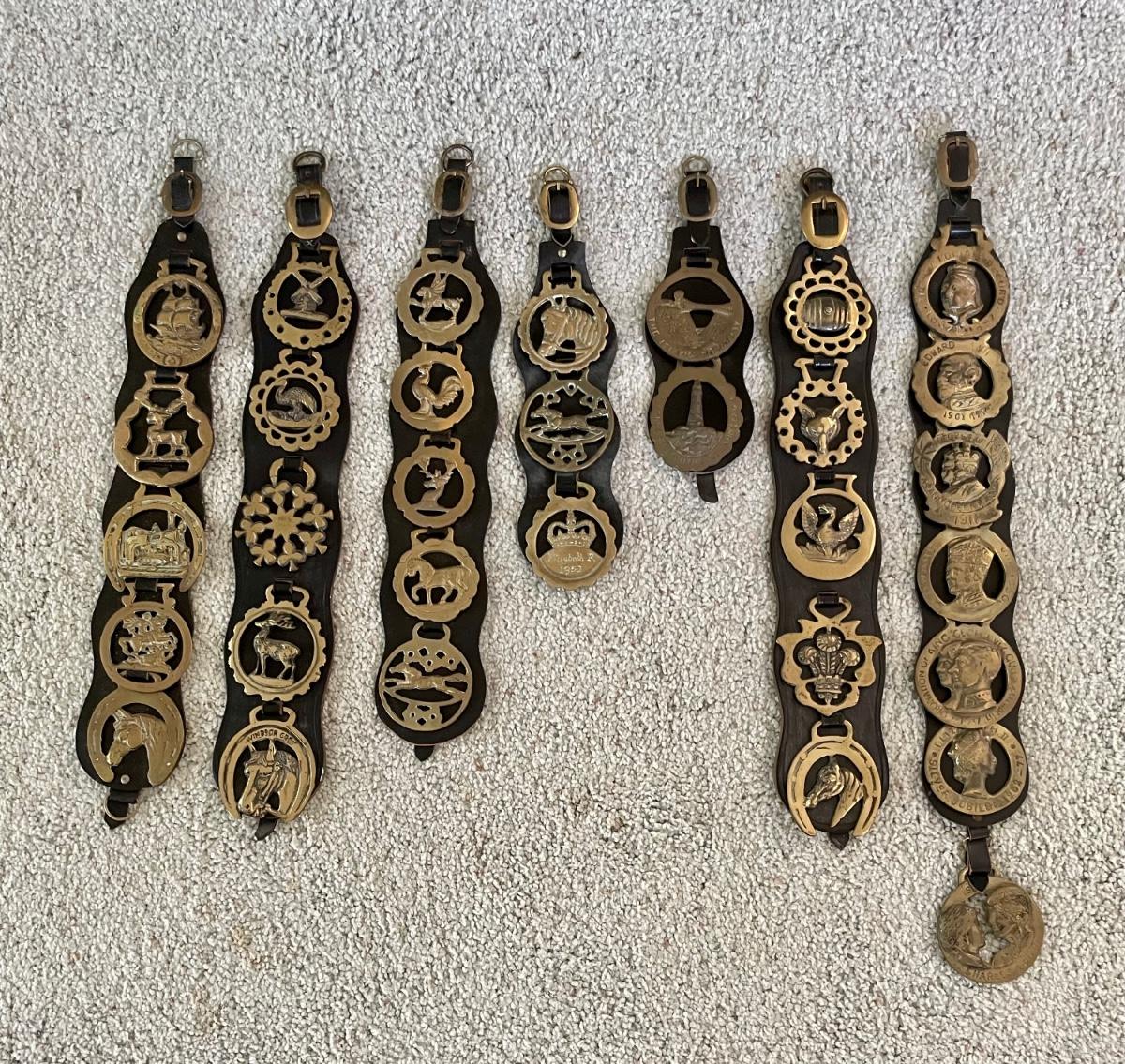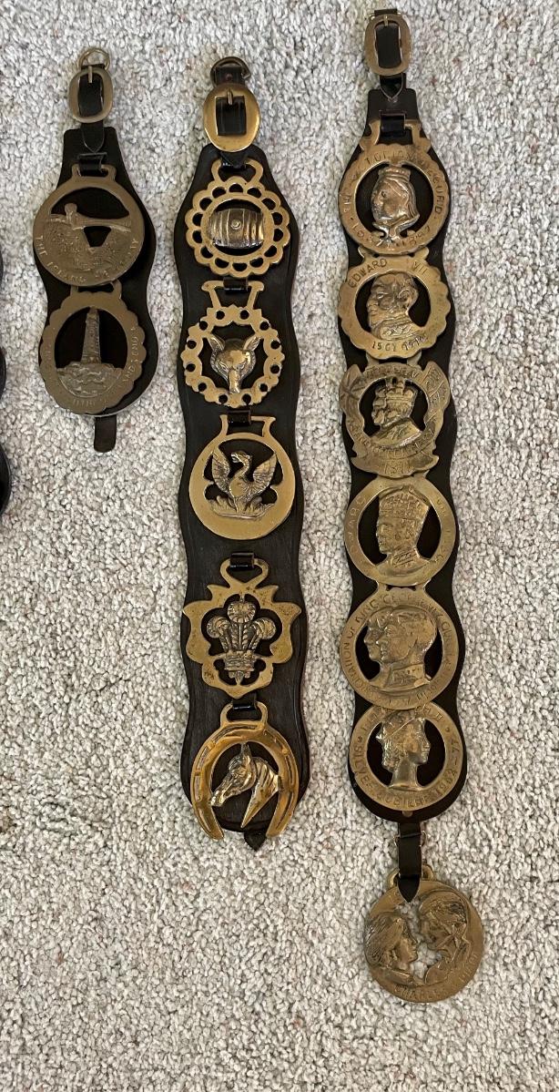 Lot of 7 leather hanging belts with 32 horse badges attached.