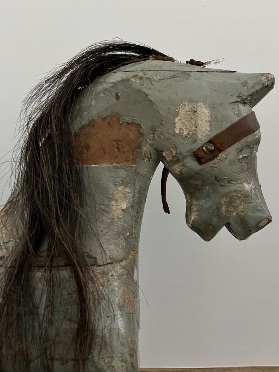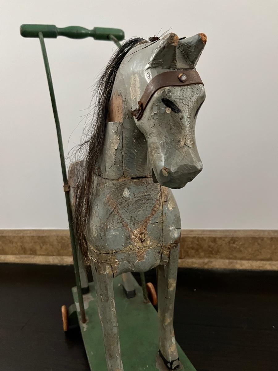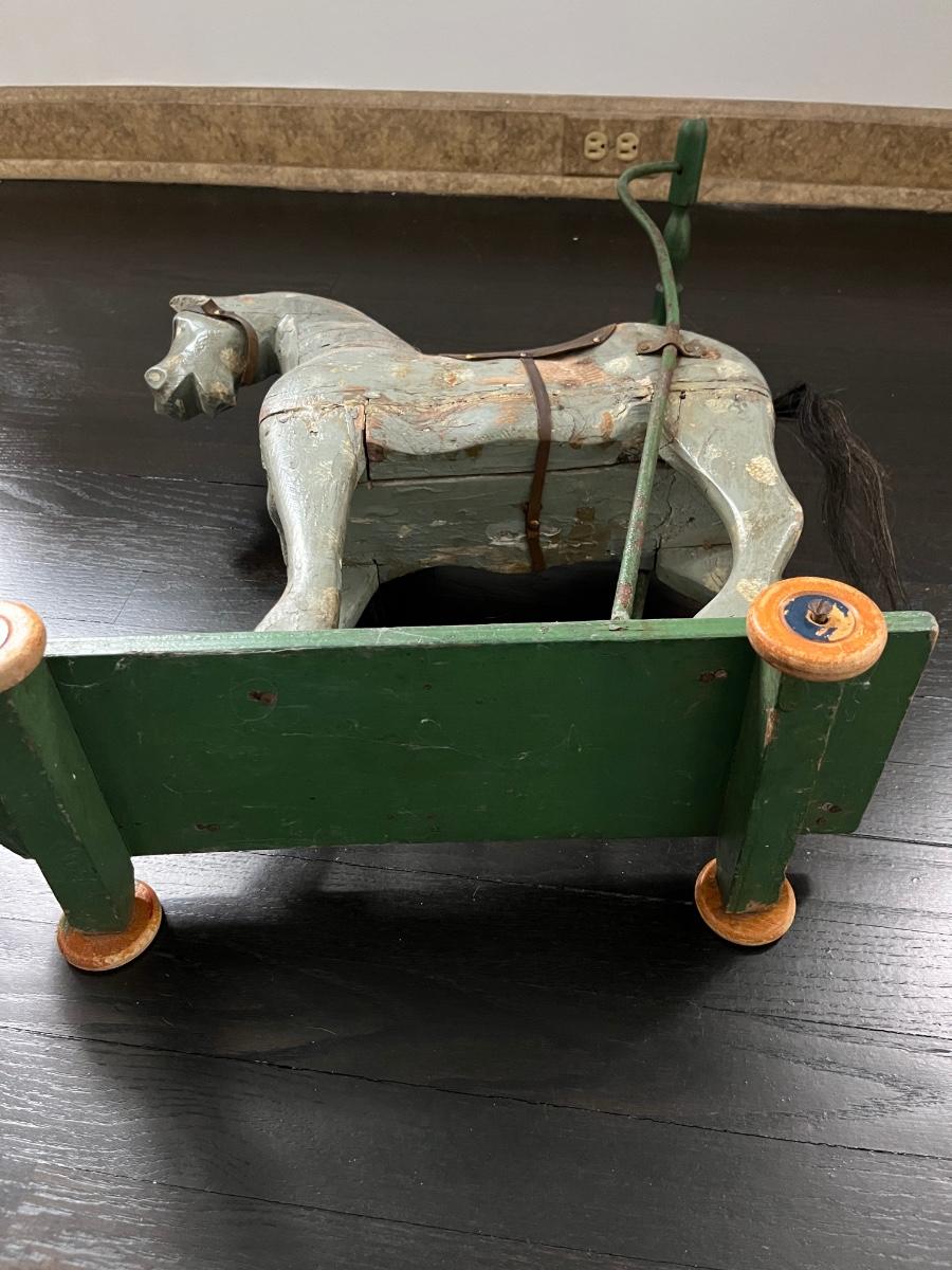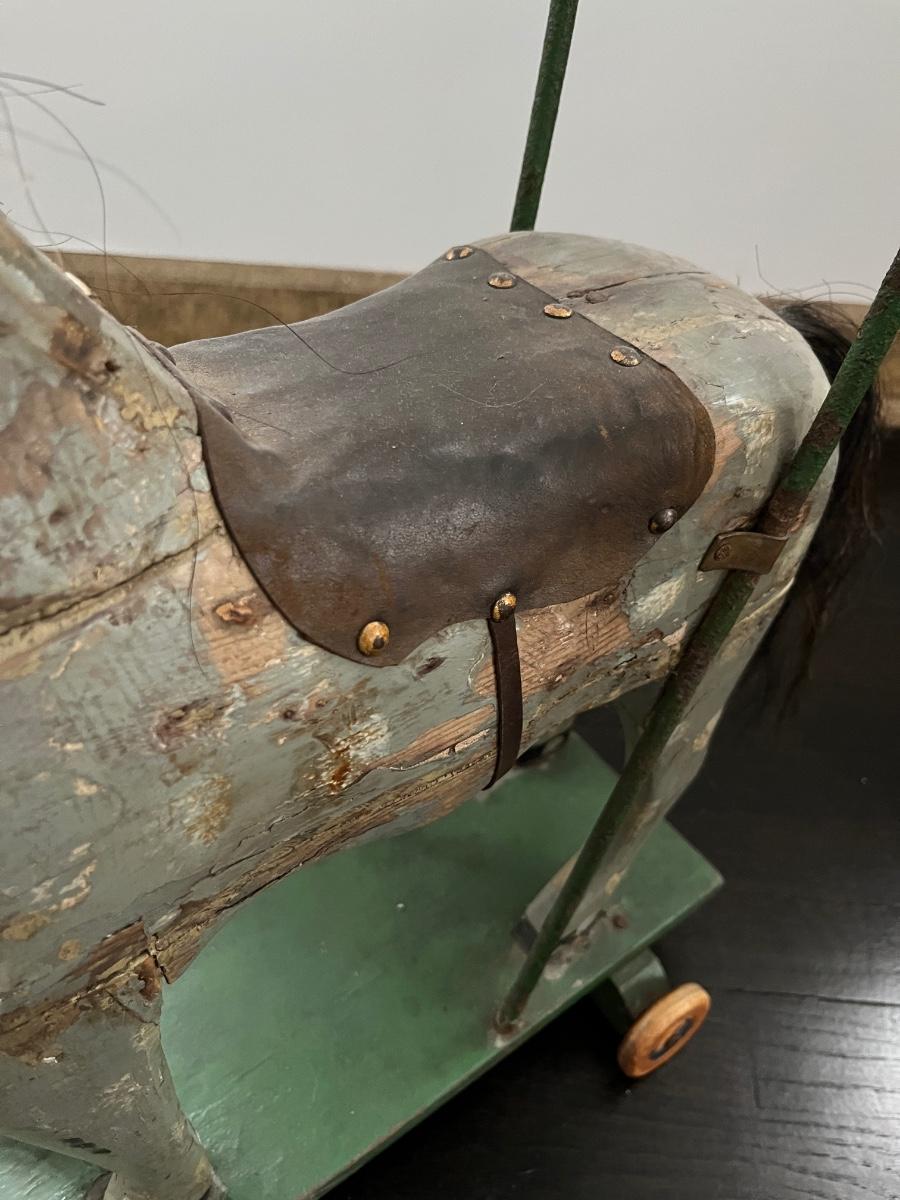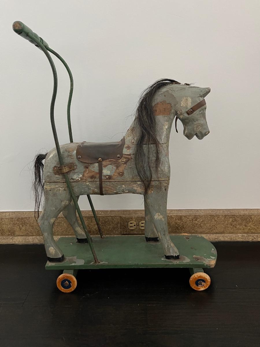 Antique horse push toy, 24” x 18” x 8.5”, English from Triang Toys, circa 1890. He's so sweet! This late Victorian push toy still has its real horse hair tail and mane, paint and leather saddle and bridle. He's a wonderful piece of decor for any horse or folk art lover.