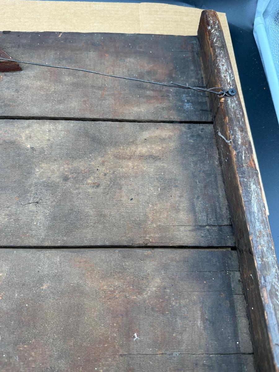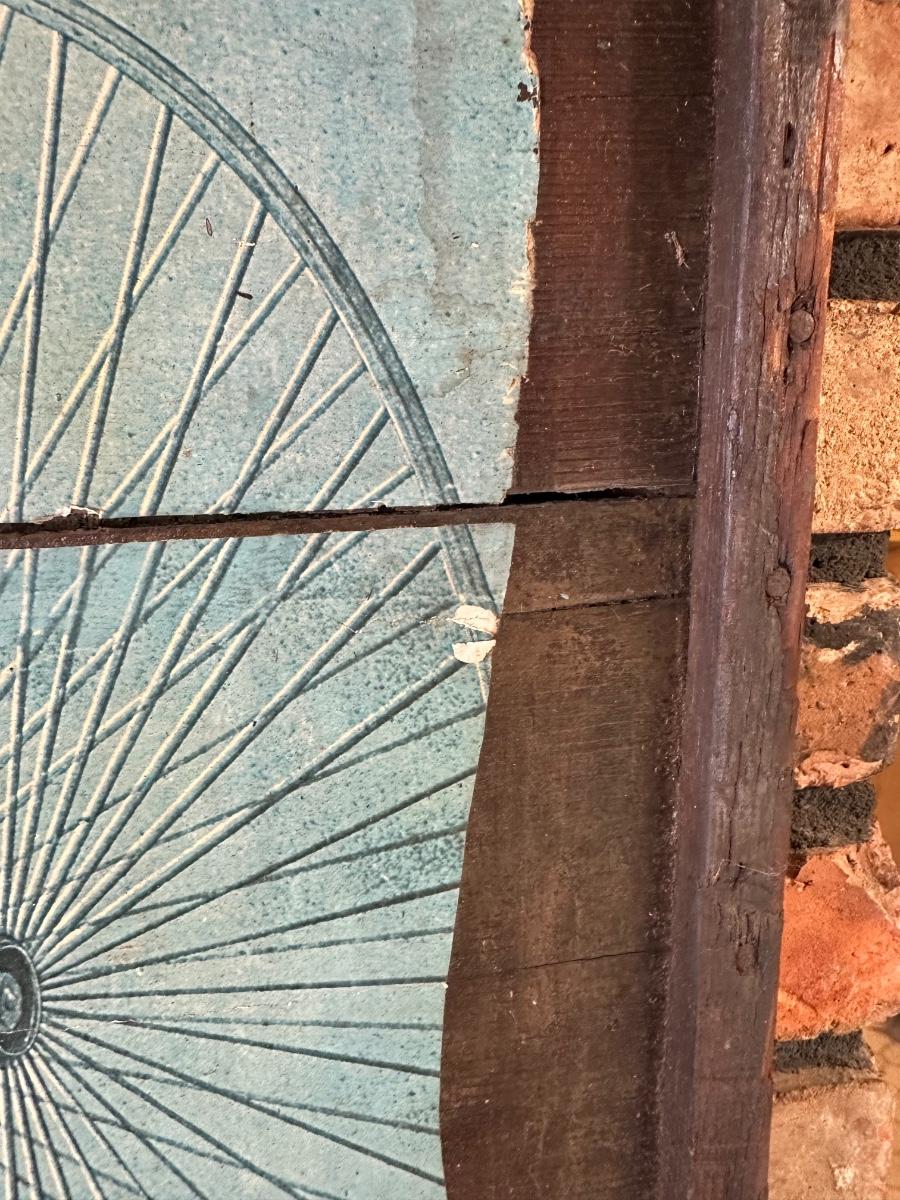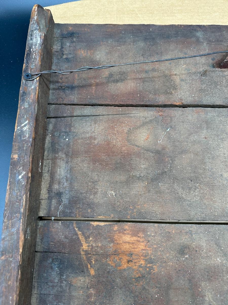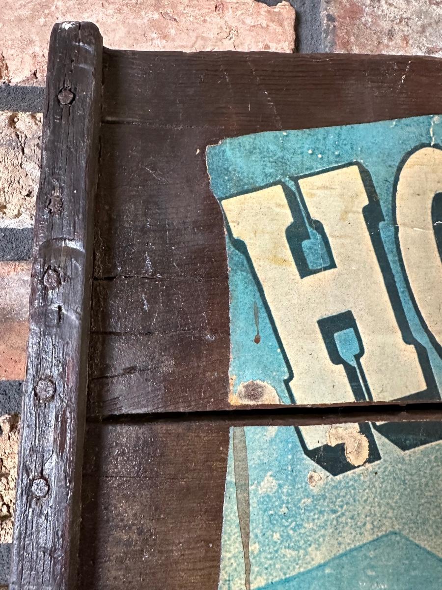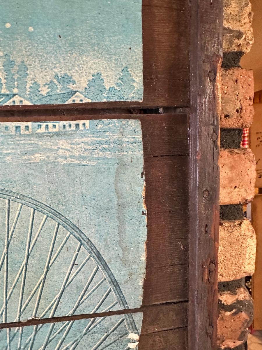 The graphic is mounted to aged wooden slats with vertical side rails, likely done many decades ago for display. Artwork shows authentic wear, edge losses, cracking, and surface distress consistent with true age. Wood frame shows splitting, old fasteners, and patina. This is not a modern reproduction — the printing style, paper, and wear all point to an original period piece.