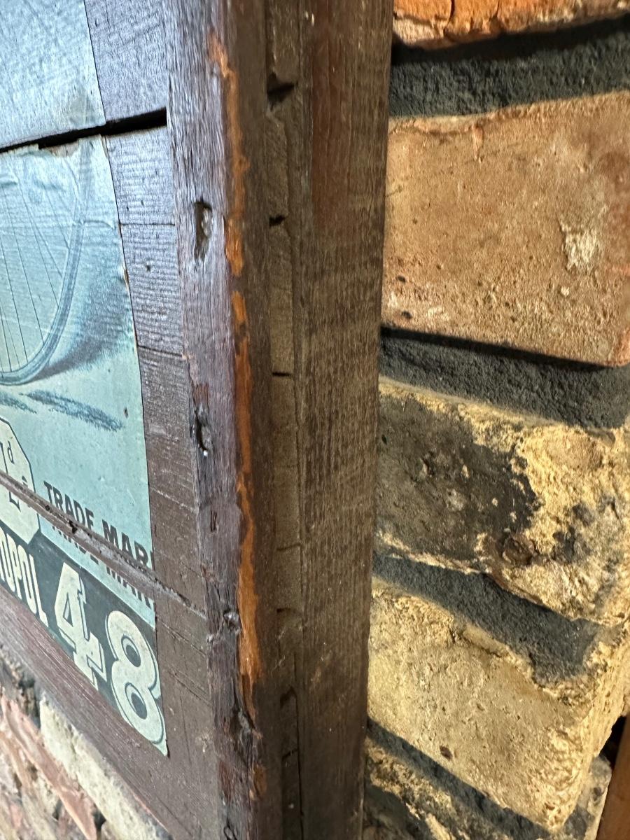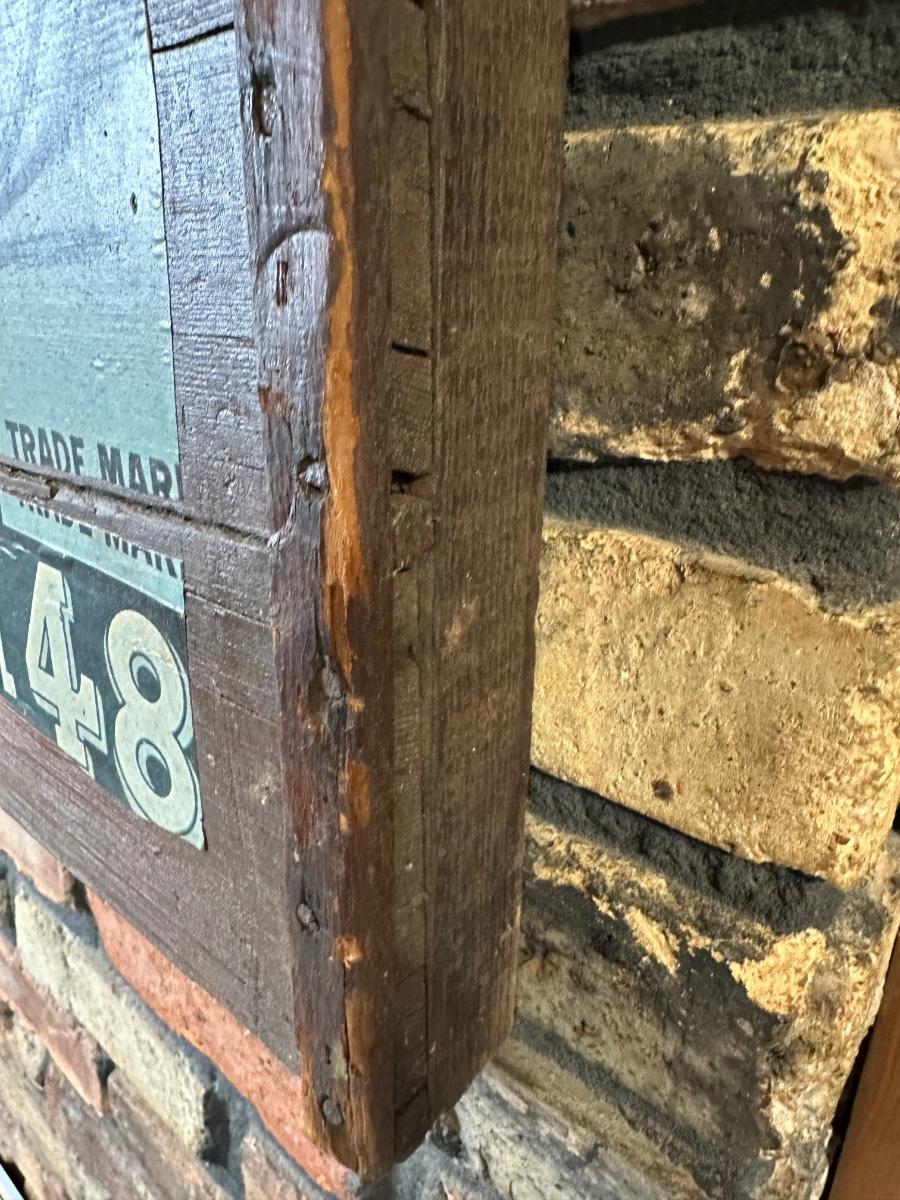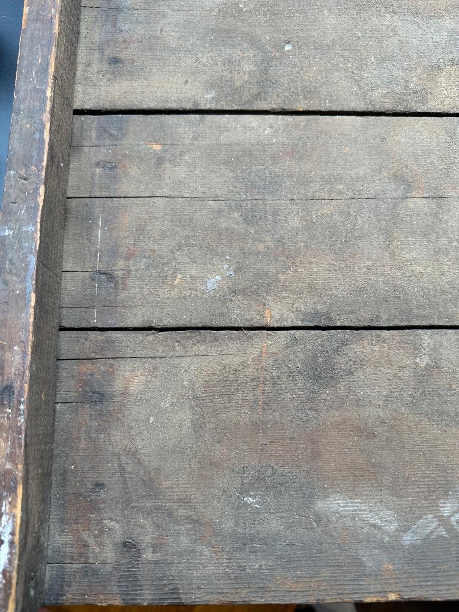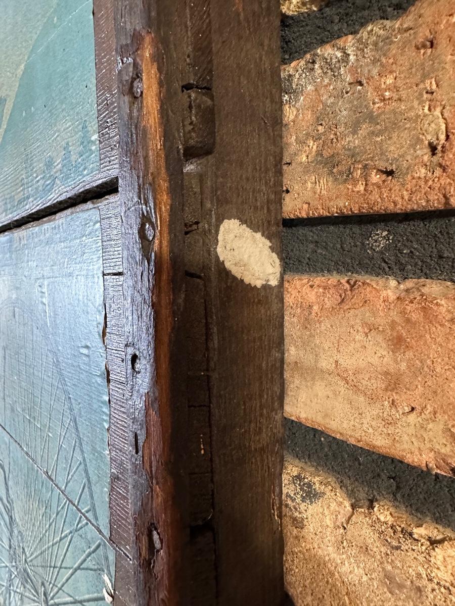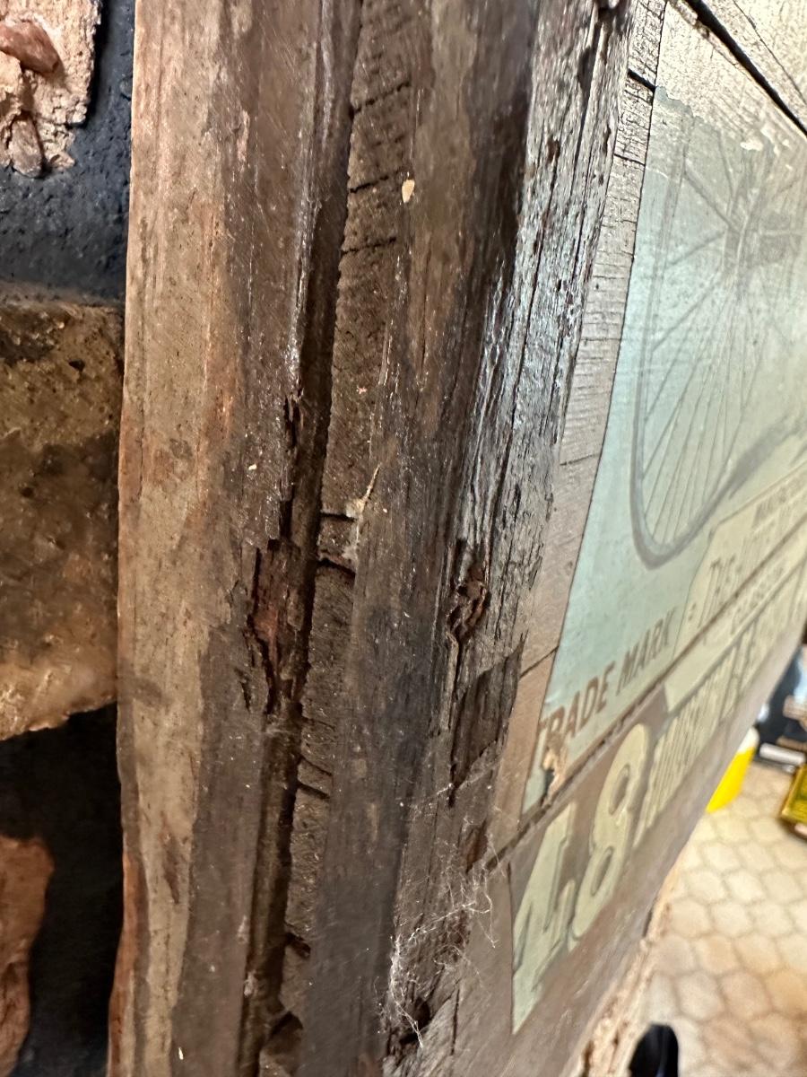 The graphic is mounted to aged wooden slats with vertical side rails, likely done many decades ago for display. Artwork shows authentic wear, edge losses, cracking, and surface distress consistent with true age. Wood frame shows splitting, old fasteners, and patina. This is not a modern reproduction — the printing style, paper, and wear all point to an original period piece.