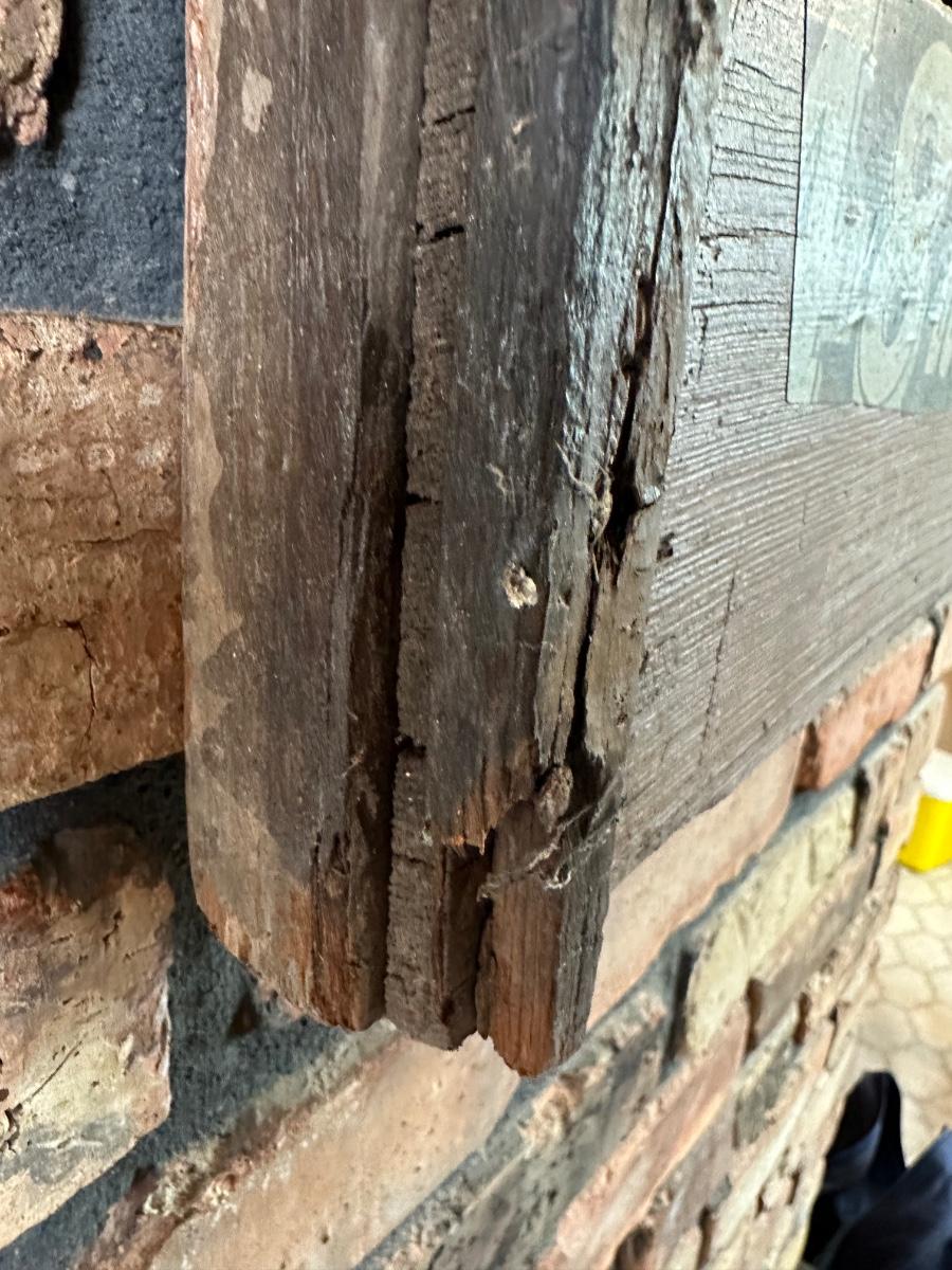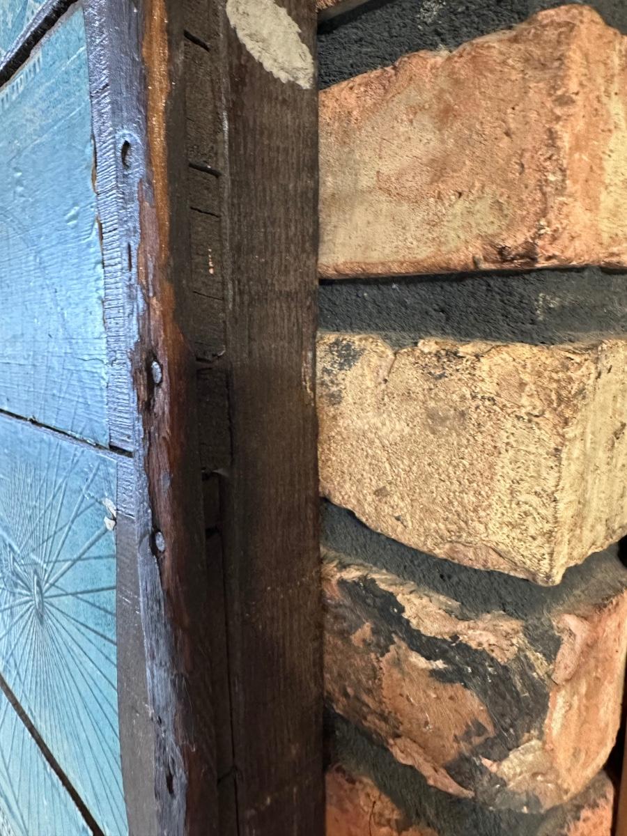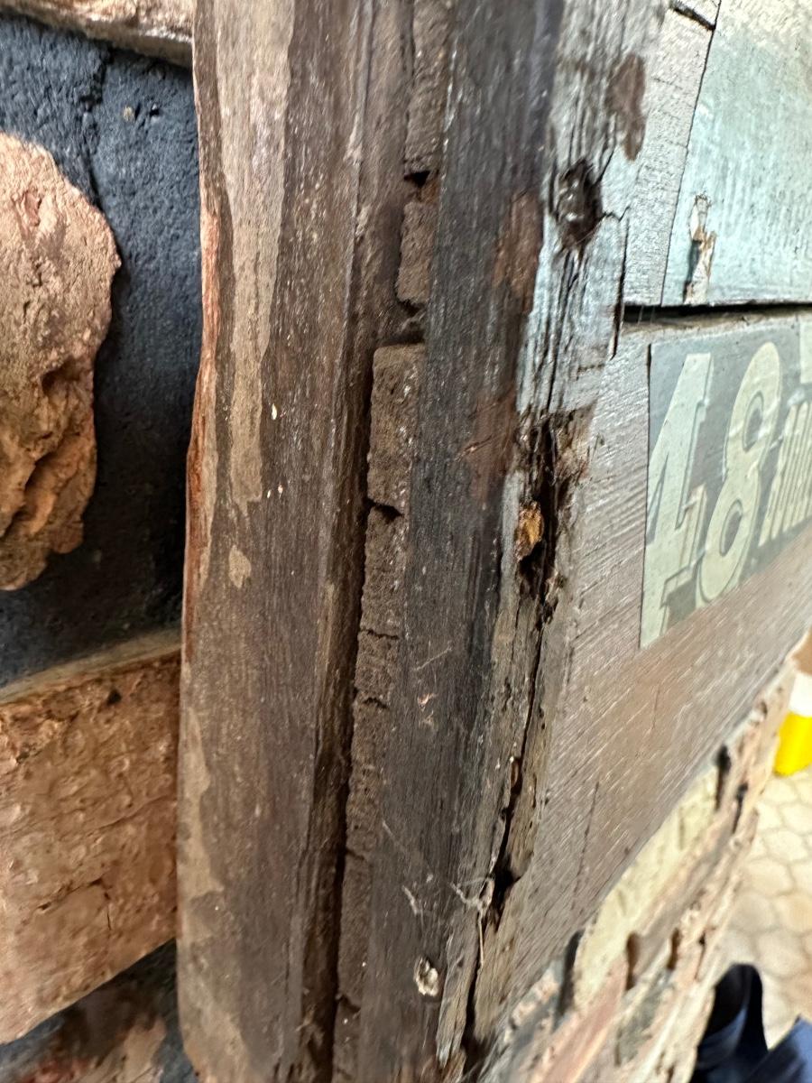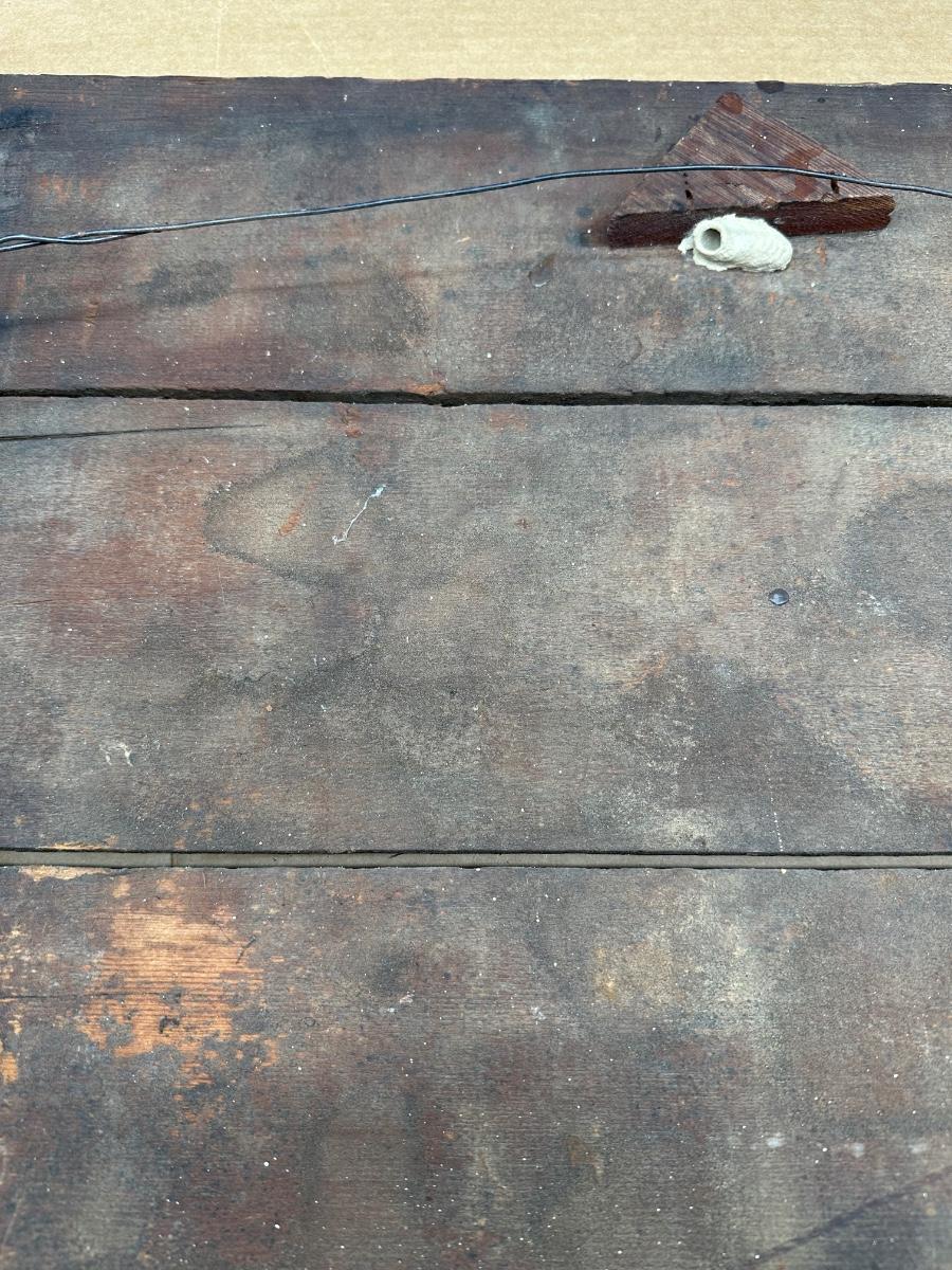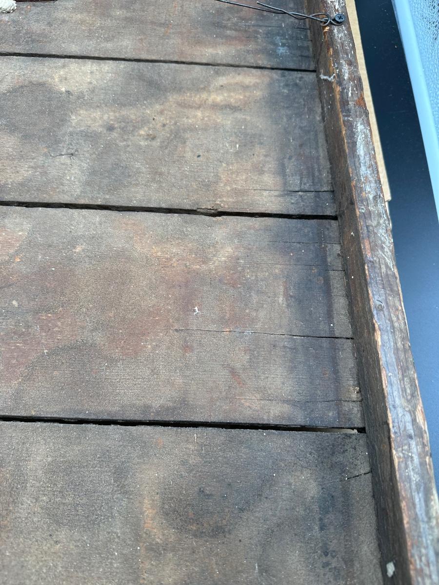 The graphic is mounted to aged wooden slats with vertical side rails, likely done many decades ago for display. Artwork shows authentic wear, edge losses, cracking, and surface distress consistent with true age. Wood frame shows splitting, old fasteners, and patina. This is not a modern reproduction — the printing style, paper, and wear all point to an original period piece.