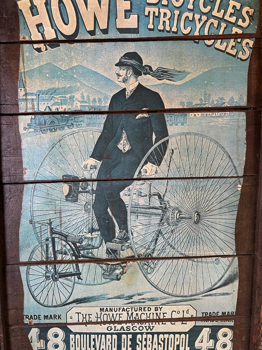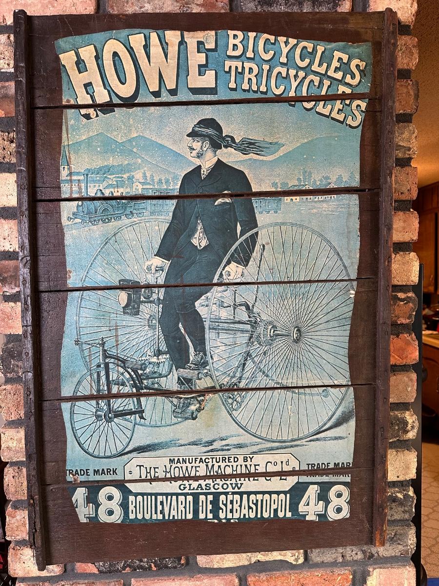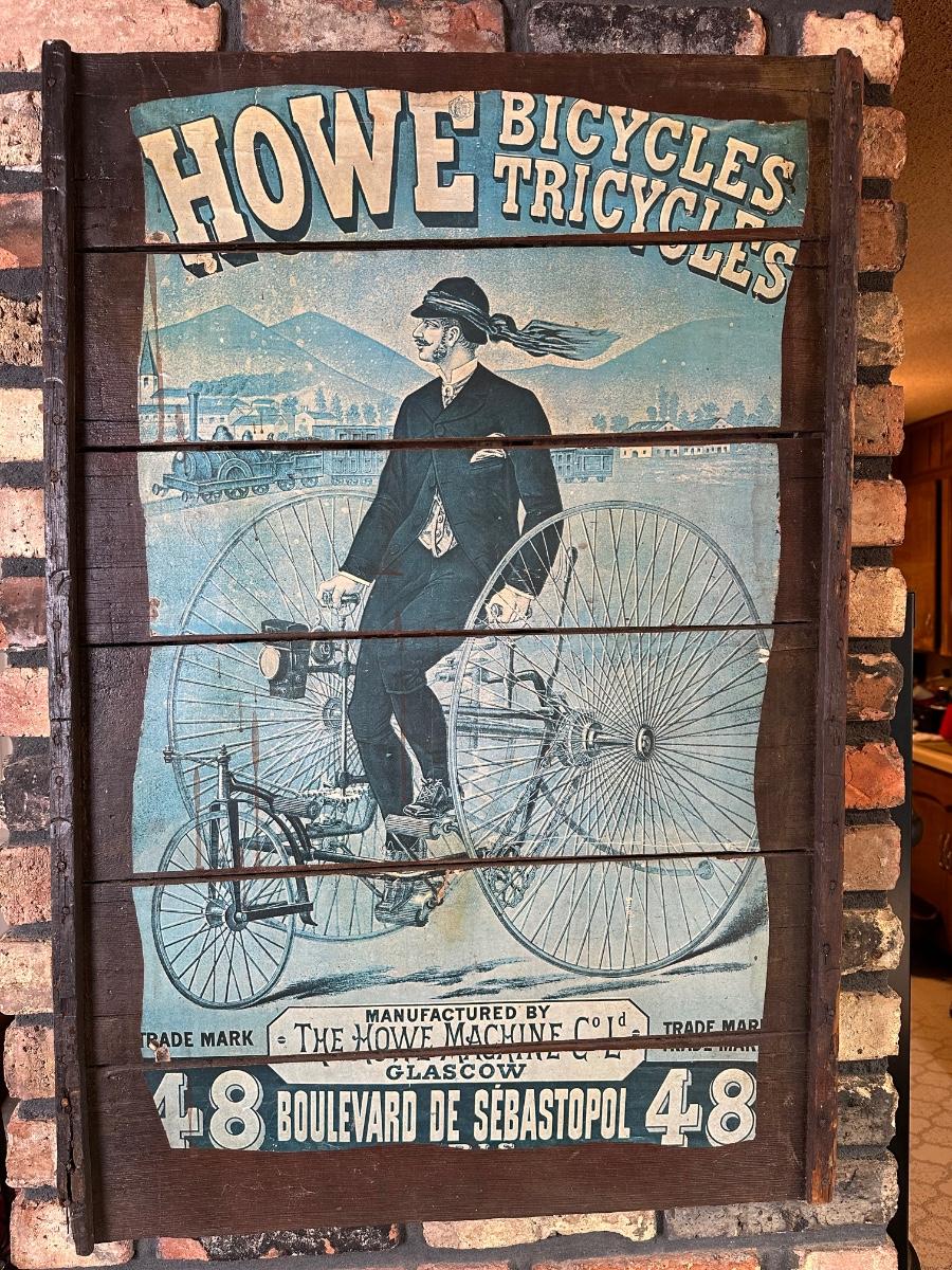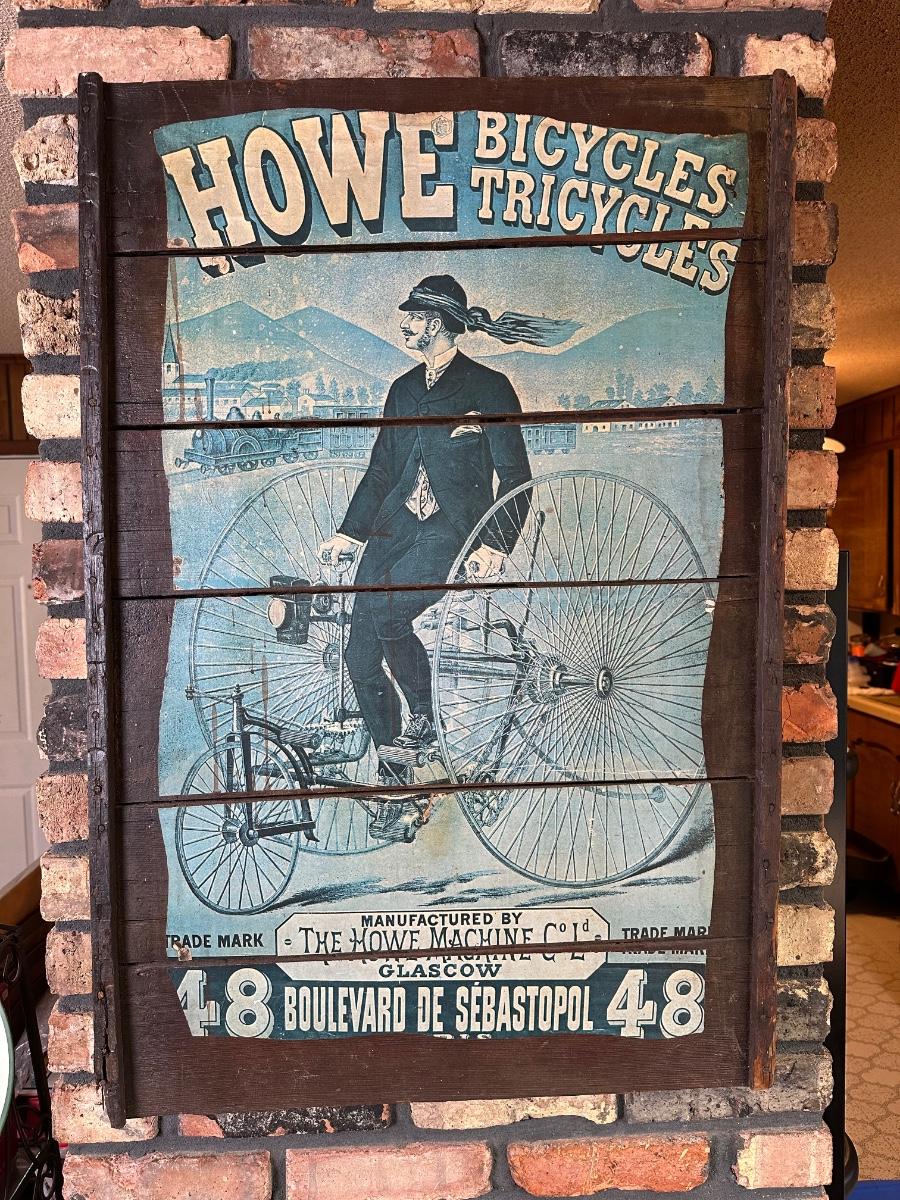 Antique HOWE Bicycles & Tricycles Advertising Sign – Mounted on Wood – Penny-Farthing Graphic