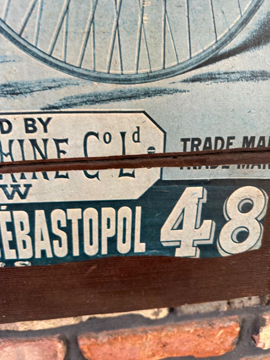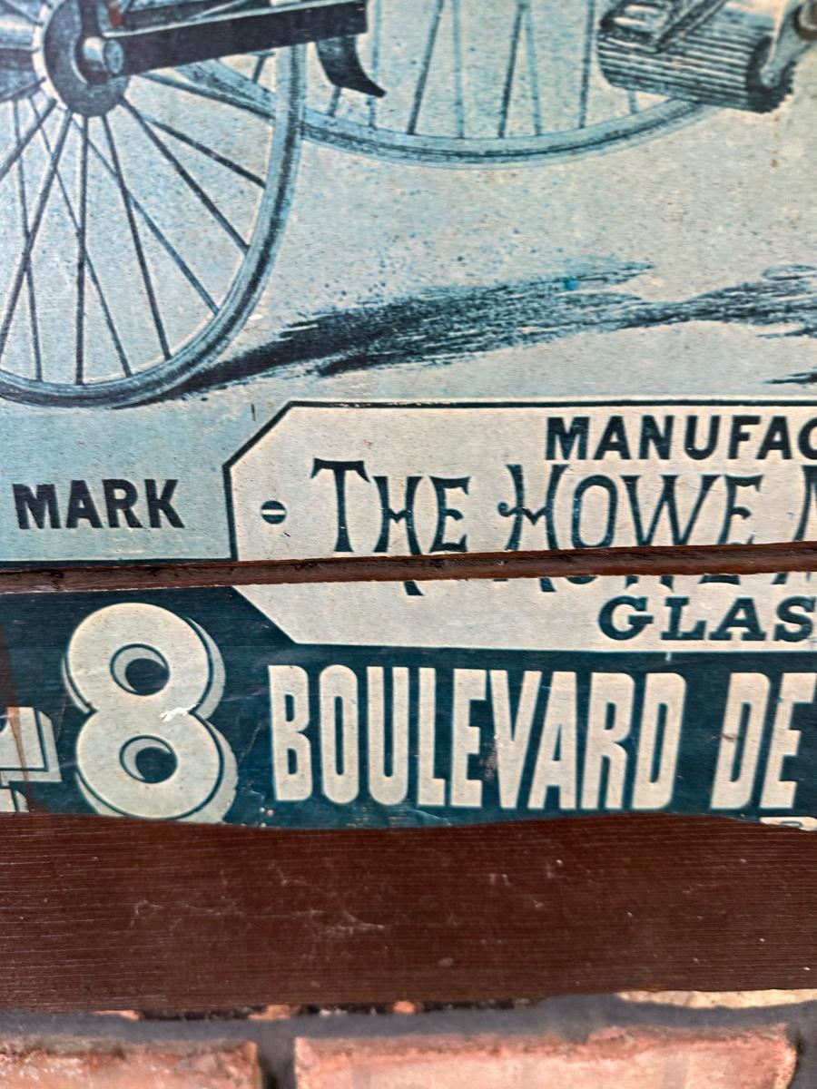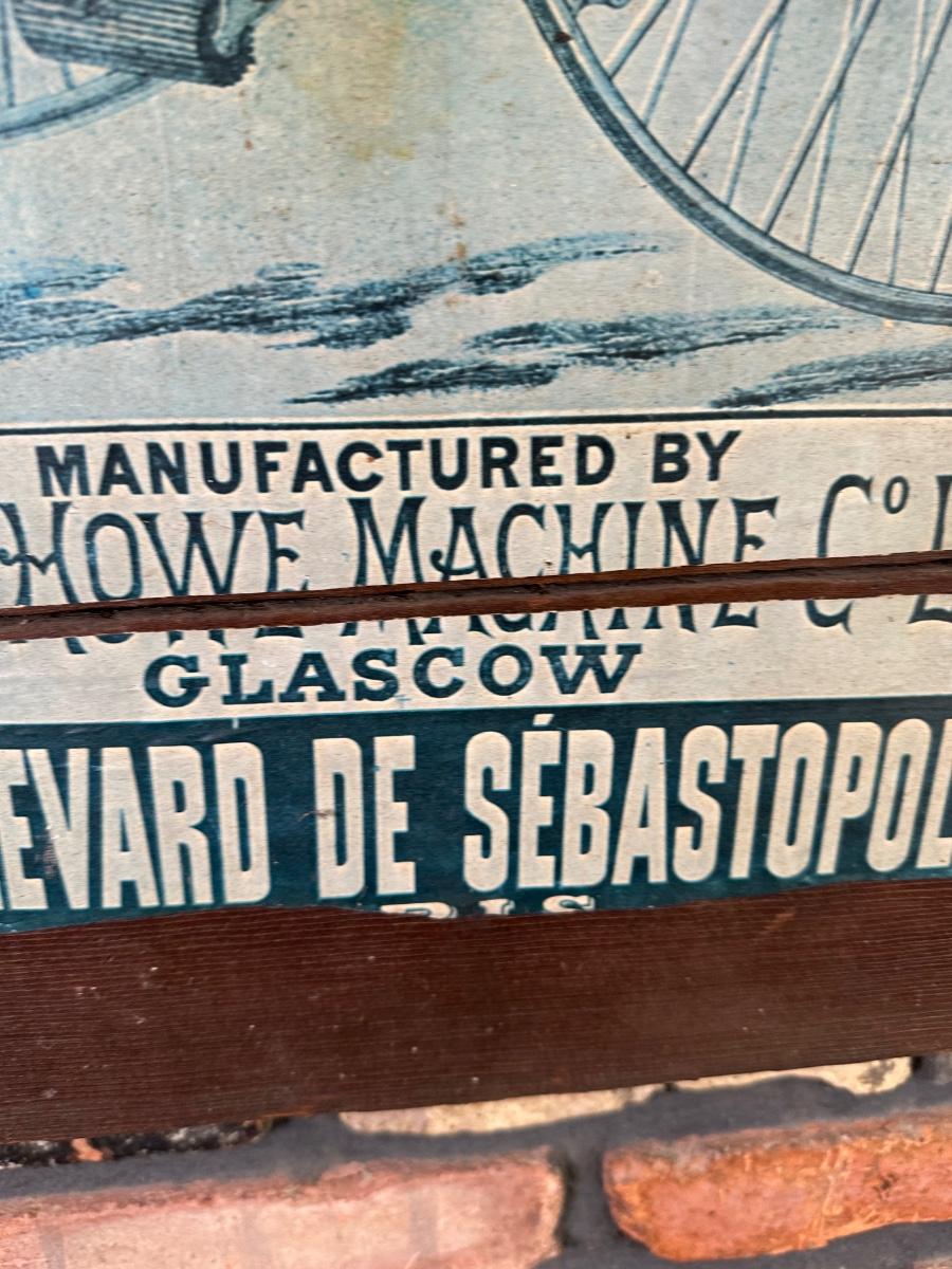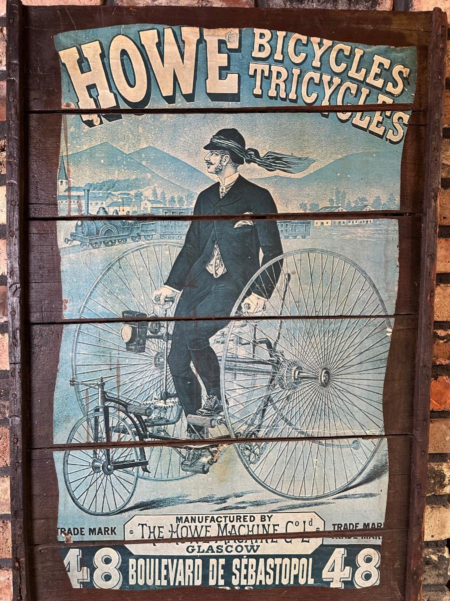 Original antique advertising sign for Howe Bicycles & Tricycles, produced by The Howe Machine Company. Features a classic penny-farthing bicycle illustration with period typography and French address “48 Boulevard de Sébastopol”, indicating late 19th-century European market advertising.