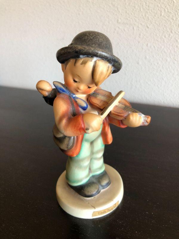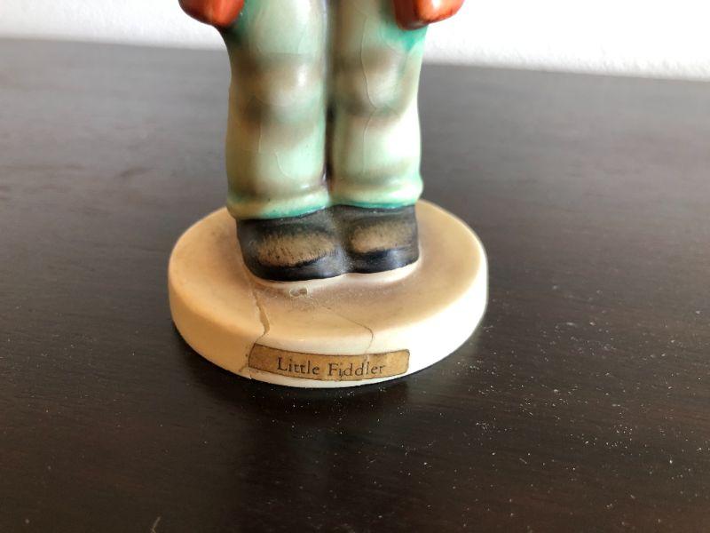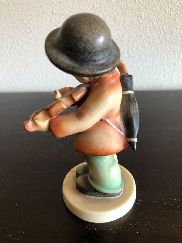 Adorable antique Hummel figurine of "The Fiddler" boy playing his fiddle/violin. Overall in good condition, though the base shows signs of a previous break and repair, and also some evidence of potential repair on the base of the hat.