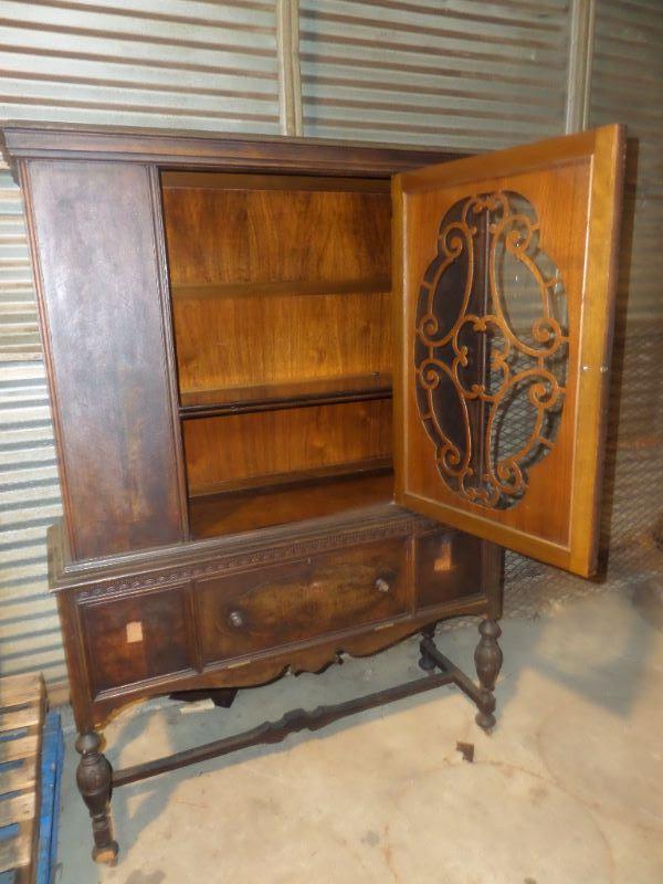 Dark Antique Finish Hutch, some veneer damage, and wood chip on base, otherwise sound. 38 x 19 x 35