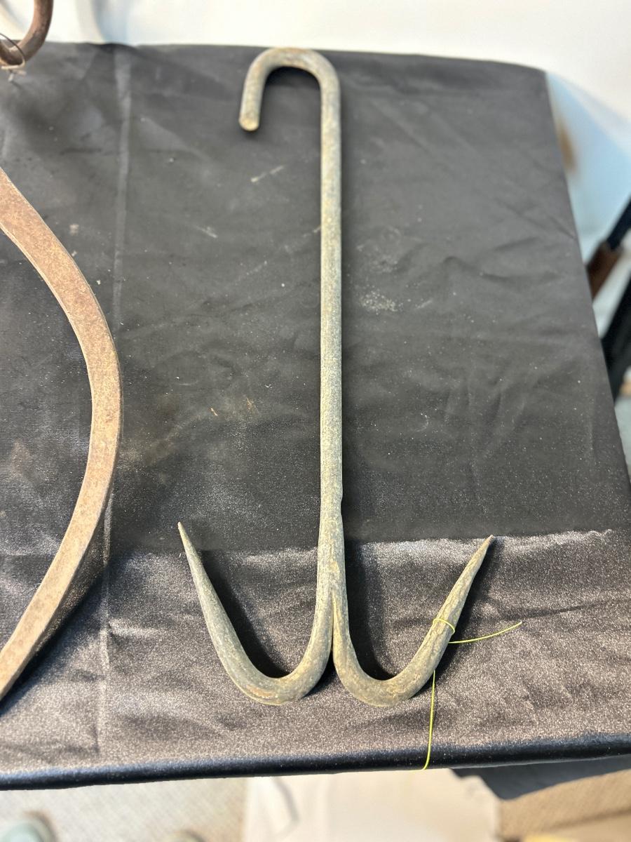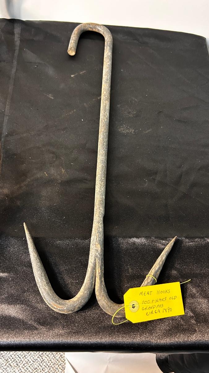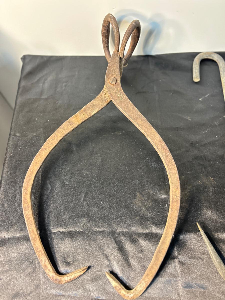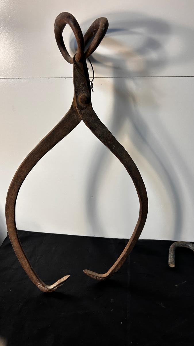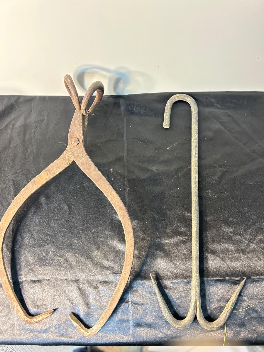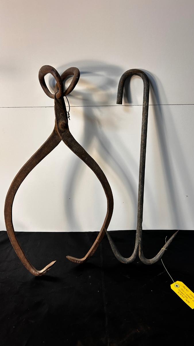 ANTIQUE ICE BLOCK, GRABBER, AND ANTIQUE MEAT HOOK