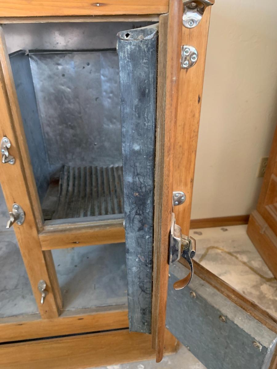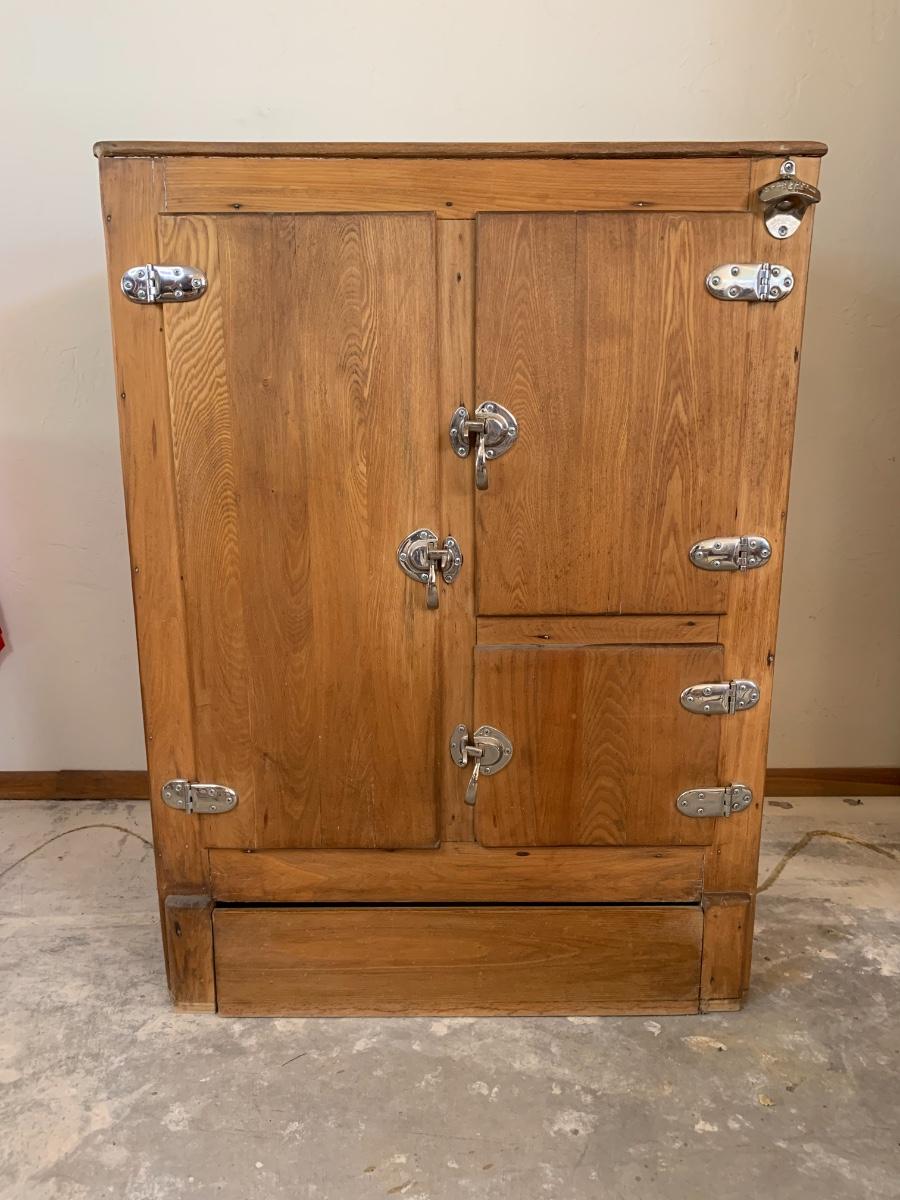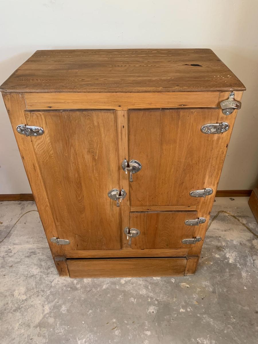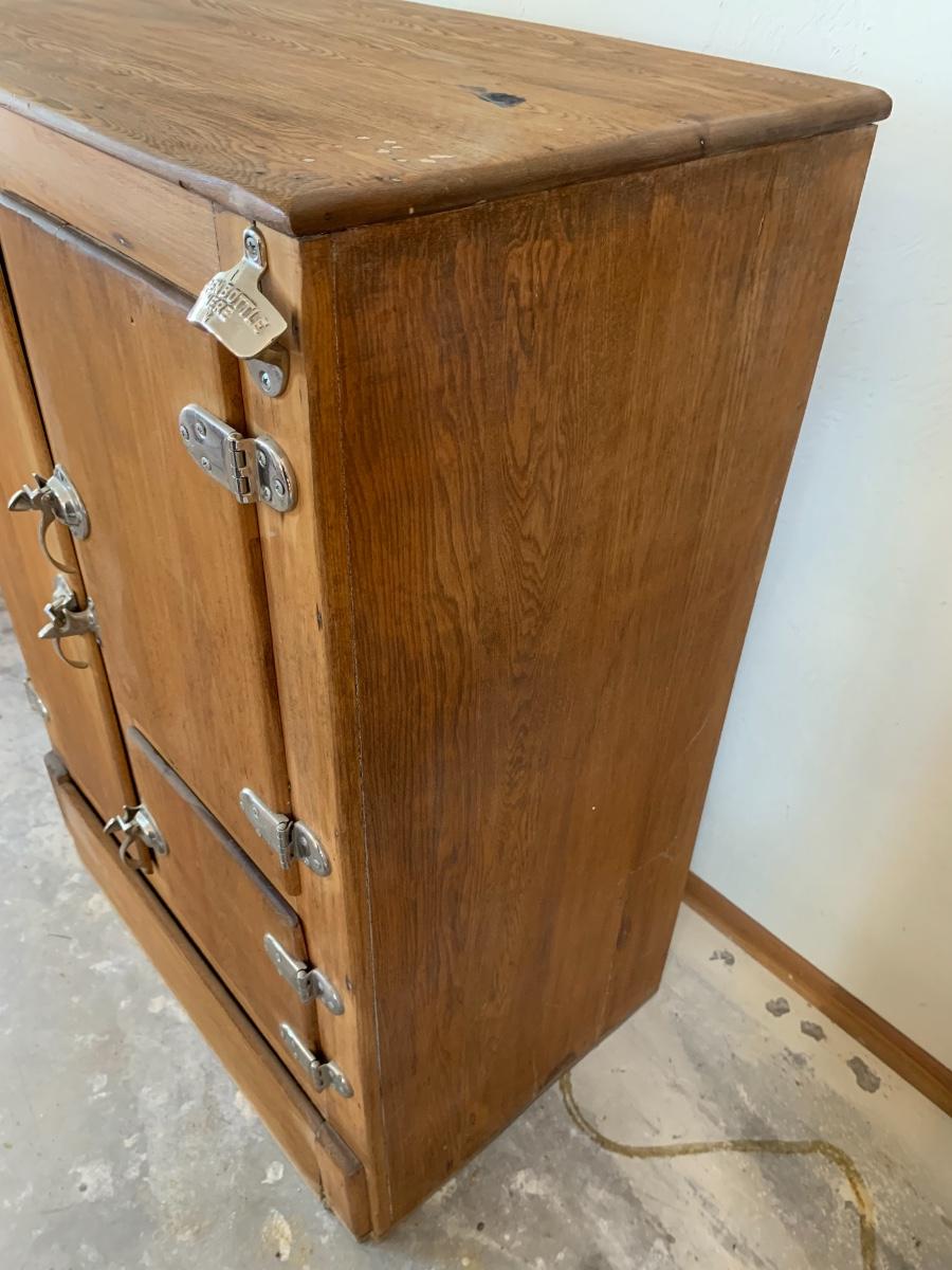Antique fridge ice box with chrome hardware and bottle opener and three compartments. One 3 inch burn mark on the top and some pitting that has been repaired.