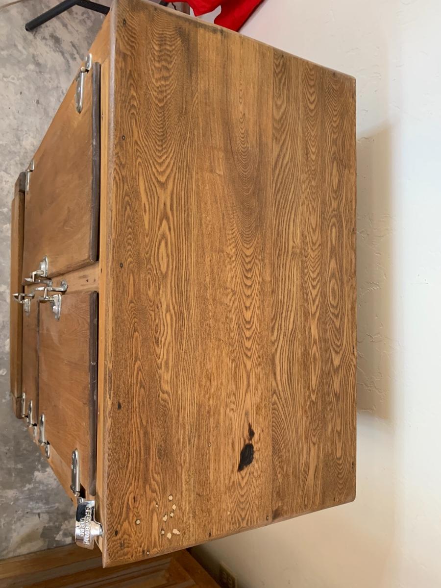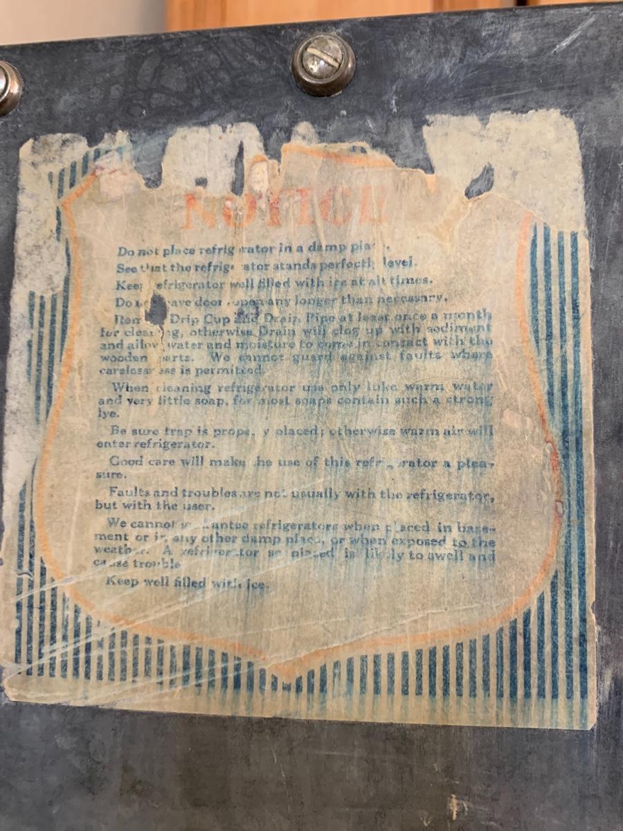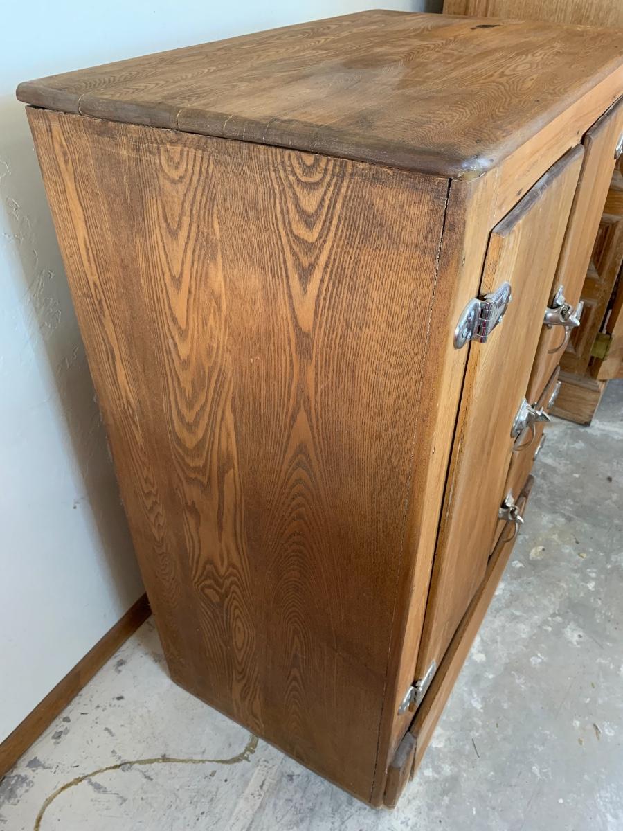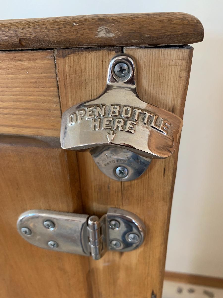 Antique fridge ice box with chrome hardware and bottle opener and three compartments. One 3 inch burn mark on the top and some pitting that has been repaired.