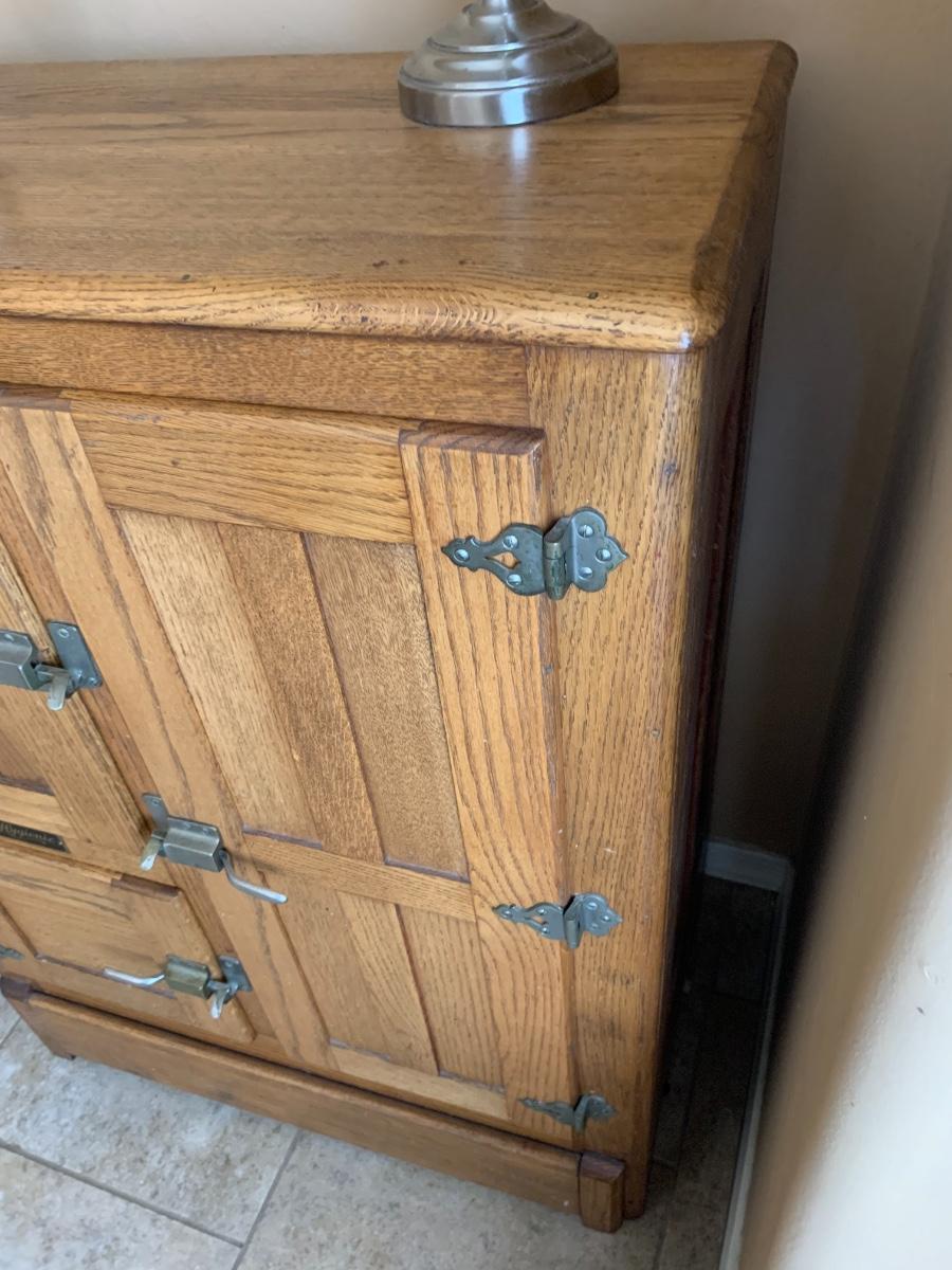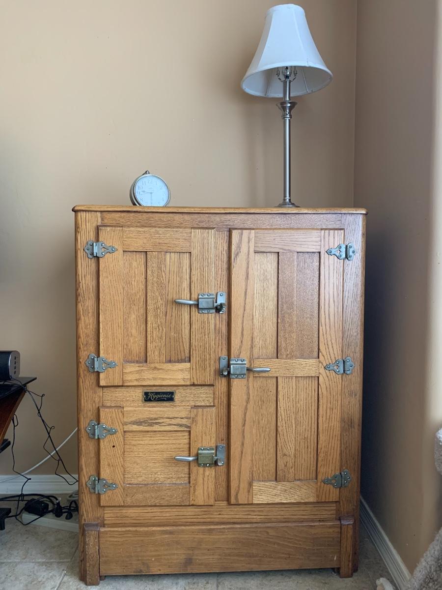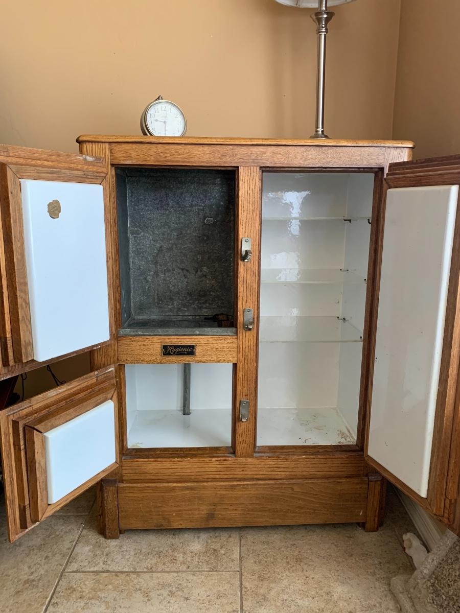 Antique ice box in good to great condition. Interior is very clean considering its age. By Hygienic. Has plexiglass shelves on the interior with white enamel. Includes lamp and clock in pictures. (34 inches in length, 18 inches in depth, 44 inches in height)