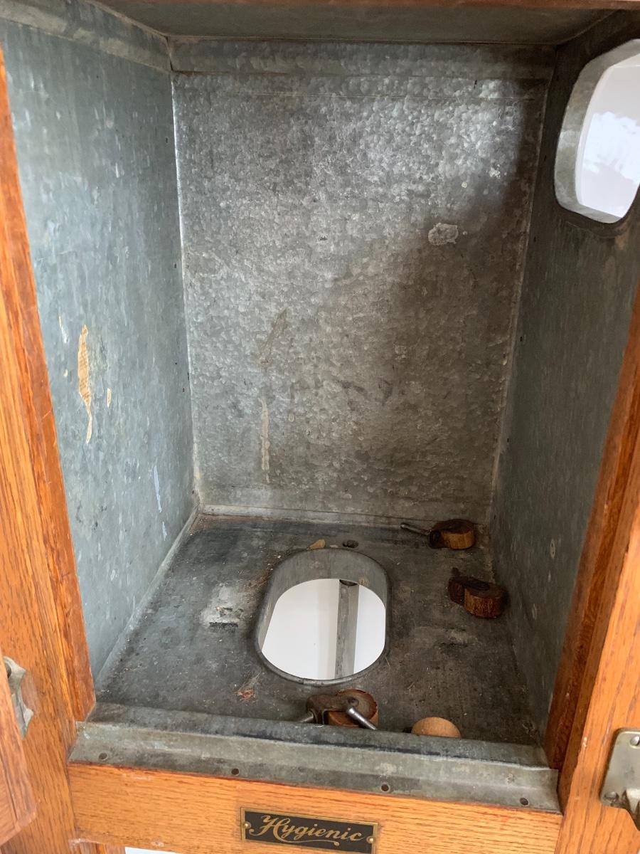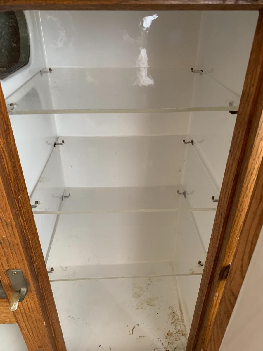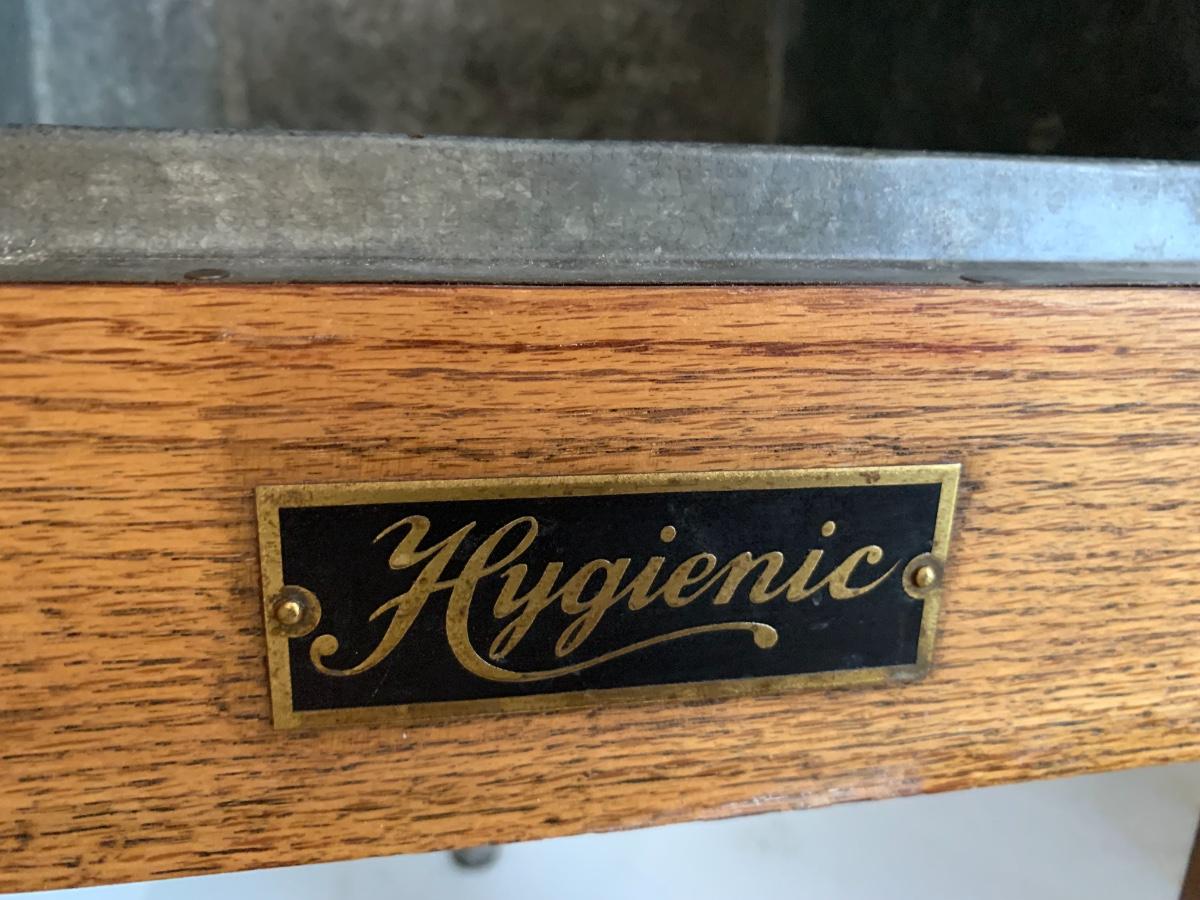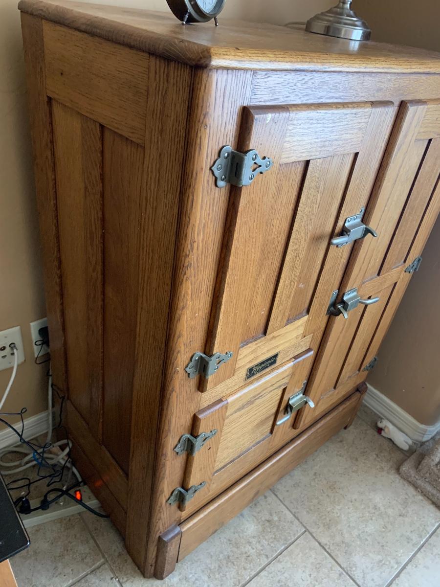 Antique ice box in good to great condition. Interior is very clean considering its age. By Hygienic. Has plexiglass shelves on the interior with white enamel. Includes lamp and clock in pictures. (34 inches in length, 18 inches in depth, 44 inches in height)