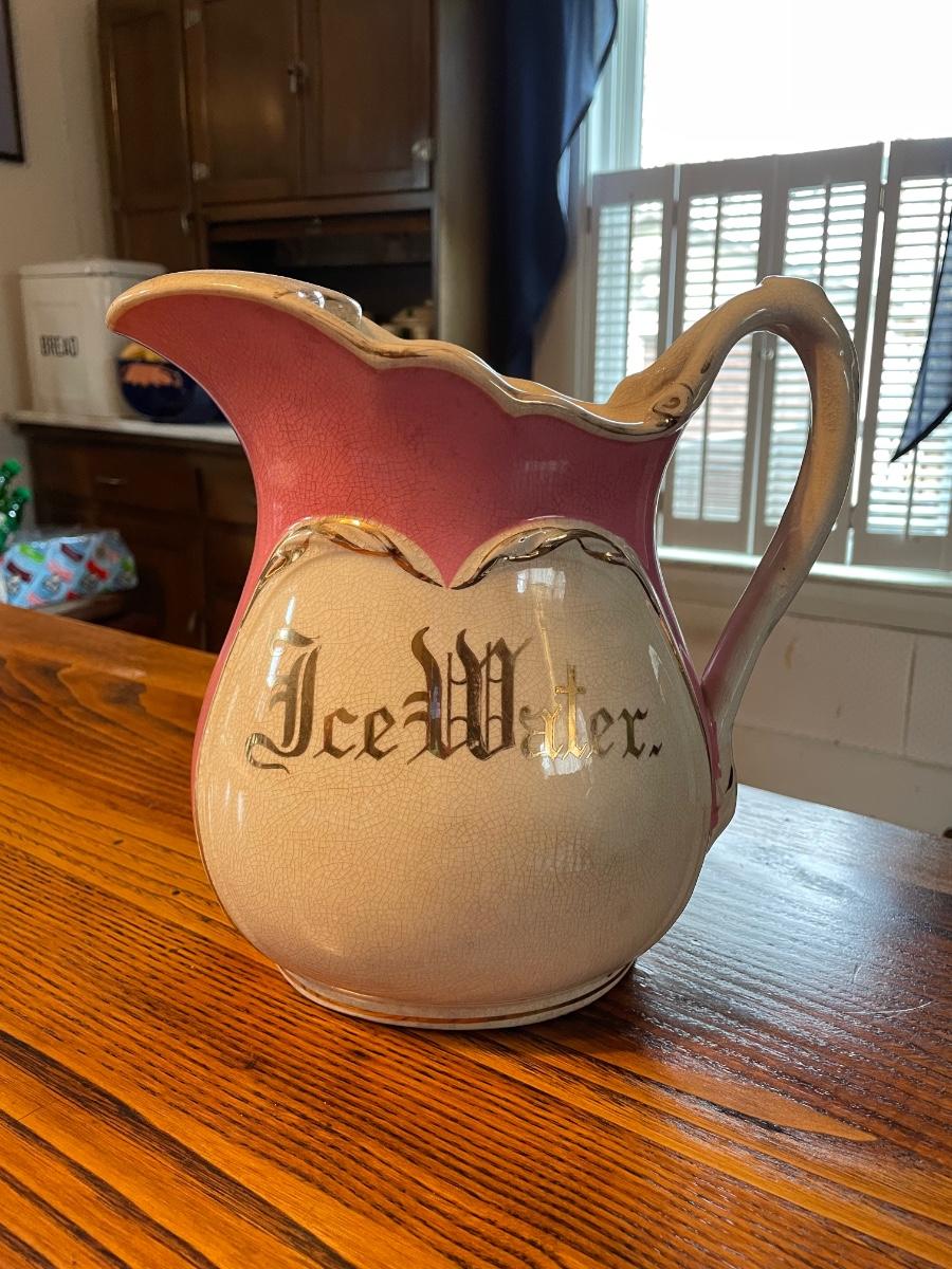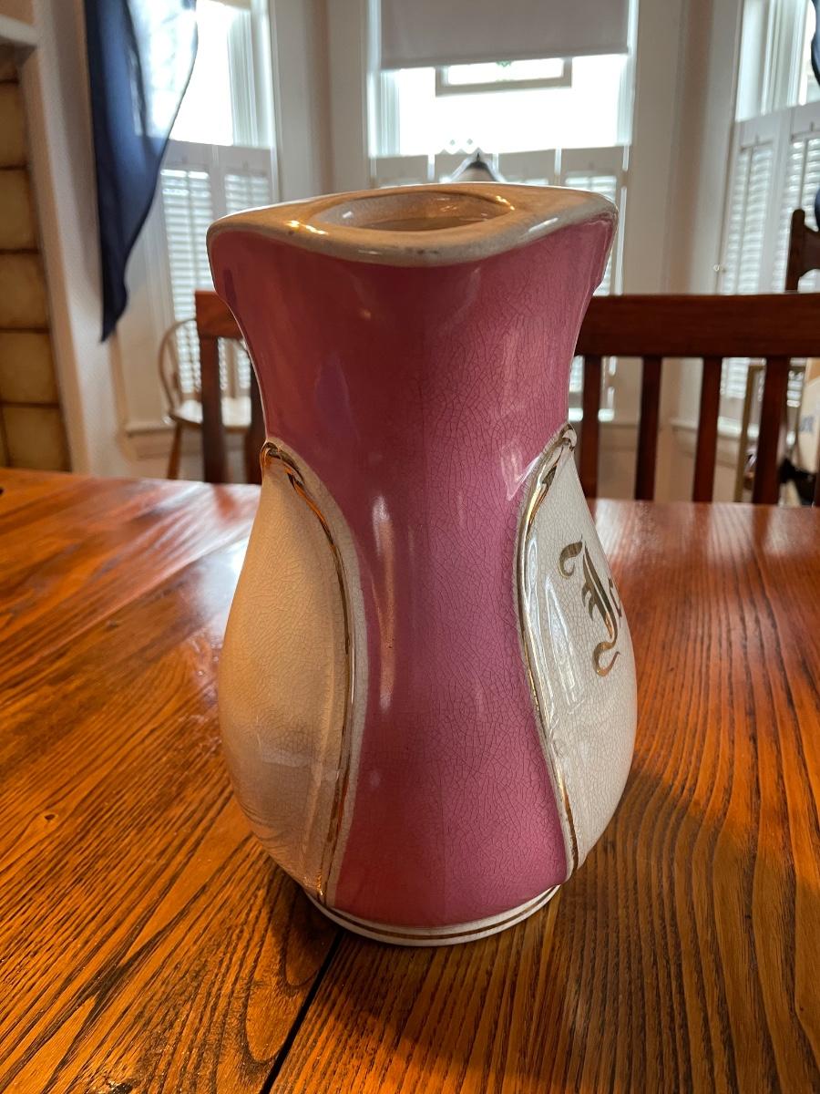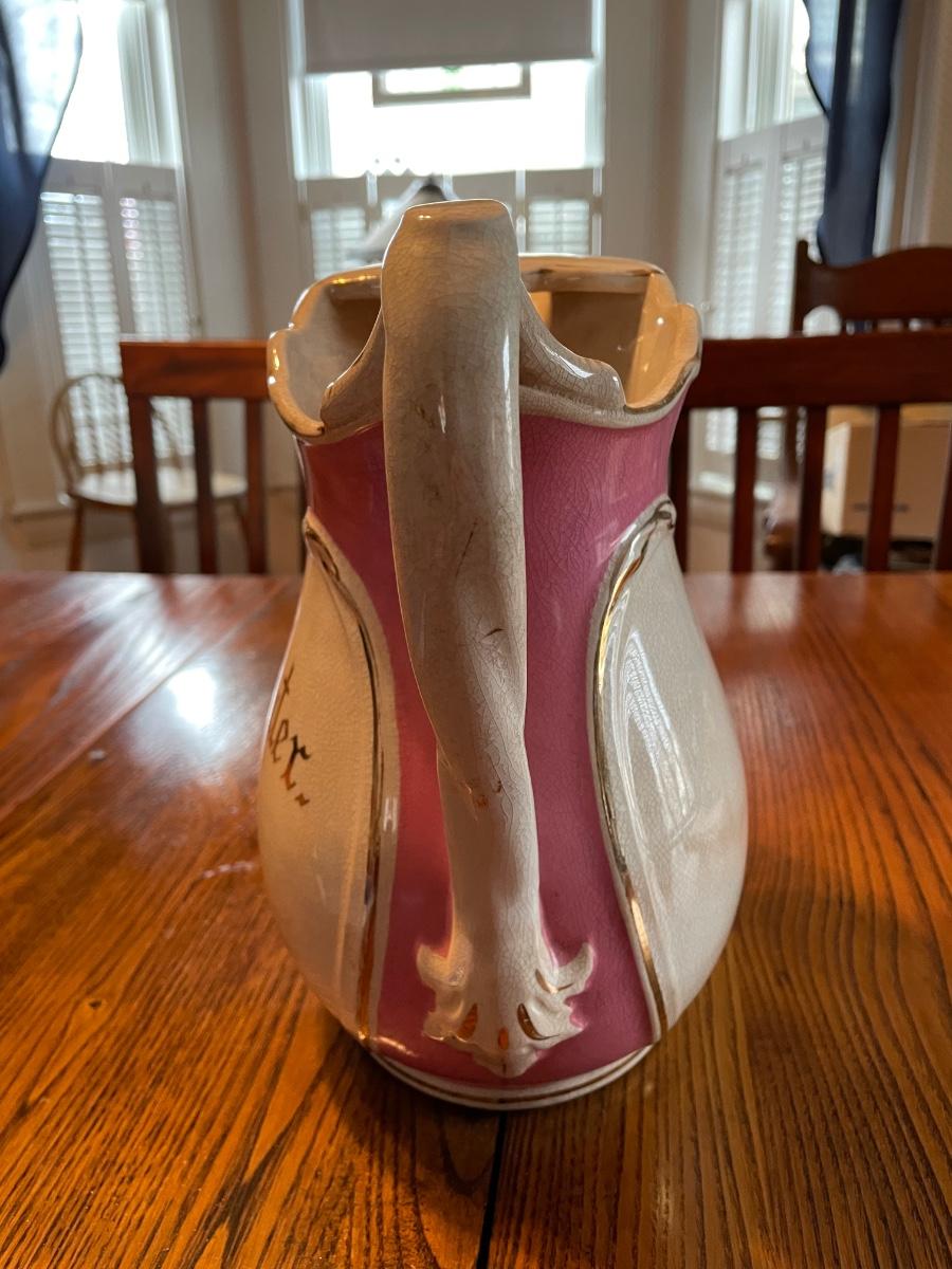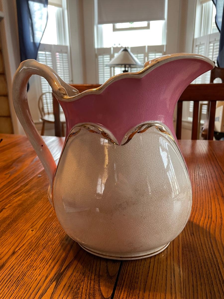 Beautiful antique pink and white Ice Water Pitcher, 9”. Crazing, paint wear.