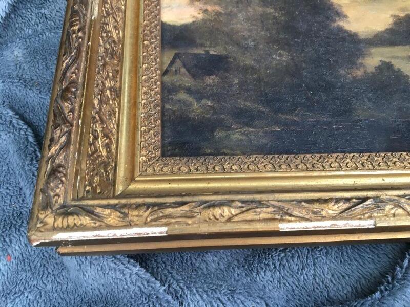Beautiful farm scene. Unknown artist. Good condition. Some loss to frame. Please see pictures. Overall measurements are 16” x 13”. Painting alone is 12”w x 9”h. Packaging and shipping services are available. Please contact us for a quote before bidding..