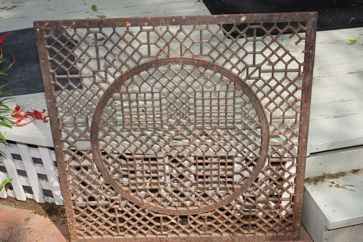 I have seen these floor grates make very interesting table tops. Just add a thick piece of glass and base from an older patio table and it a conversation and useful piece . Also is a very interesting back drop to a flower garden.