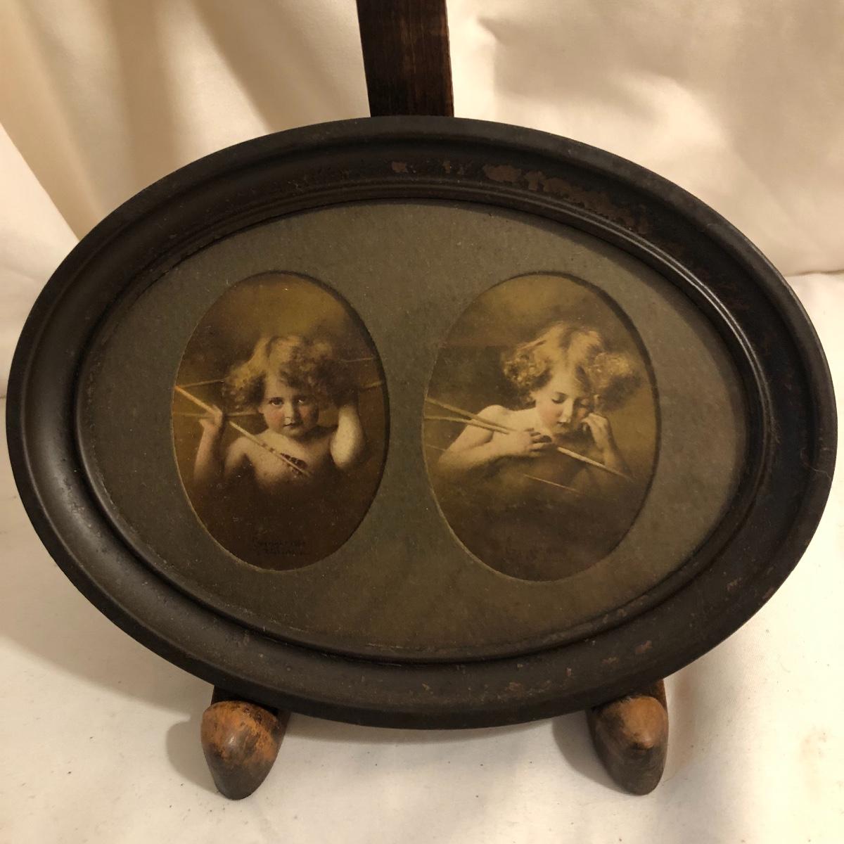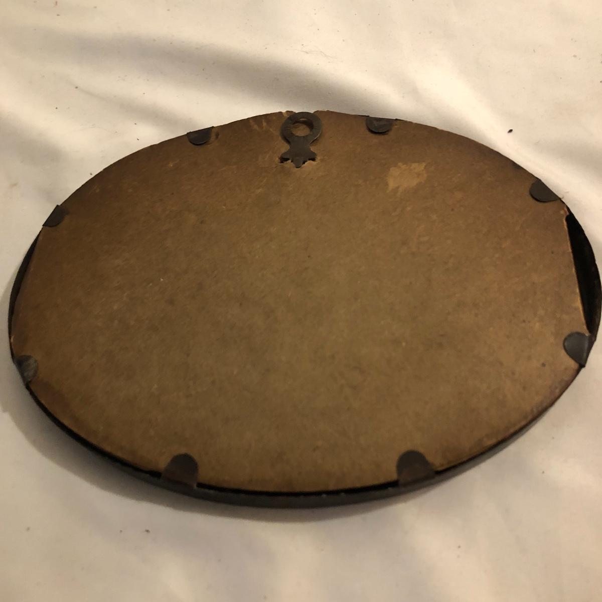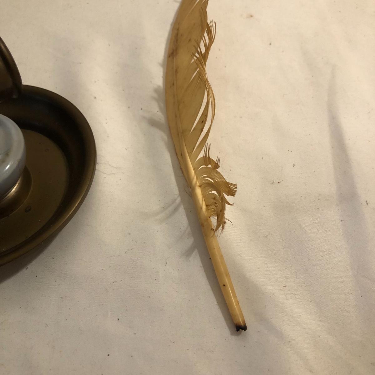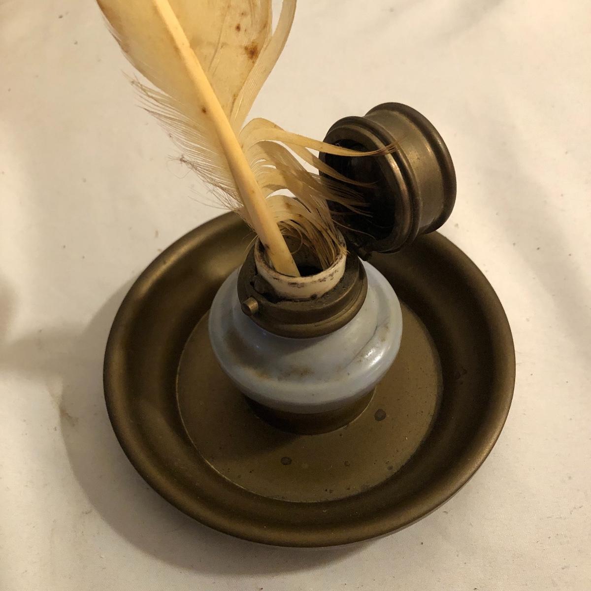 This lot includes an ink well with feather, oval wooden vintage frame and a book. The ink well is a brass like metal and glass. The lid opens yet doesn’t latch closed. The photo and frame measures 7.5” x 5.5”. Shipping Available.