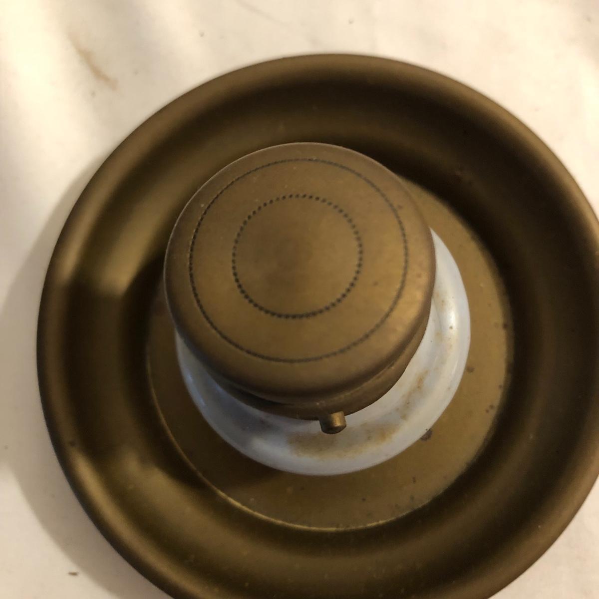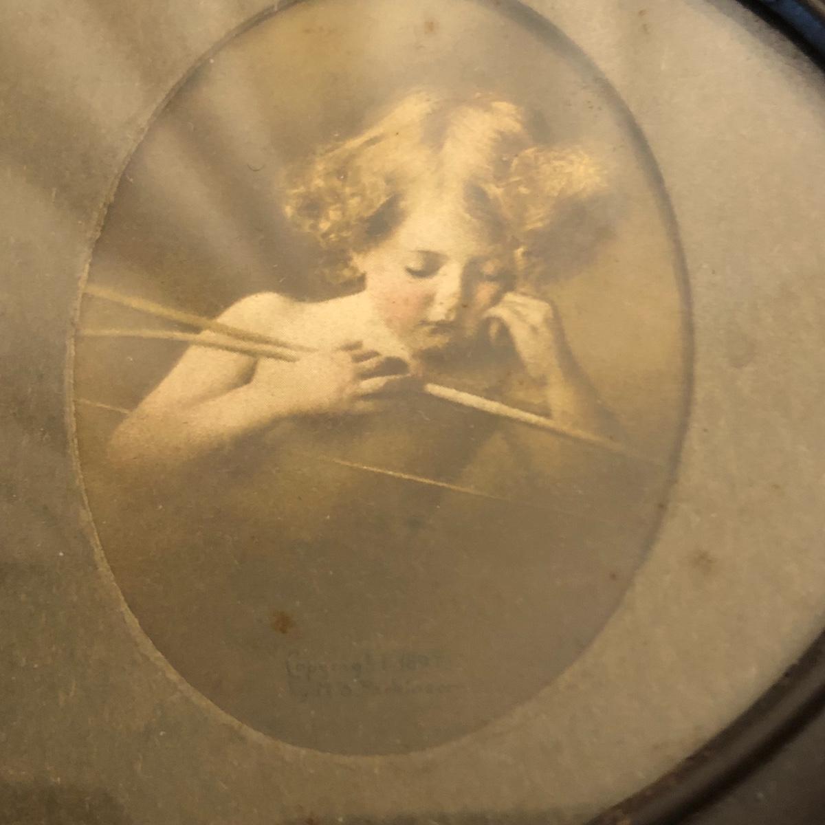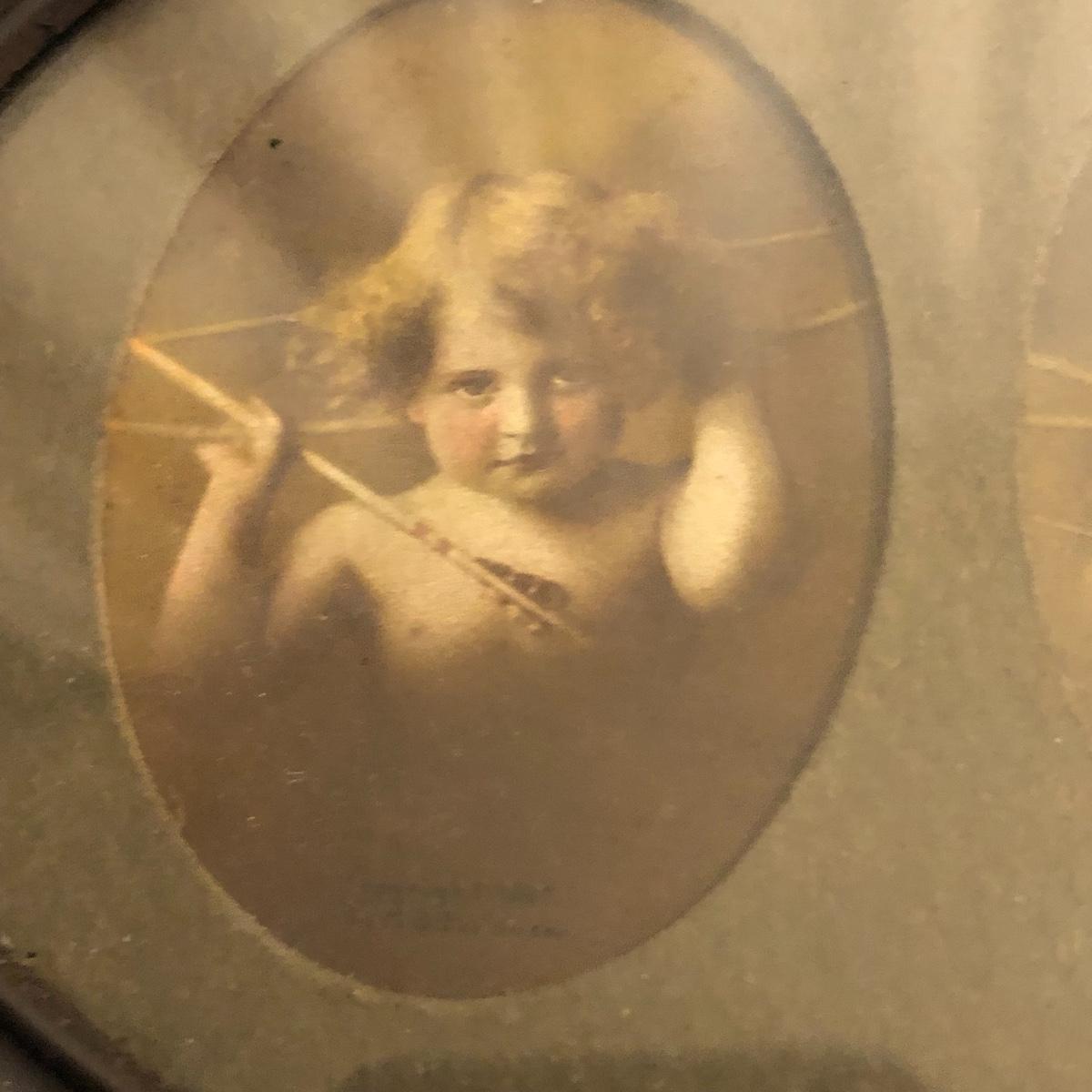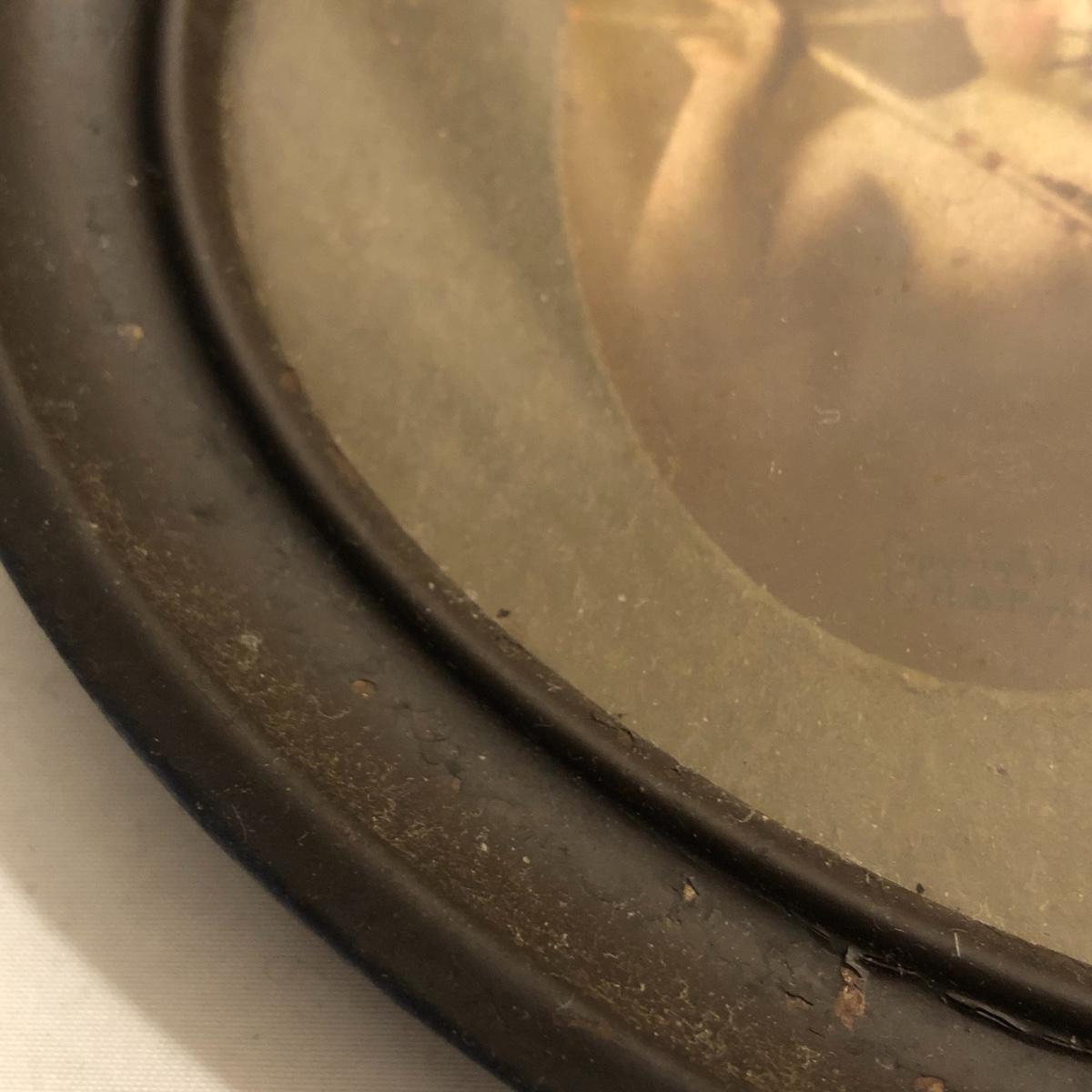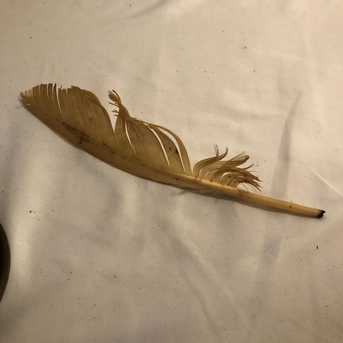 This lot includes an ink well with feather, oval wooden vintage frame and a book. The ink well is a brass like metal and glass. The lid opens yet doesn’t latch closed. The photo and frame measures 7.5” x 5.5”. Shipping Available.