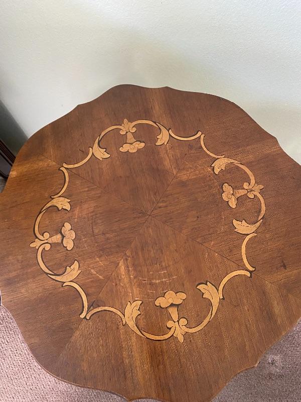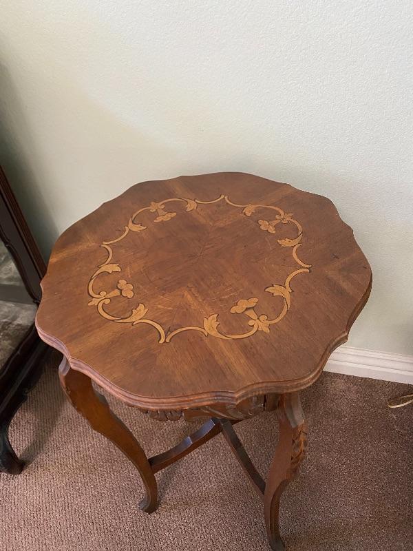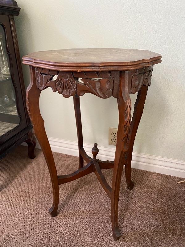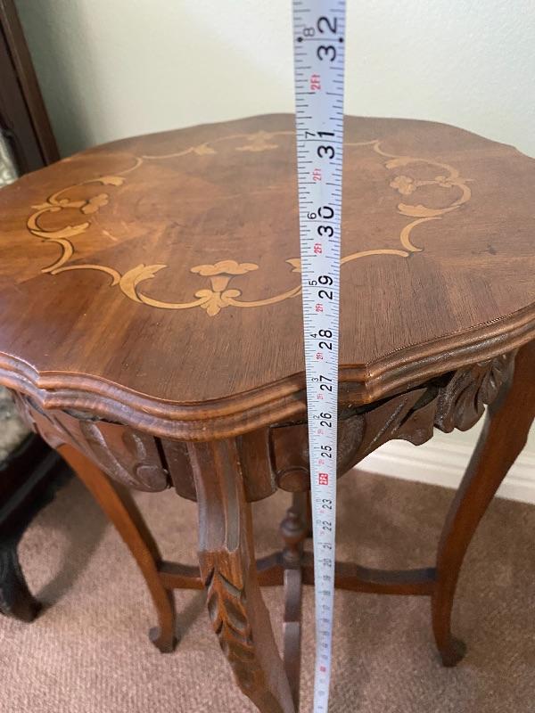 Antique wood side table. Medium finish wood with light finish floral inlaid pattern. Curved edges with carved details. Stands at about 27" tall and is about a 17" surface diameter. Light signs of age and wear. #24-10042
