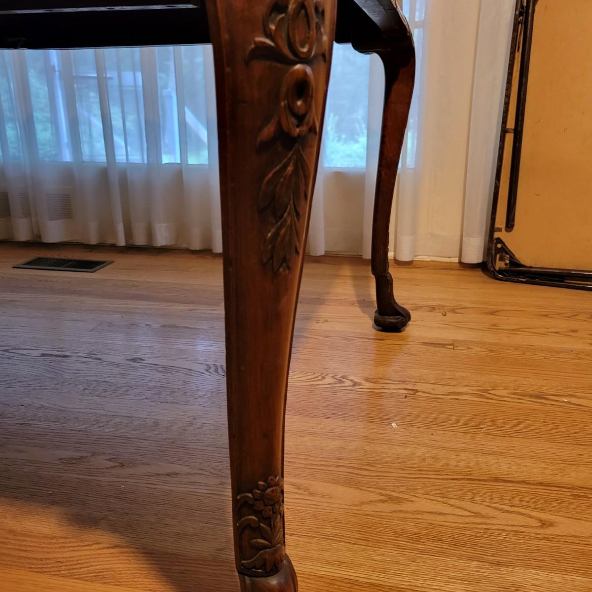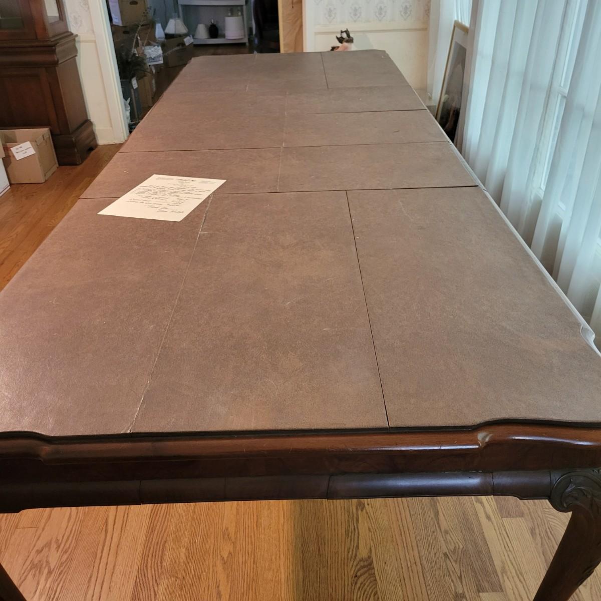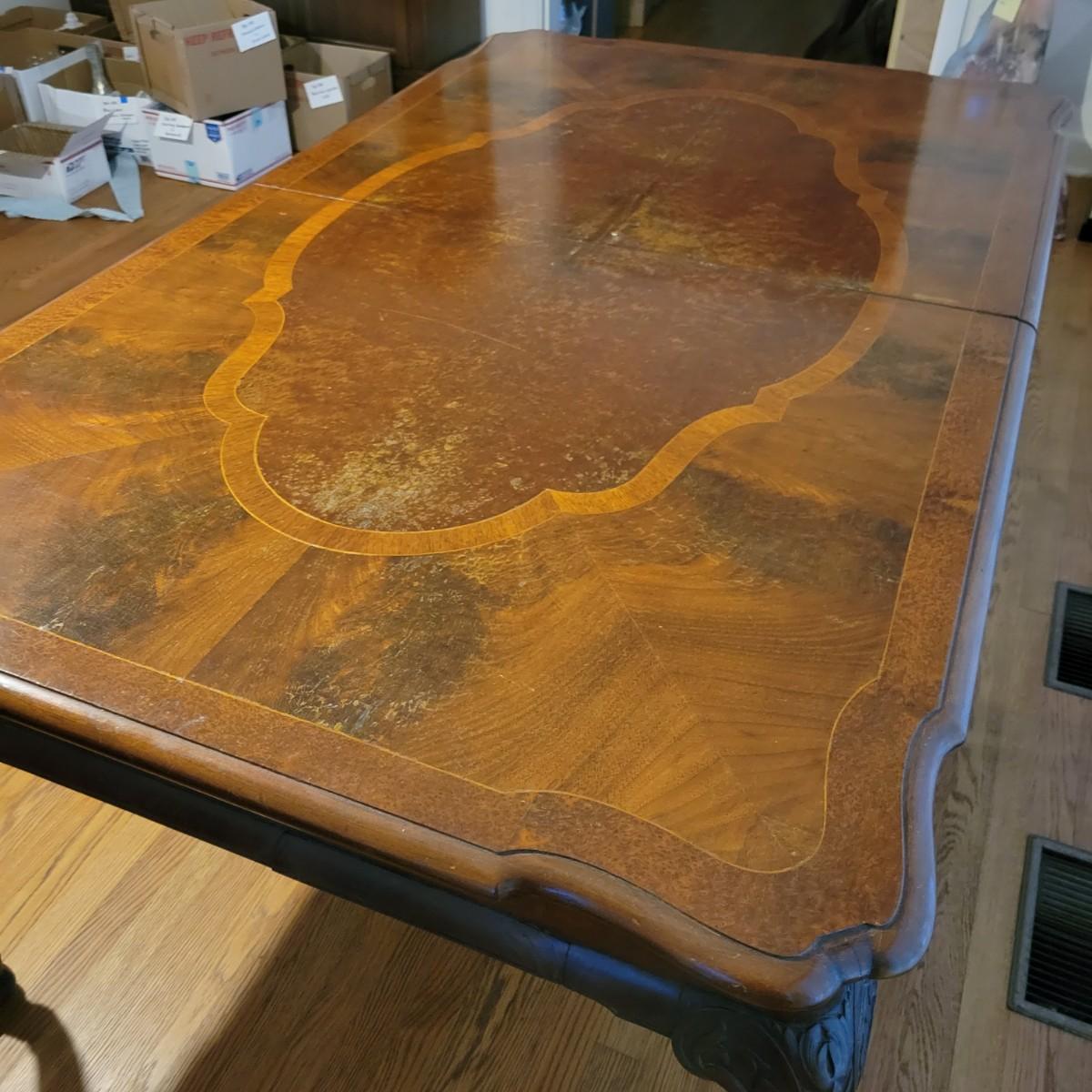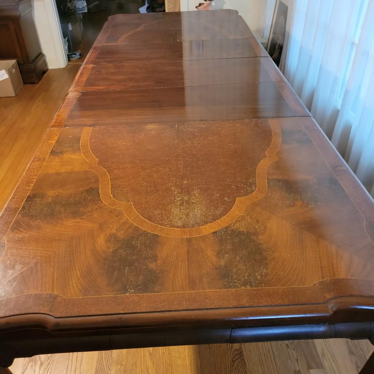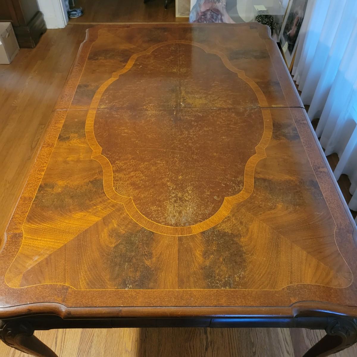 An antique, solid wood dining room table with an inlaid table top and veneered sides. Hand carved legs with beautiful detail and five 14.75" leaves to make an exceptionally long table. Five leaves also have a storage rack for convenience and protecting the leaves. This table is in good condition with some notable scratches, pits and bubbling veneer, but is still functional and beautiful. See attached pictures for more detail. Without leaves, table measures approximately 70" x 42" x 30". All five leaves would increase its length to approximately 144". Also included is a multi-piece custom table cover for protection. Crate for leafs measures approximately 23.5" x 17" x 46" Local pickup only. **The winning bidder will need to bring help to move this table from the ground floor of the house, as the item is substantial. Please make sure you bring a truck/trailer large enough to fit the long table.**