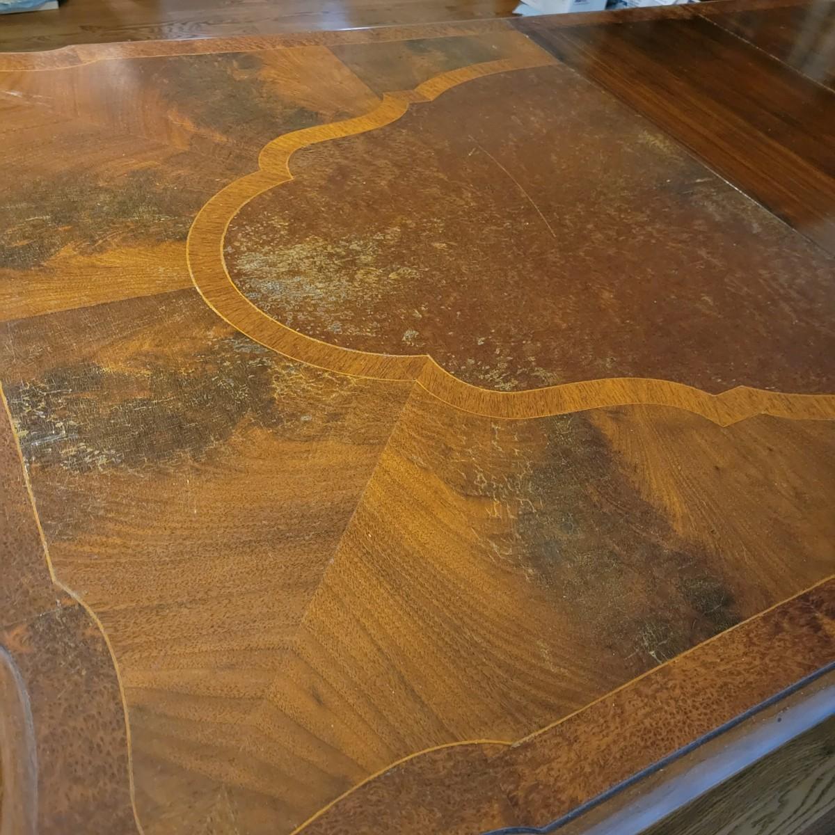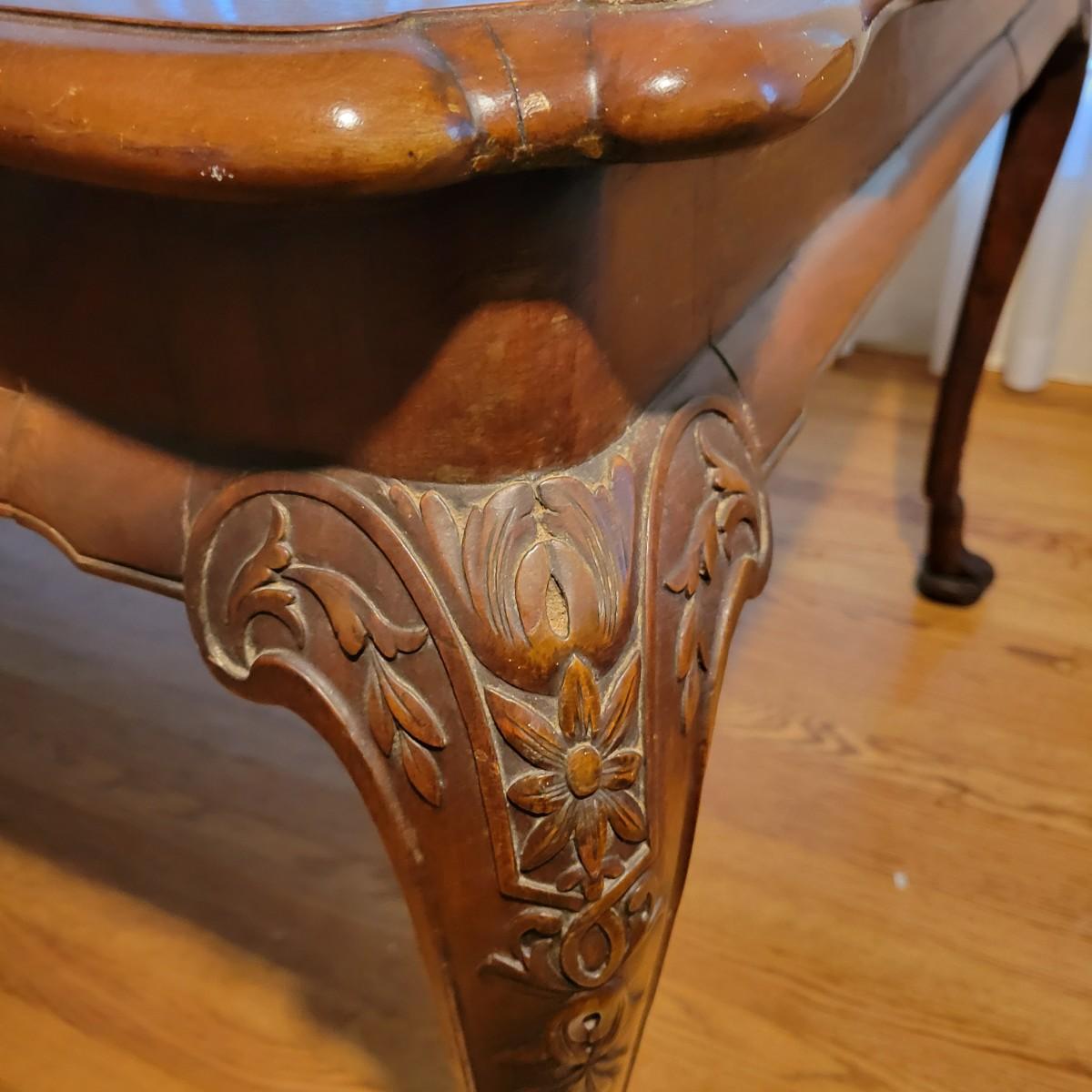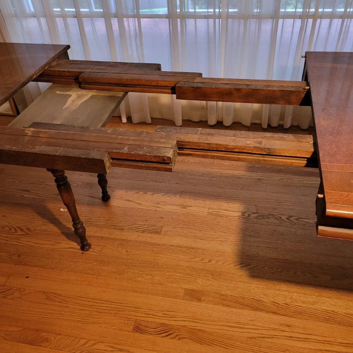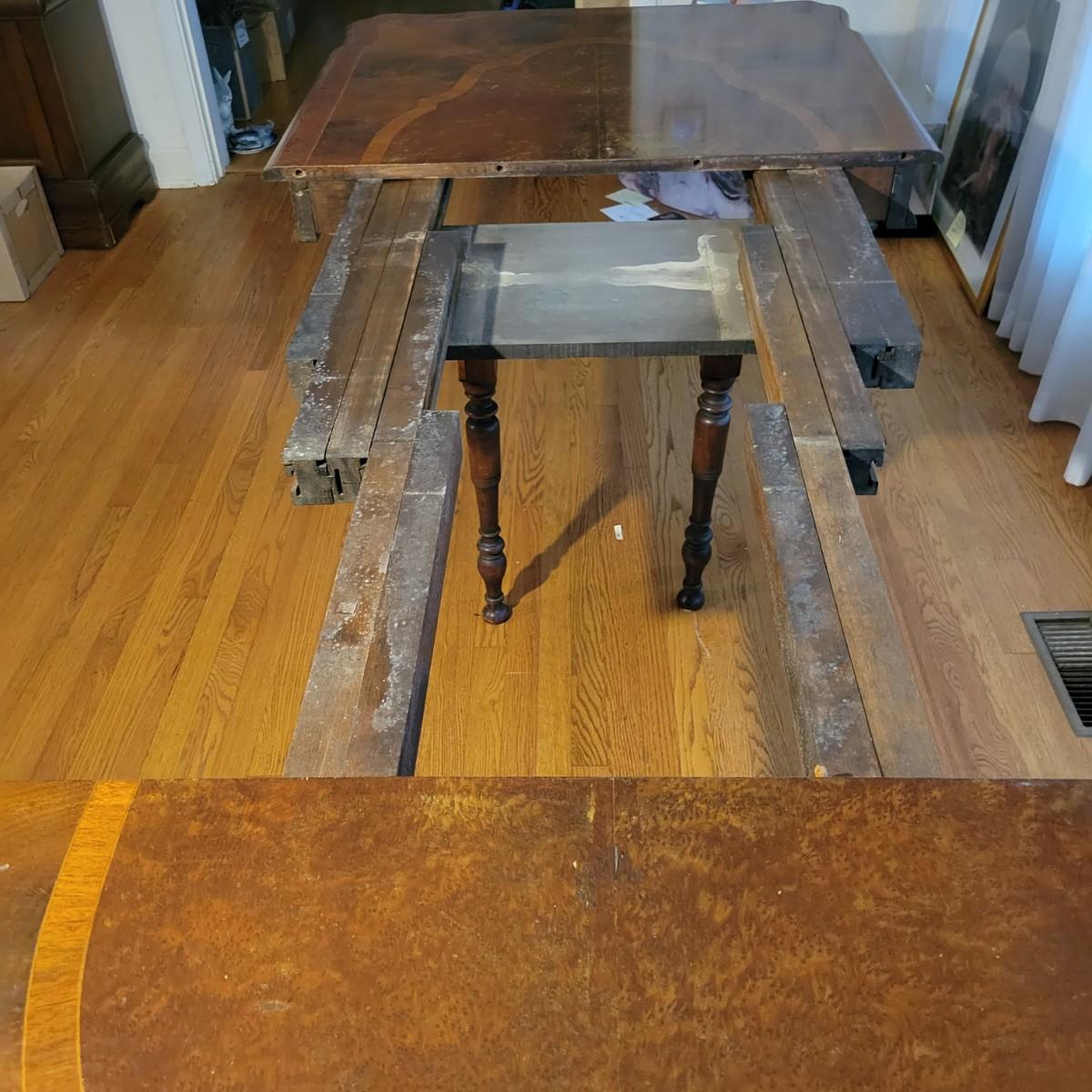 An antique, solid wood dining room table with an inlaid table top and veneered sides. Hand carved legs with beautiful detail and five 14.75" leaves to make an exceptionally long table. Five leaves also have a storage rack for convenience and protecting the leaves. This table is in good condition with some notable scratches, pits and bubbling veneer, but is still functional and beautiful. See attached pictures for more detail. Without leaves, table measures approximately 70" x 42" x 30". All five leaves would increase its length to approximately 144". Also included is a multi-piece custom table cover for protection. Crate for leafs measures approximately 23.5" x 17" x 46" Local pickup only. **The winning bidder will need to bring help to move this table from the ground floor of the house, as the item is substantial. Please make sure you bring a truck/trailer large enough to fit the long table.**