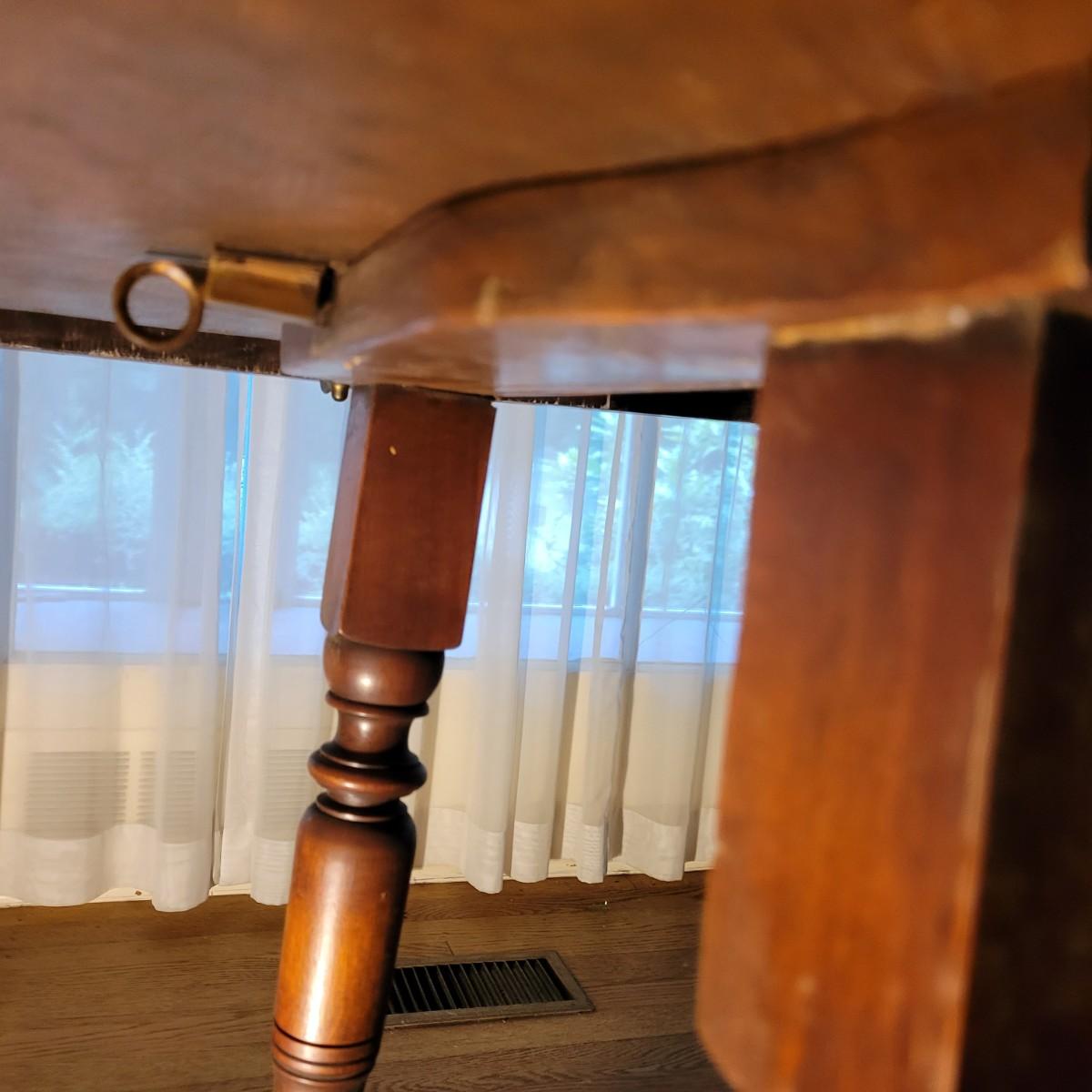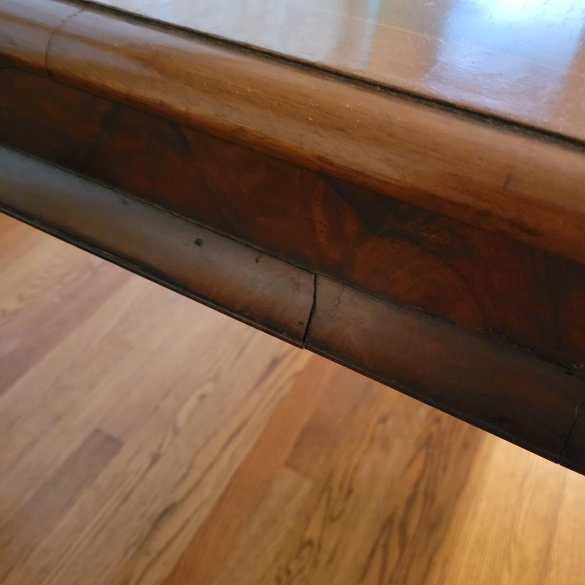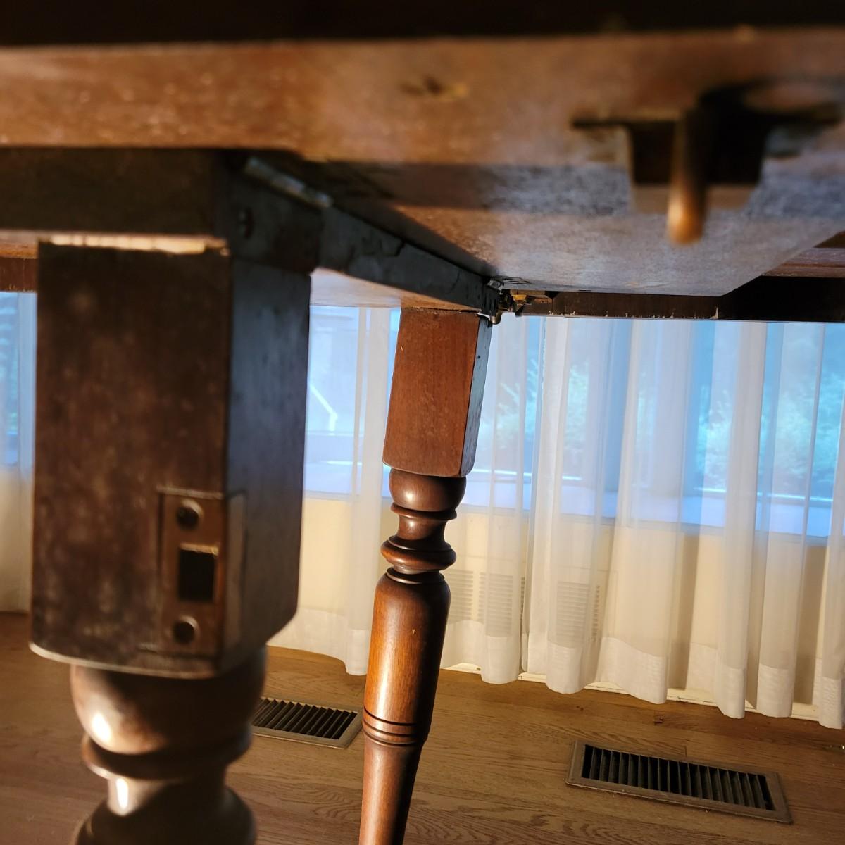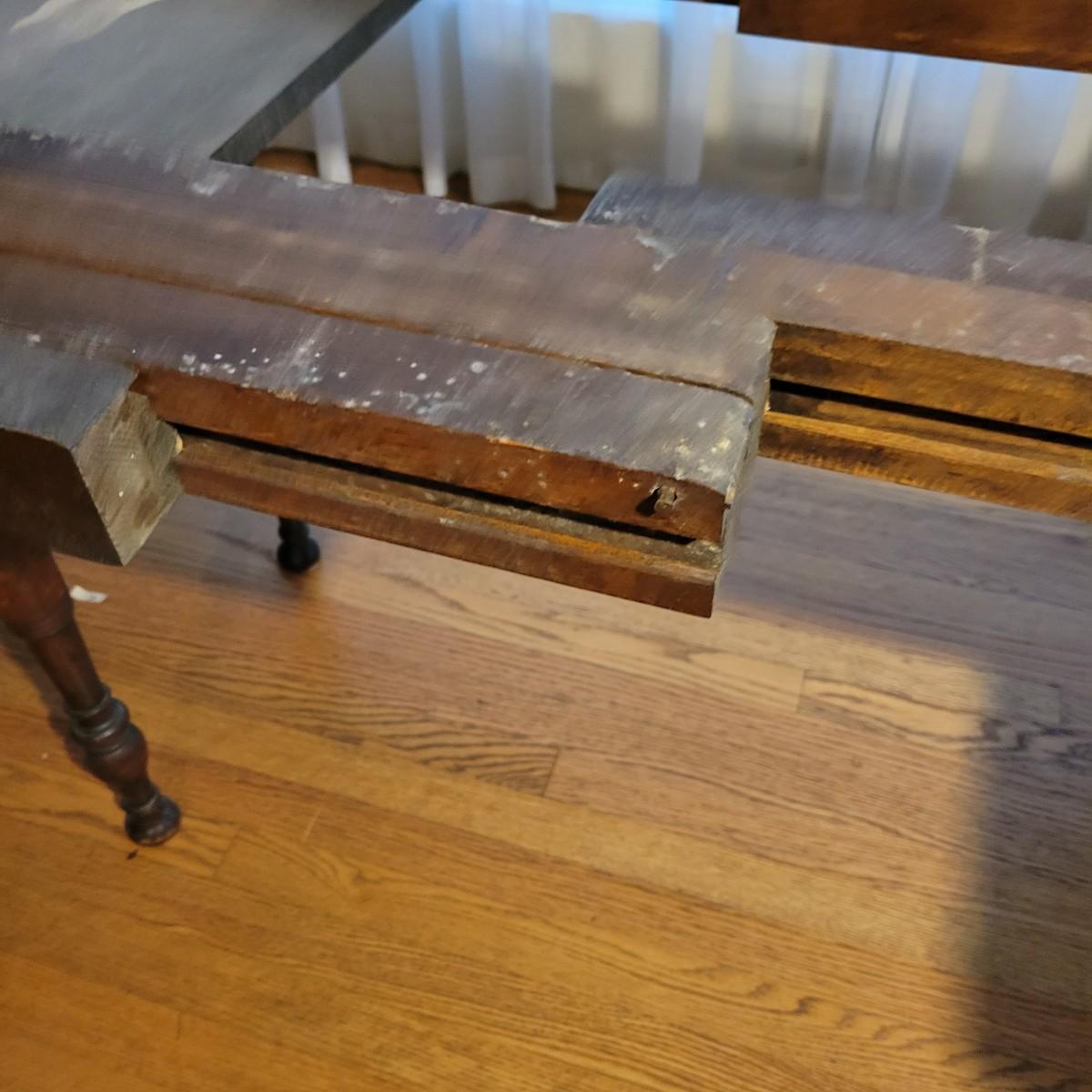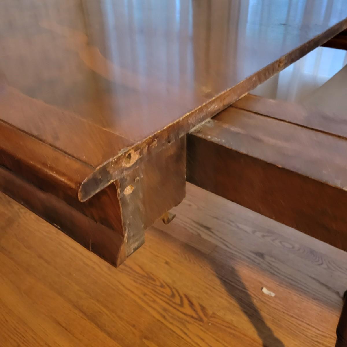An antique, solid wood dining room table with an inlaid table top and veneered sides. Hand carved legs with beautiful detail and five 14.75" leaves to make an exceptionally long table. Five leaves also have a storage rack for convenience and protecting the leaves. This table is in good condition with some notable scratches, pits and bubbling veneer, but is still functional and beautiful. See attached pictures for more detail. Without leaves, table measures approximately 70" x 42" x 30". All five leaves would increase its length to approximately 144". Also included is a multi-piece custom table cover for protection. Crate for leafs measures approximately 23.5" x 17" x 46" Local pickup only. **The winning bidder will need to bring help to move this table from the ground floor of the house, as the item is substantial. Please make sure you bring a truck/trailer large enough to fit the long table.**