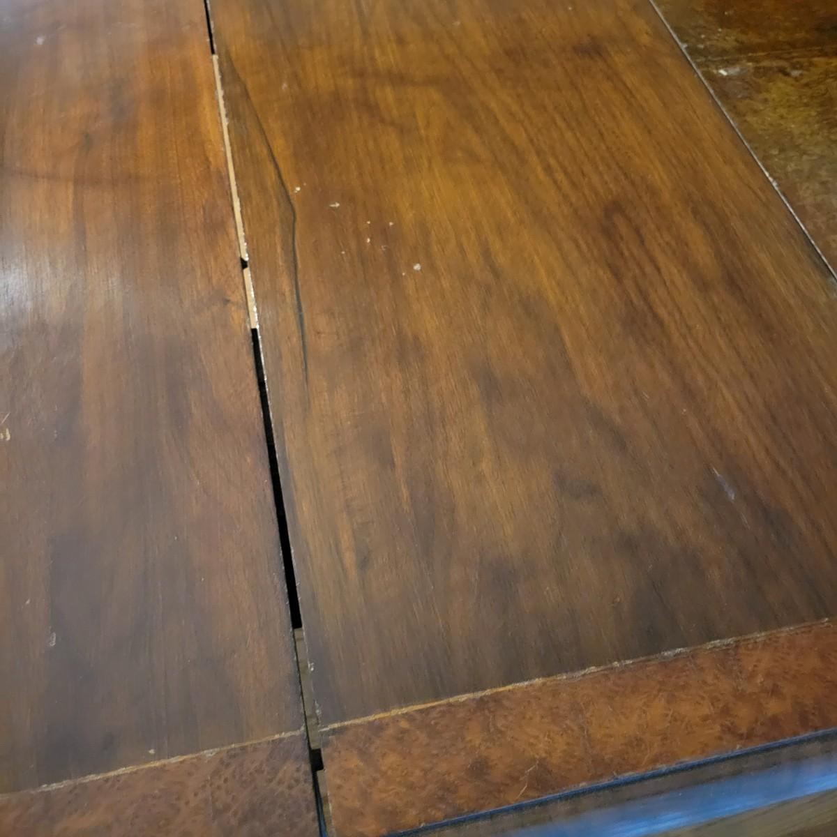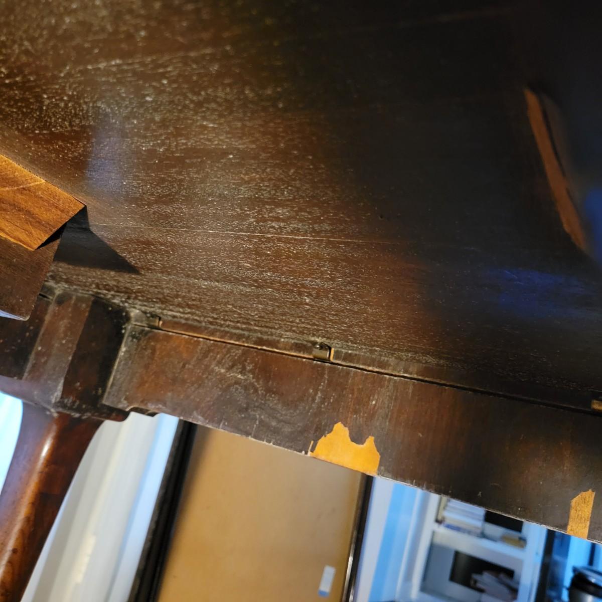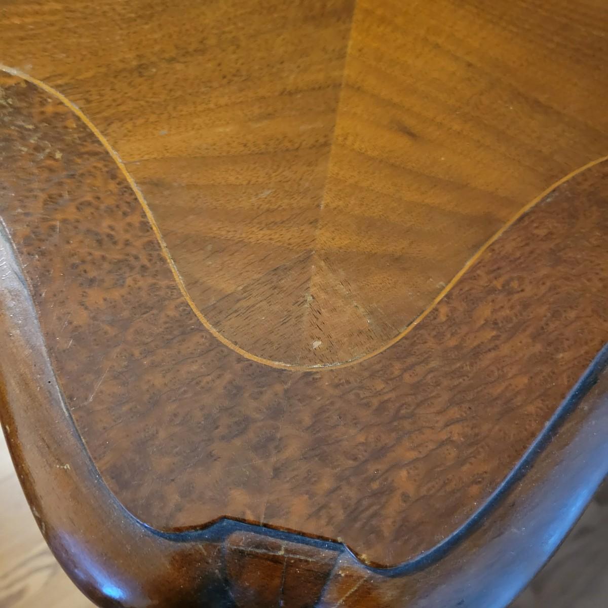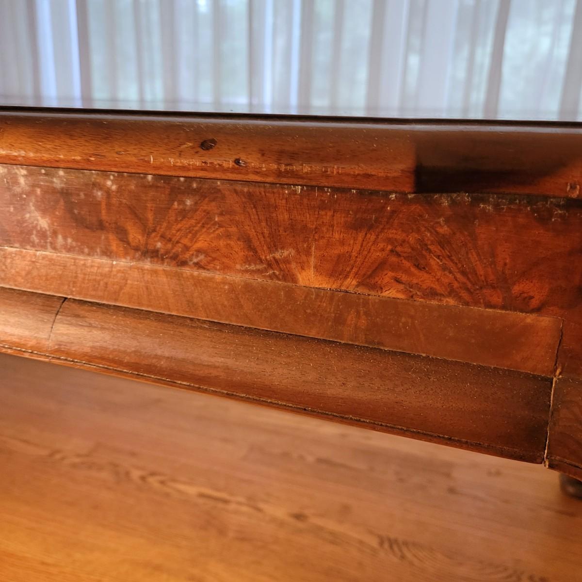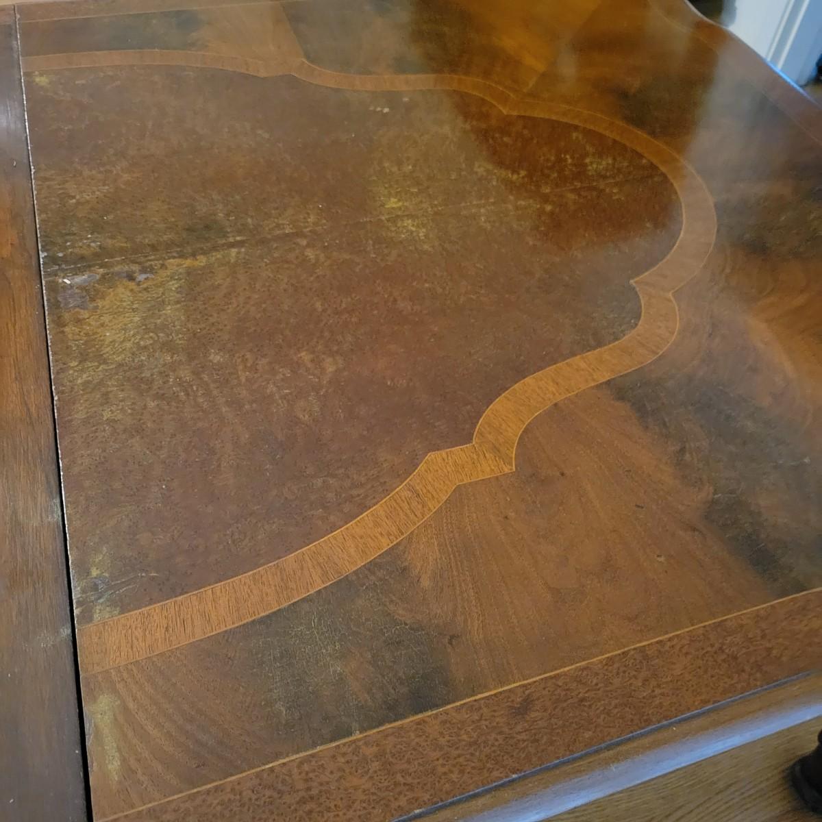 An antique, solid wood dining room table with an inlaid table top and veneered sides. Hand carved legs with beautiful detail and five 14.75" leaves to make an exceptionally long table. Five leaves also have a storage rack for convenience and protecting the leaves. This table is in good condition with some notable scratches, pits and bubbling veneer, but is still functional and beautiful. See attached pictures for more detail. Without leaves, table measures approximately 70" x 42" x 30". All five leaves would increase its length to approximately 144". Also included is a multi-piece custom table cover for protection. Crate for leafs measures approximately 23.5" x 17" x 46" Local pickup only. **The winning bidder will need to bring help to move this table from the ground floor of the house, as the item is substantial. Please make sure you bring a truck/trailer large enough to fit the long table.**